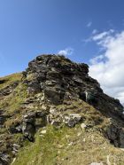 Kleine Kraxelei vor dem Gipfel. Steile Grashänge sind trocken.