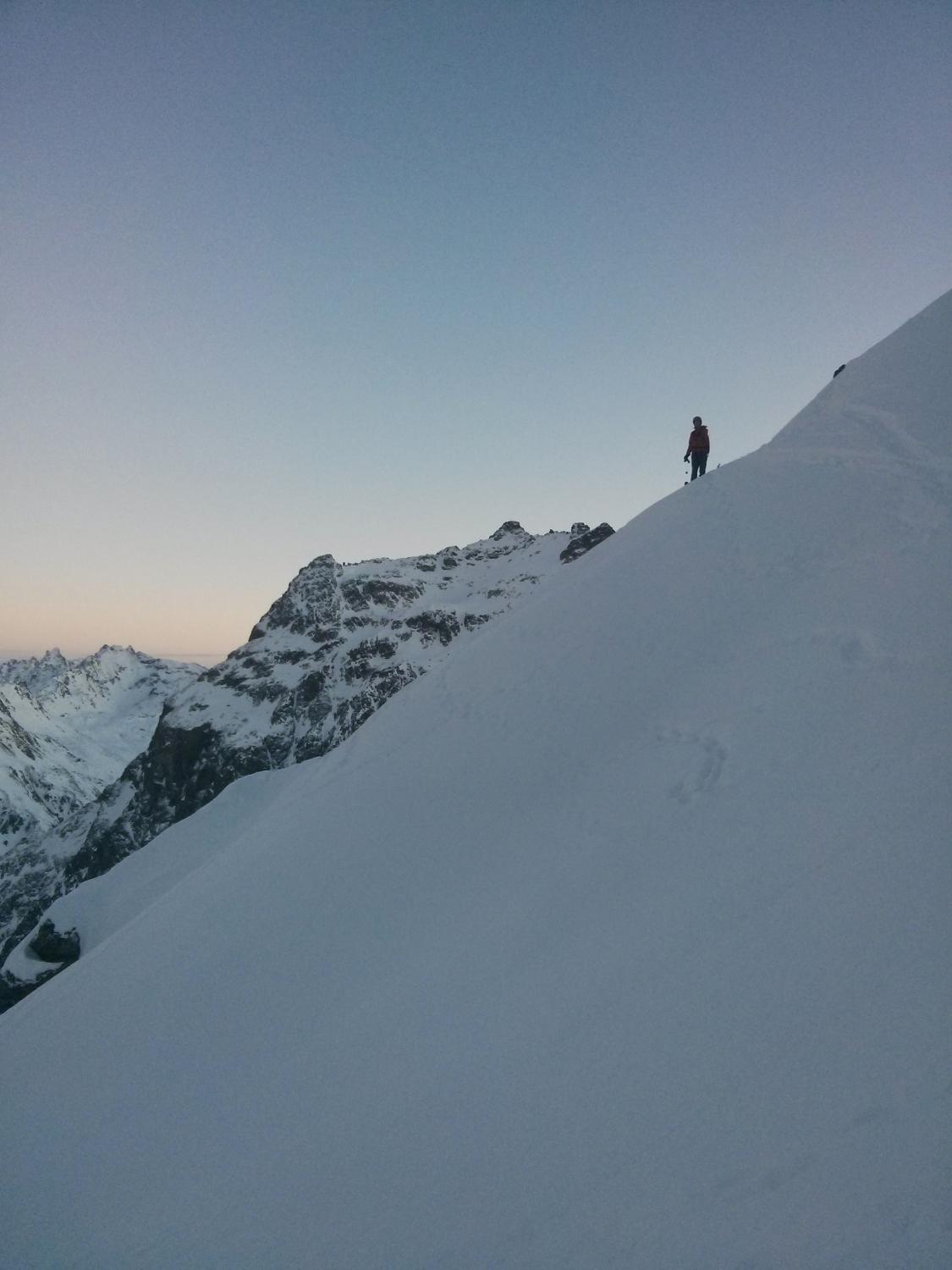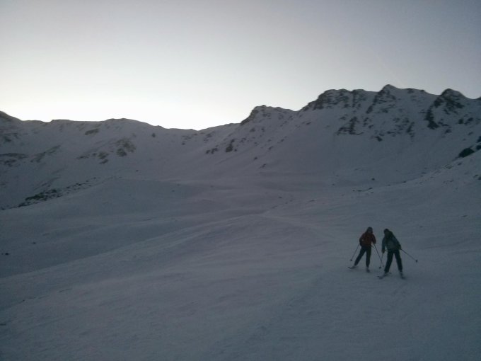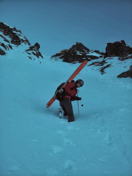 Wir sind in die südlichere der beiden Rinnen aufgeseteigen und über den nördlichen (Schnee etwas weicher) weider abgefahren (siehe Fotos)