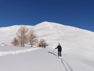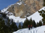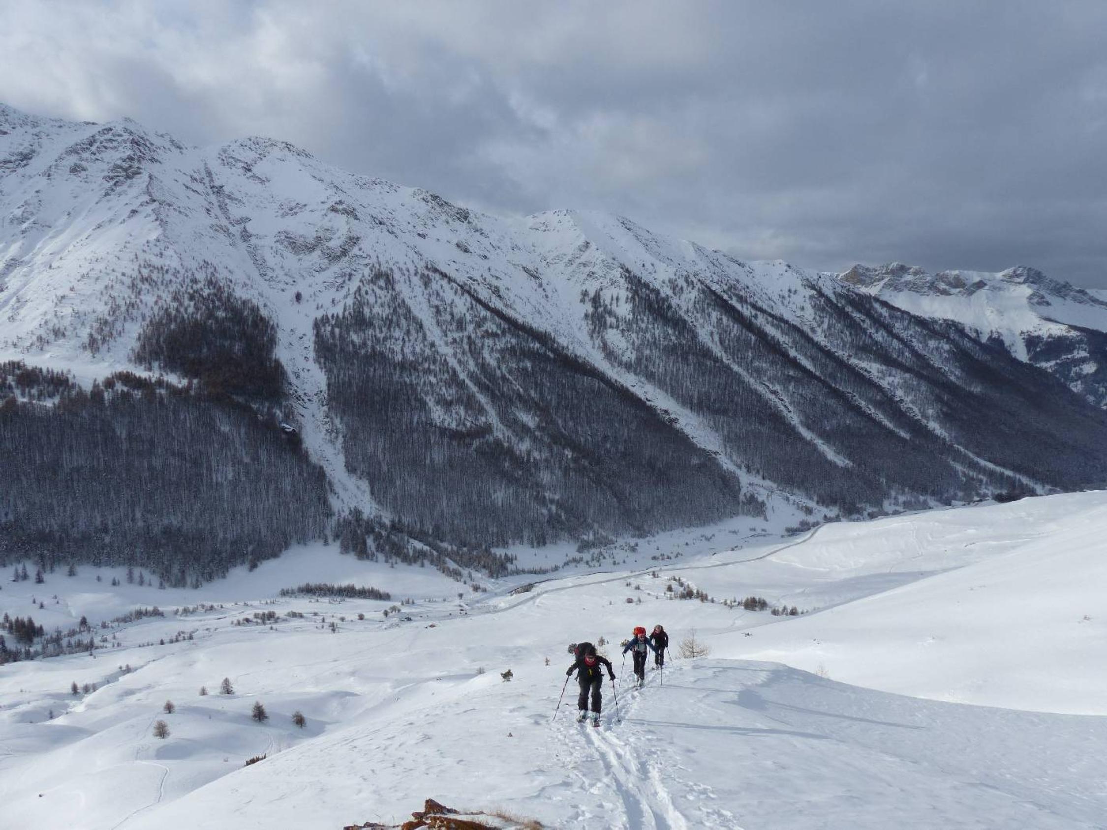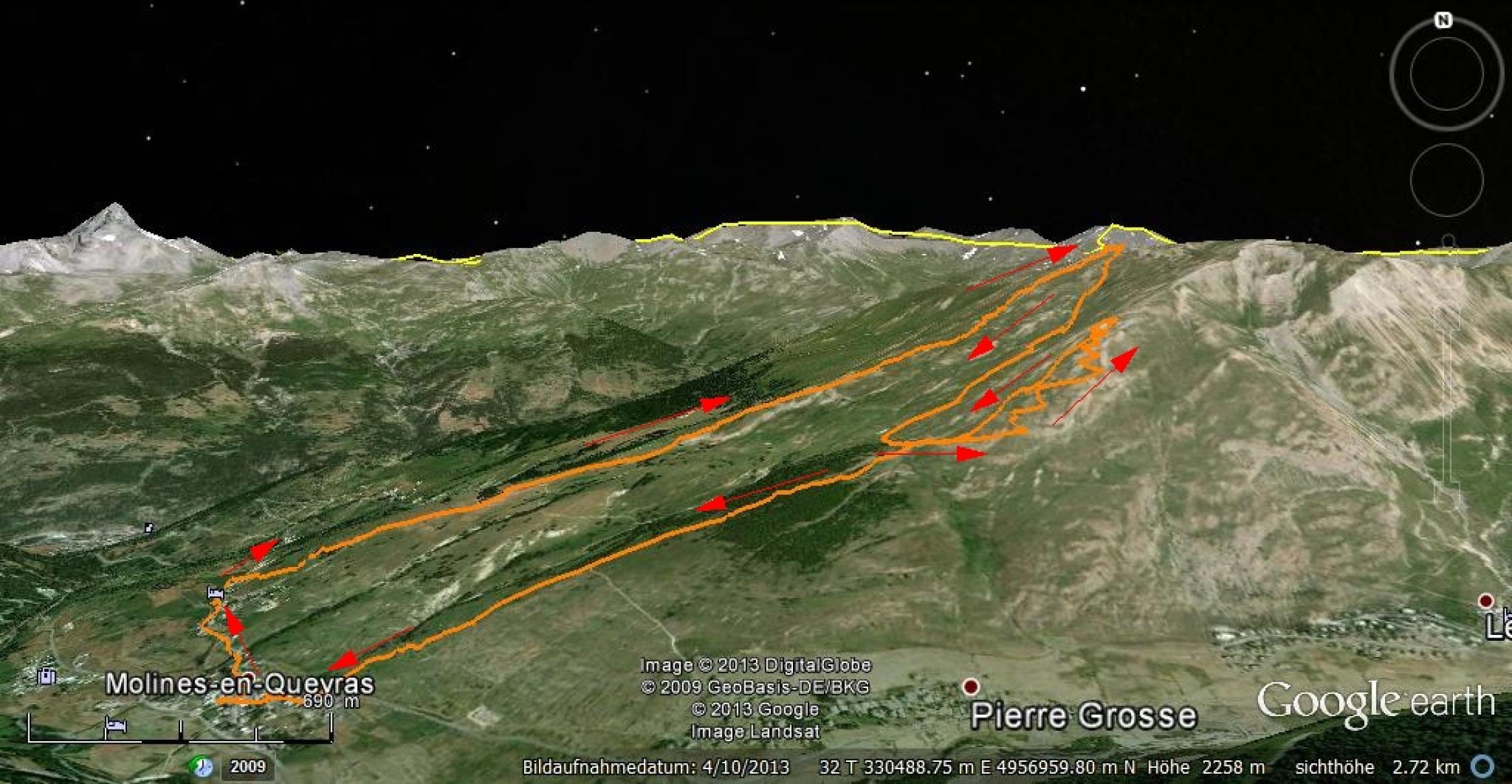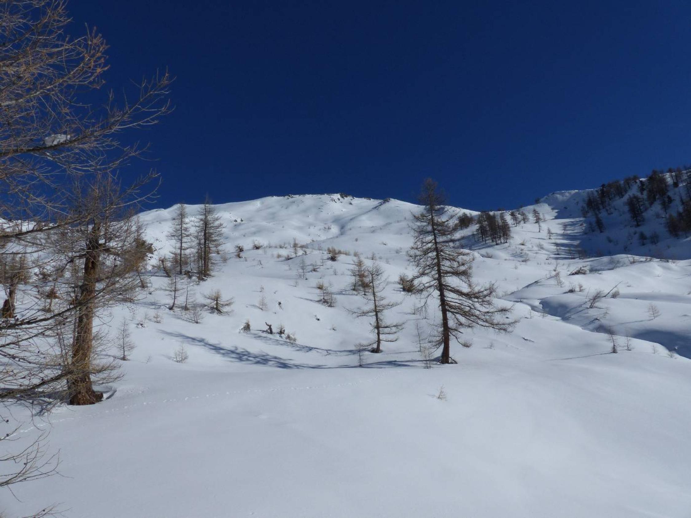 ab Gipfel nach SW über P2476 runter bis ca. P2246 (La Combe Duit). Nochmals auffellen und neuer Aufstieg zuerst nach SO leicht ansteigend queren, dann Rücken über P2401 bis Abflachung kurz vor P2606. Abfahrt in weitem Muldensystem rechts von Aufstieg direkt runter nach SW, vorbei an P2401 und nach kurzer Lärchenwaldpassage direkt runter nach Molines-en-Queyras (1778m). Abschließend Fußmarsch auf Fahrstraße nach zurück nachGaudissard.