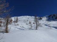 Abfahrt ab Joch über grandiose Hänge zuerst nach West, dann nach Süd über "Seille Boeufs" und "La Lauziere" - direkter als Aufstieg weiter durch steile Waldpassage direkt runter zum Startpunkt La Monta.