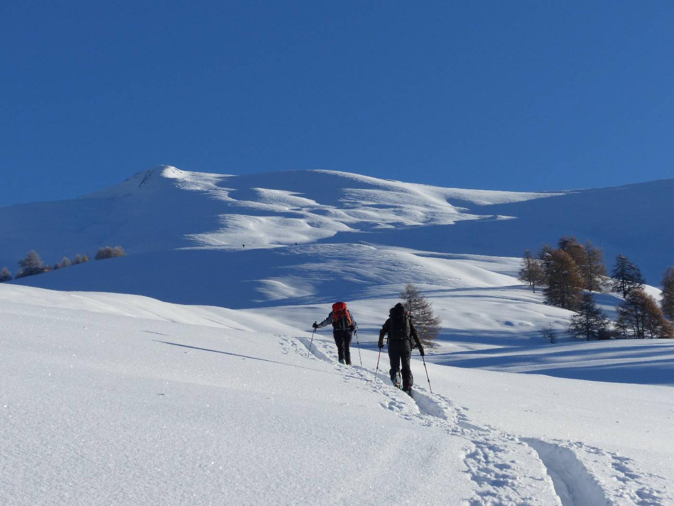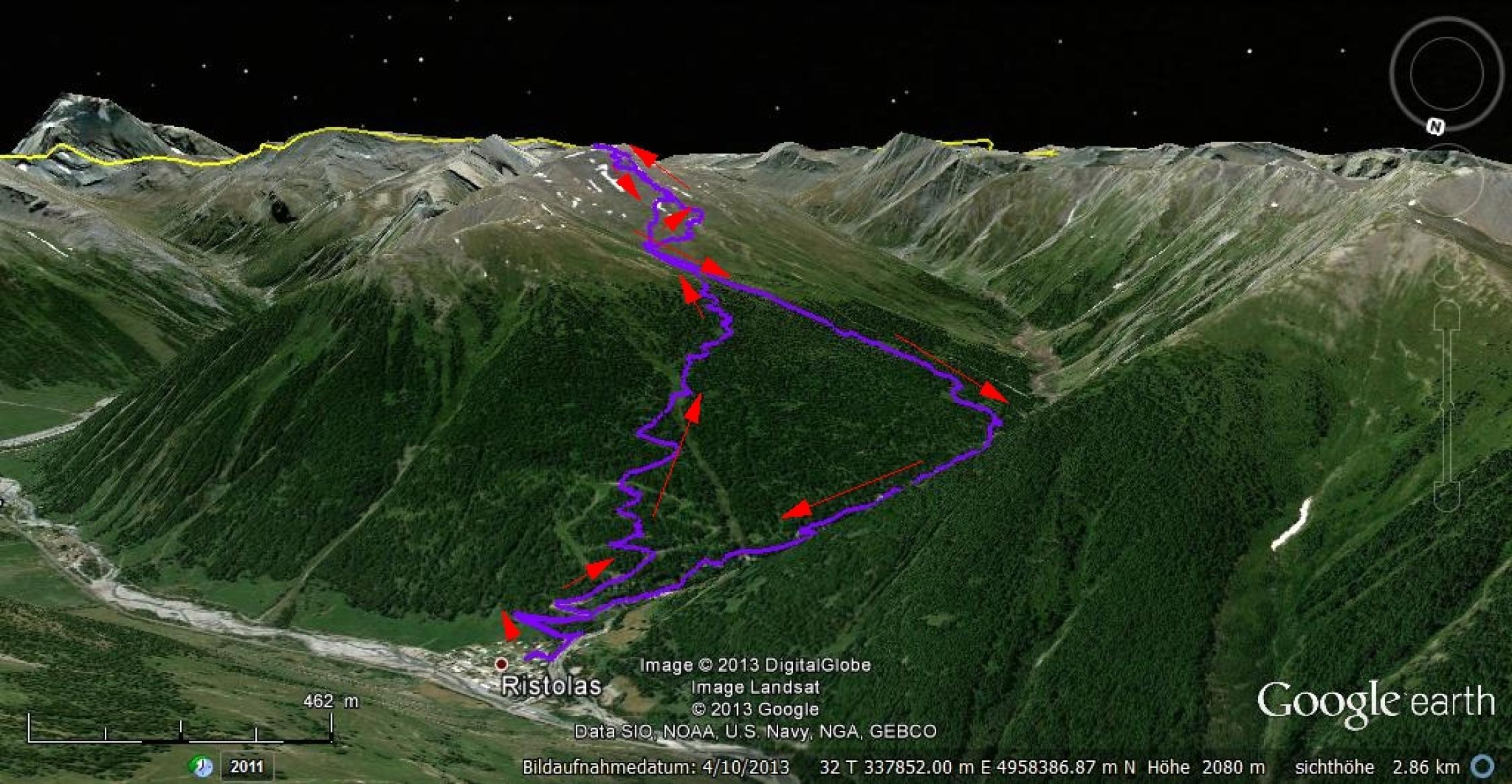 Ab Parkplatz Ristolas (ca. 1620m) nach SW (rechts des Torrent de Ségure) durch Waldgebiet dem anfangs breiten Forstweg folgen. Diesen bei ca. 1780m steil nach scharf links verlassen - ohne Spur wohl eher schwer zu finden! - nun auf Sommerwanderwegen in wechselnder Steigung durch wunderschönes Waldgebiet - dabei bitte das Birkhuhn Sperrgebiet (http://www.oncfs.gouv.fr/IMG/image/DIRAMC/Tetras-lyre_Ristolas.pdf) respektieren - den Torrent de Clot Lucette bei ca. 2110m querend erreicht man bei 2400m waldfreies Gelände mit Blick zum Ziel. Nun nach SO leicht ansteigend den Rücken (Cayre de l'Ours) des Maloqueste (leichte queren. Dann lange Querung (potentiell kritisch - sicherer ist kurze Abfahrt und dann Aufstieg nach SO) durch Bachbett des Torrent la Bluette dann SW bis nach Steilstufe bei ca. 2600m das Rückensystem erreicht wird das mit wechselnden Steigung Richtung SW zum Gipfel leitet. Ggf. Skidepot ca. 50Hm unter Gipfel, da Abfahrt vom Gipfel wegen Felsgelände wohl nicht immer lohnend.