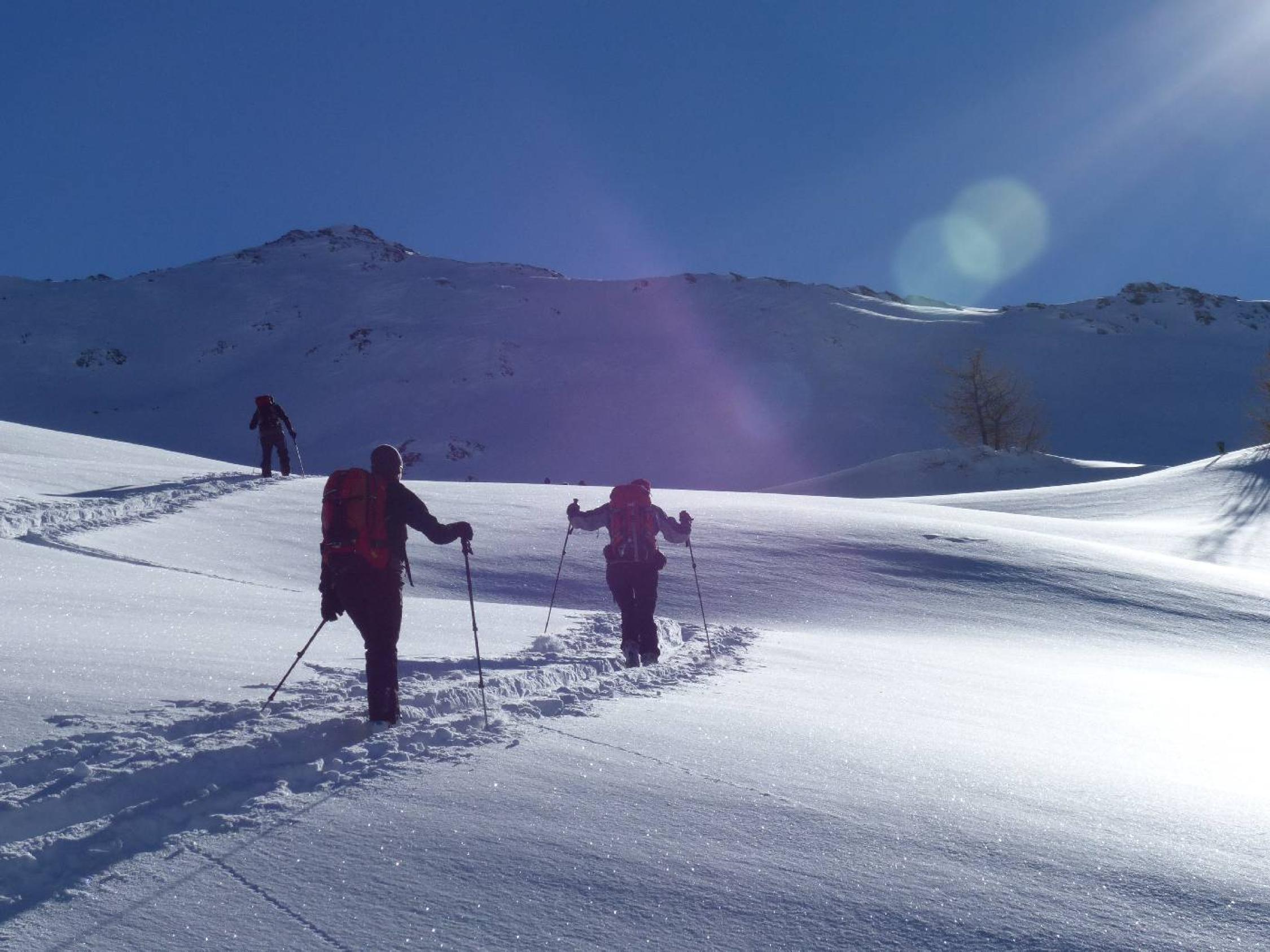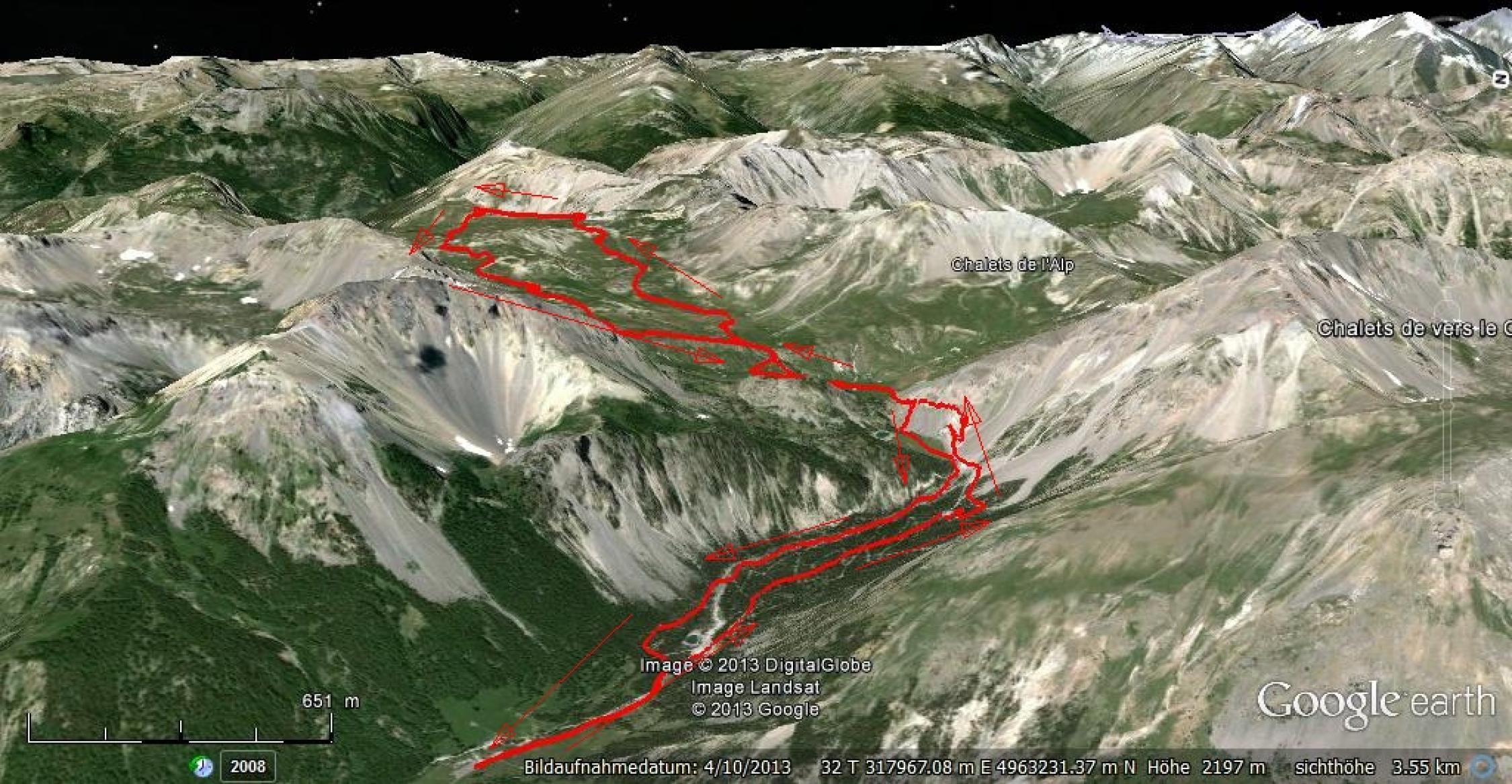 Beachten: wenn keine Spur liegt, so ist Wegverlauf speziell zwischen 1800m und La Lauziere unübersichtlich und dank Querungen über steiler Schlucht des Torrent de la Bataille mit Vorsicht zu geniesen. Wir hatten diese Verhältnisse und querten deshalb erst oberhalb von 1800m und mieden durch Umgehung (tw. sehr steile Waldrücken oberhalb des Torrent Bataille) Aufstieg in steilen Hängen von La Lauziere.