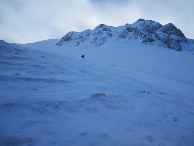 Auf ganzer Strecke viel Triebschnee vorhanden. Mit den Schneeschuhen teilweise bis 50cm eingebrochen (heute mit dem Snowboard unterwegs).