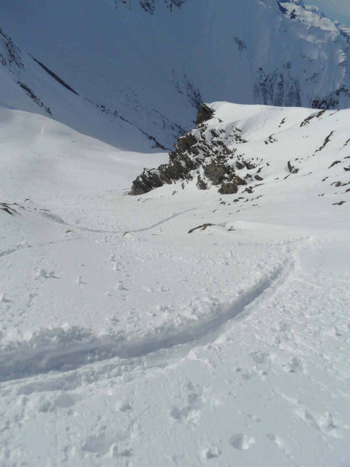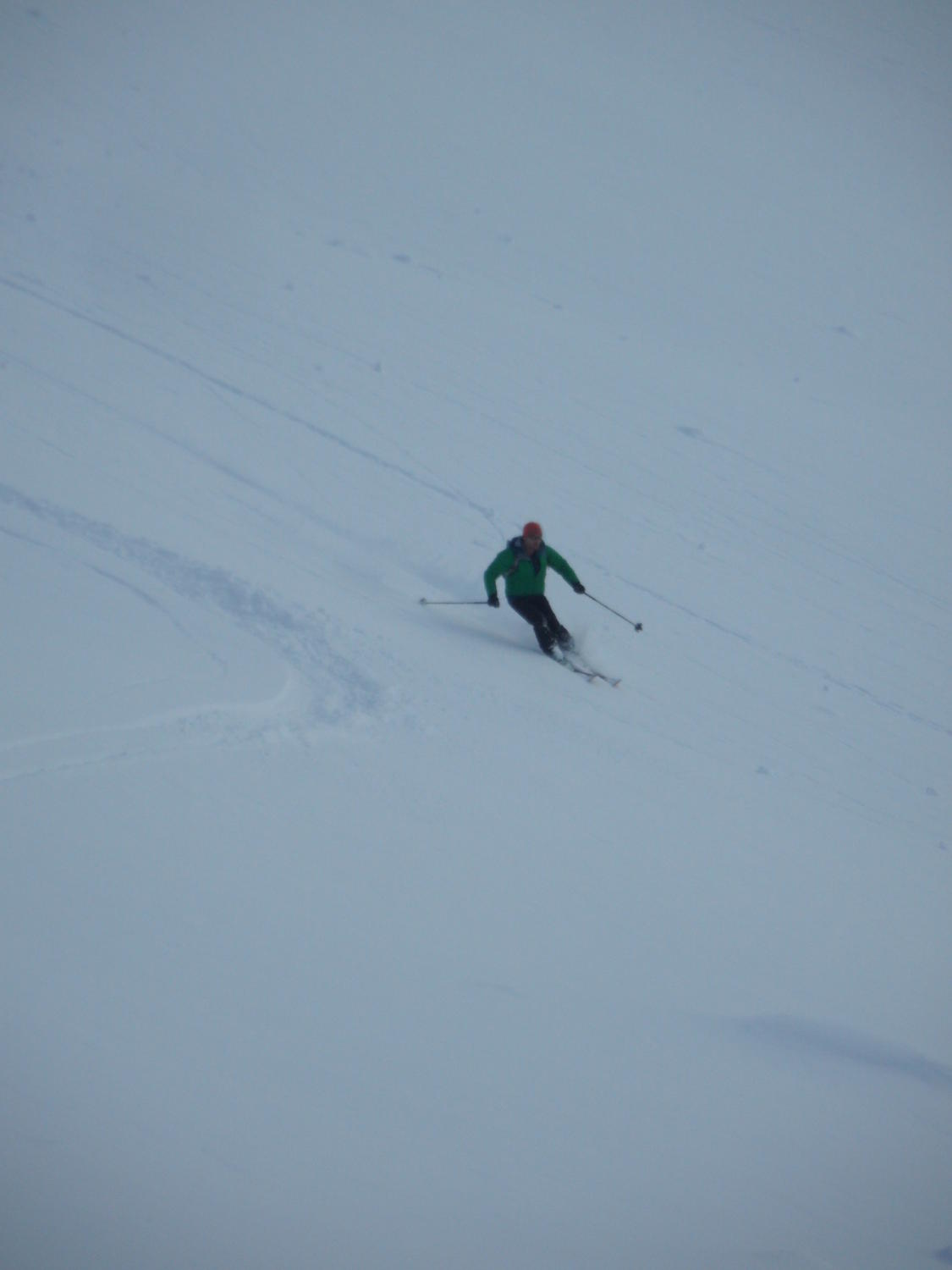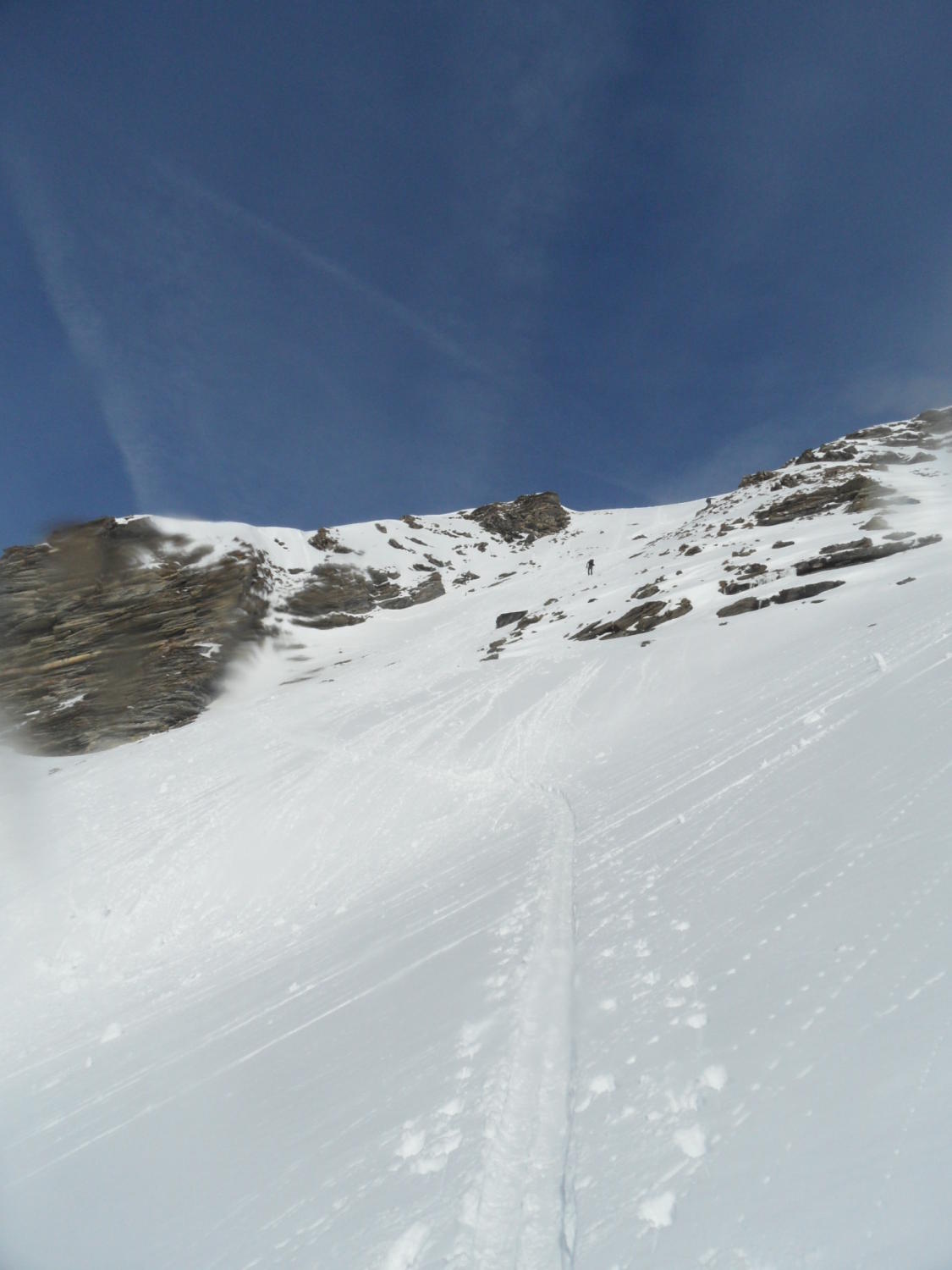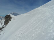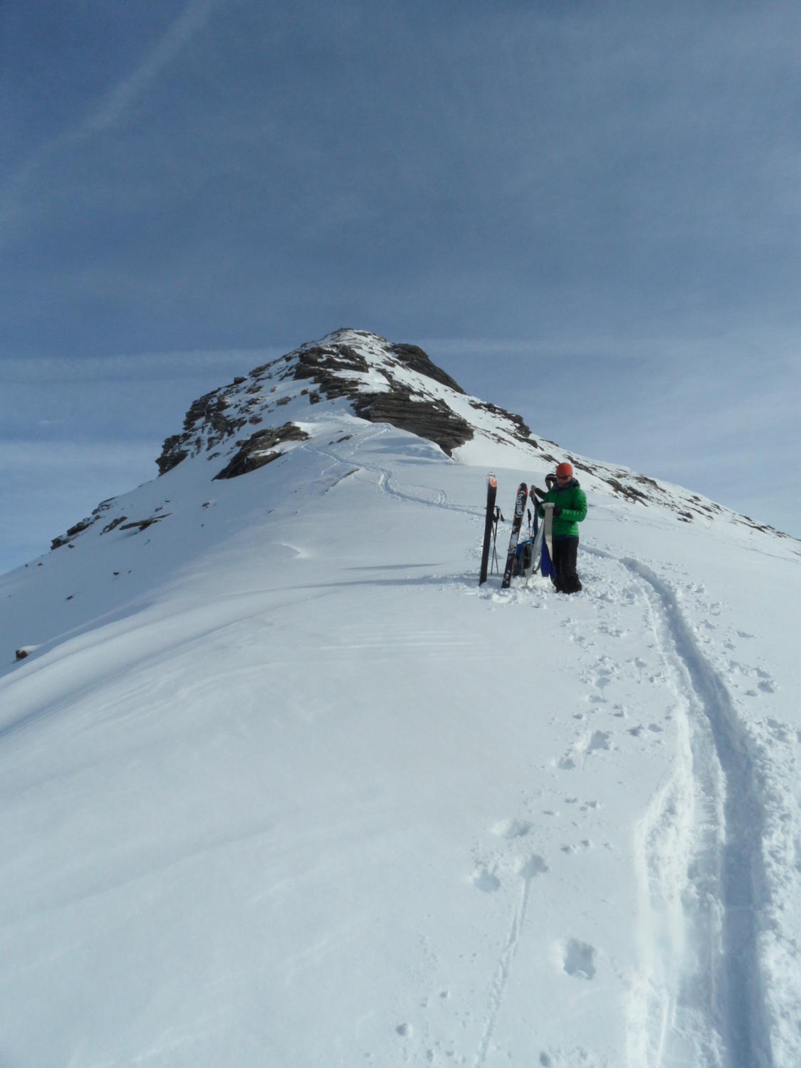 reichlich Schnee,erster hang noch mit Vorsicht zu geniessen,liegt einiges an Schnee in mulden auf nichts.nette stollen an fellen garantiert.sind gipfel ab boden links durch schwaches culi hoch auf grat(-43°),sehr gut .die letzden 50hm sind abgeblasen und nicht fahrbar(haben wir ausgelassen).
