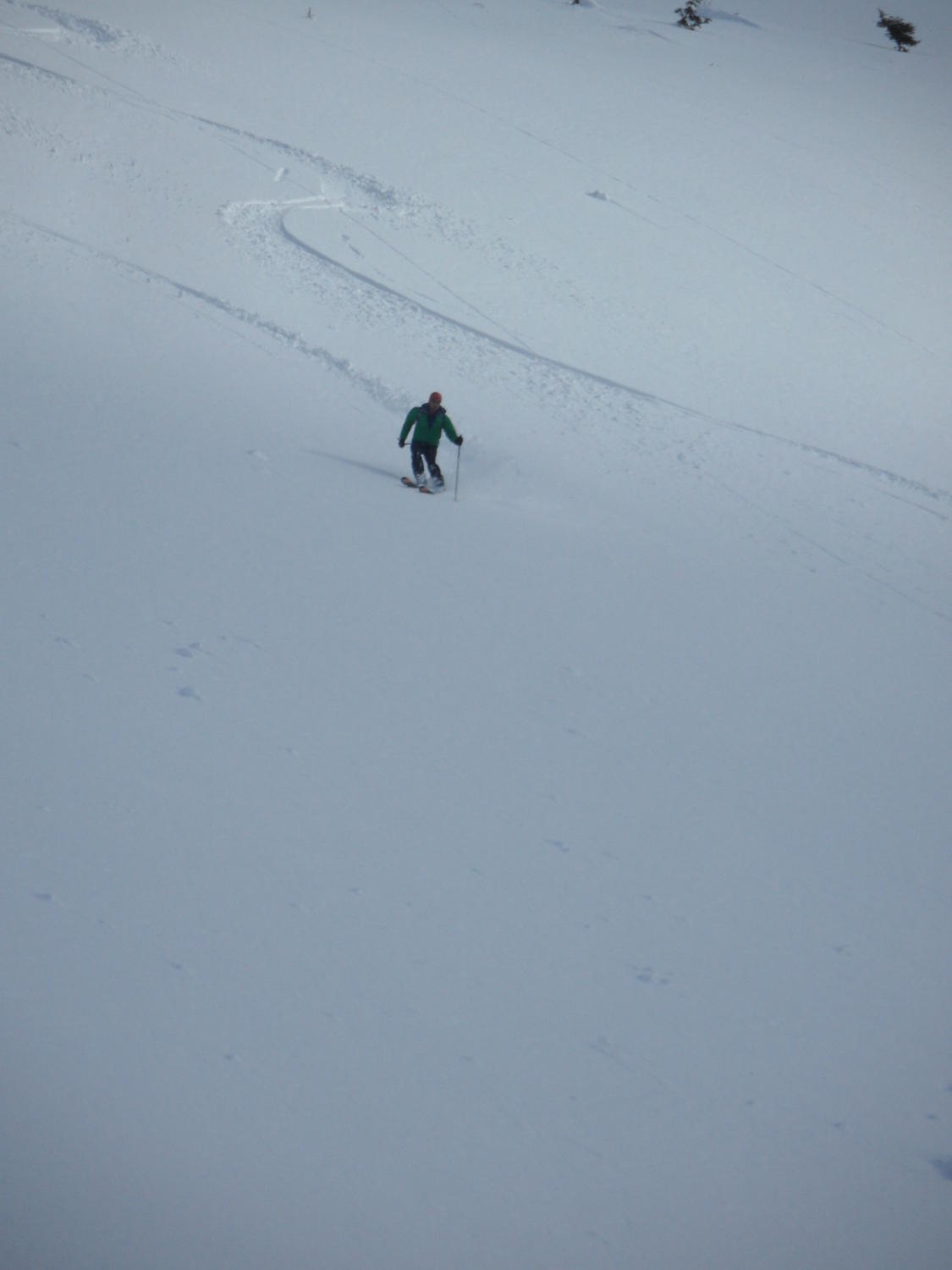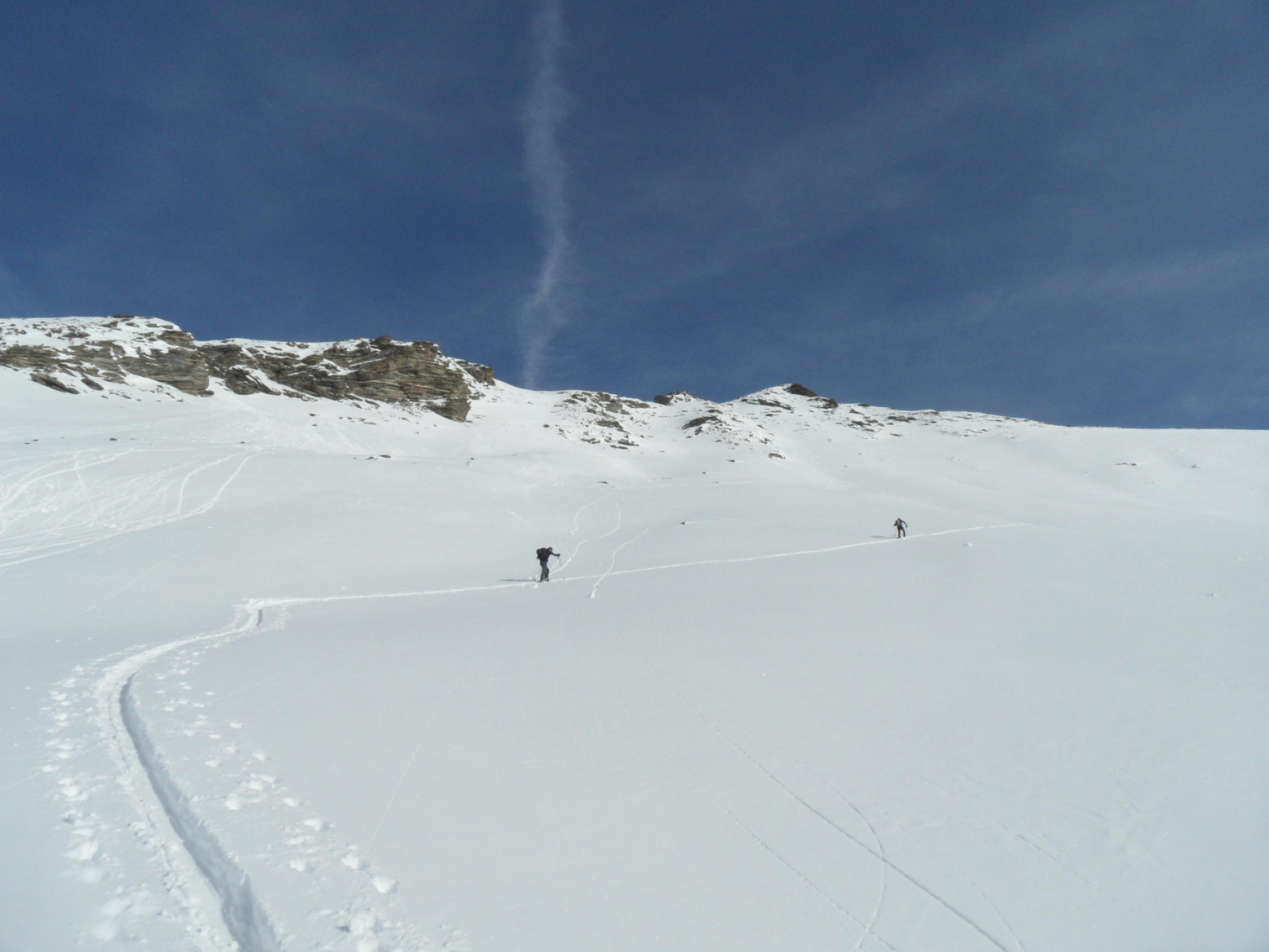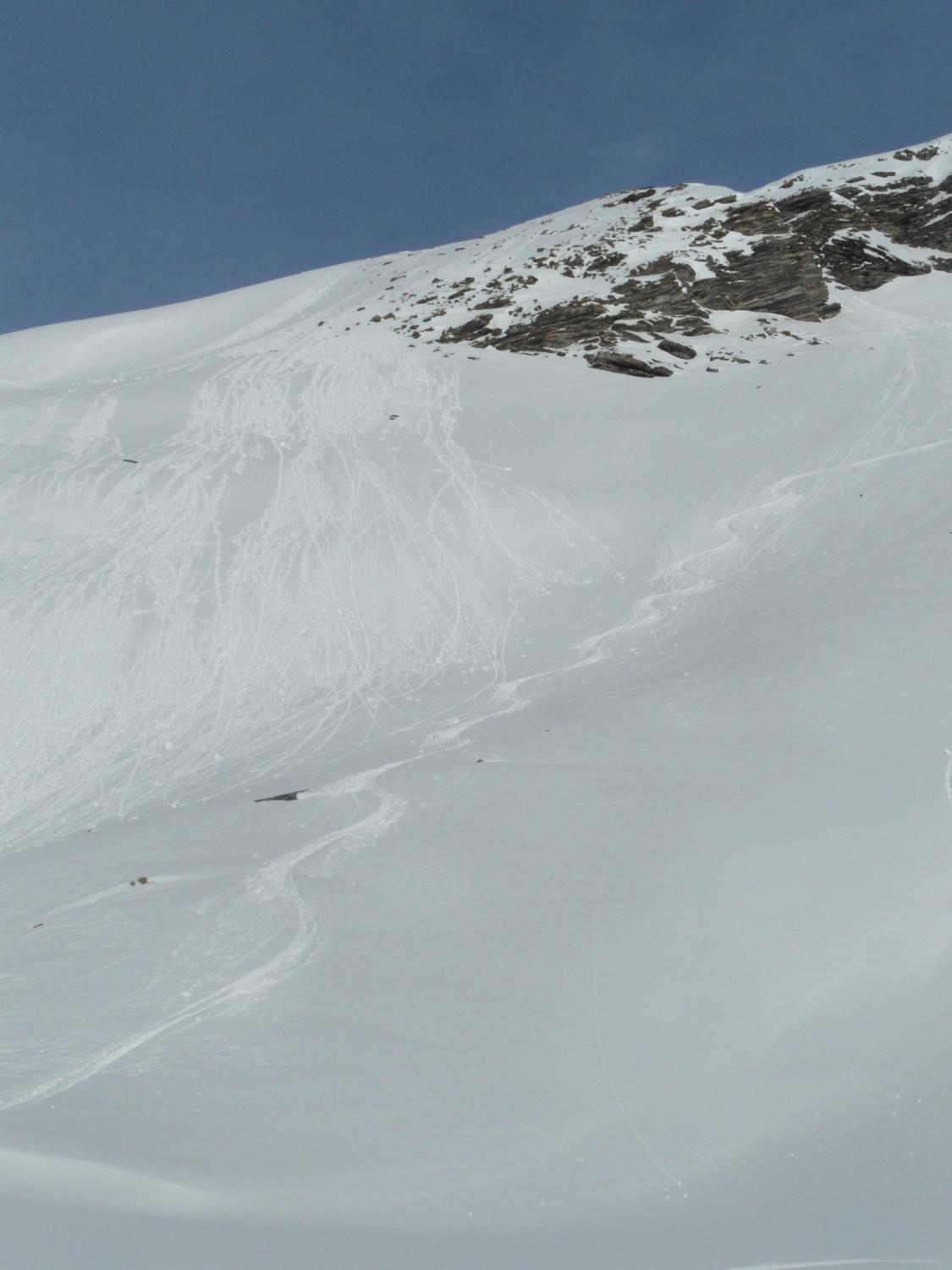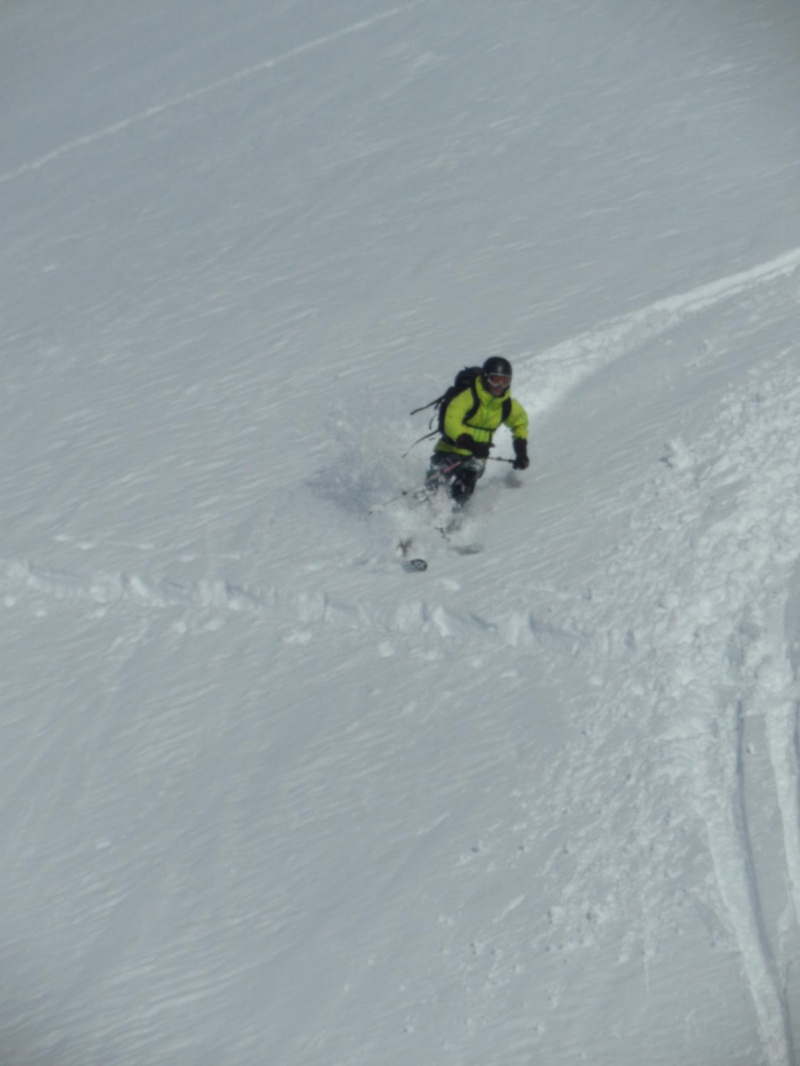reichlich Schnee,erster hang noch mit Vorsicht zu geniessen,liegt einiges an Schnee in mulden auf nichts.nette stollen an fellen garantiert.sind gipfel ab boden links durch schwaches culi hoch auf grat(-43°),sehr gut .die letzden 50hm sind abgeblasen und nicht fahrbar(haben wir ausgelassen).
