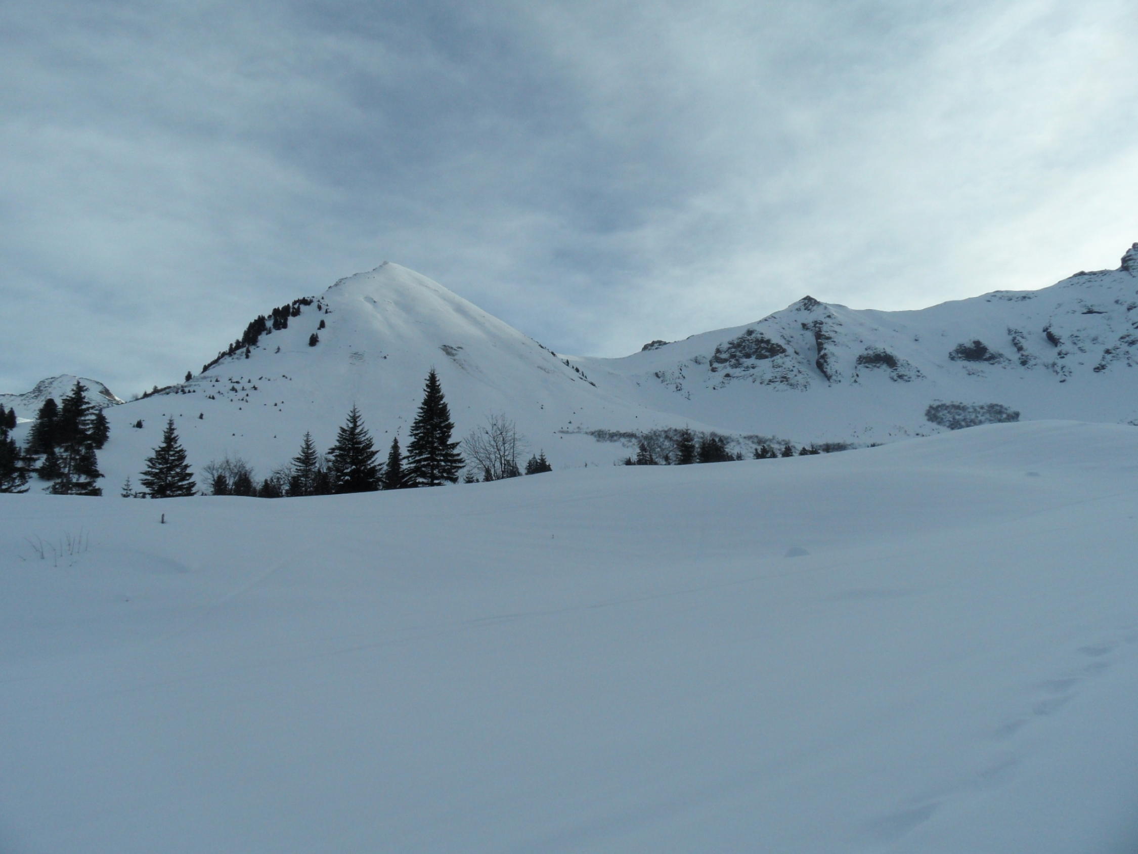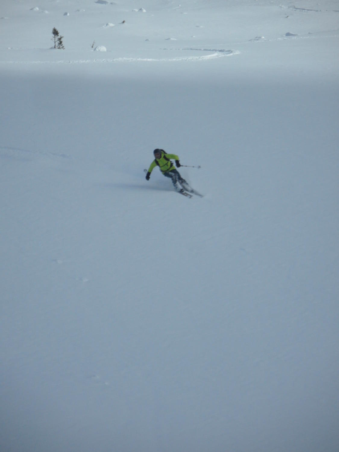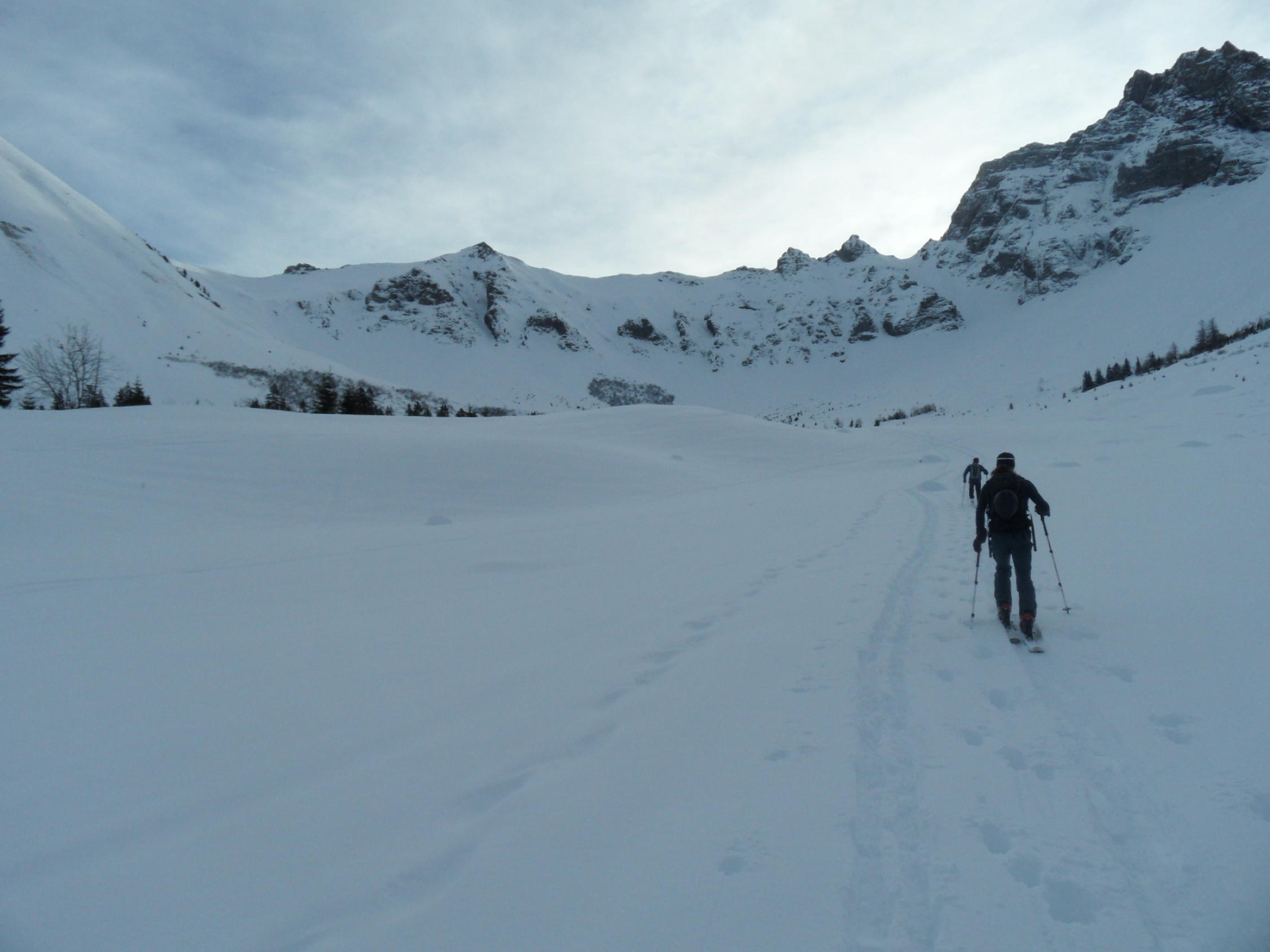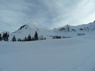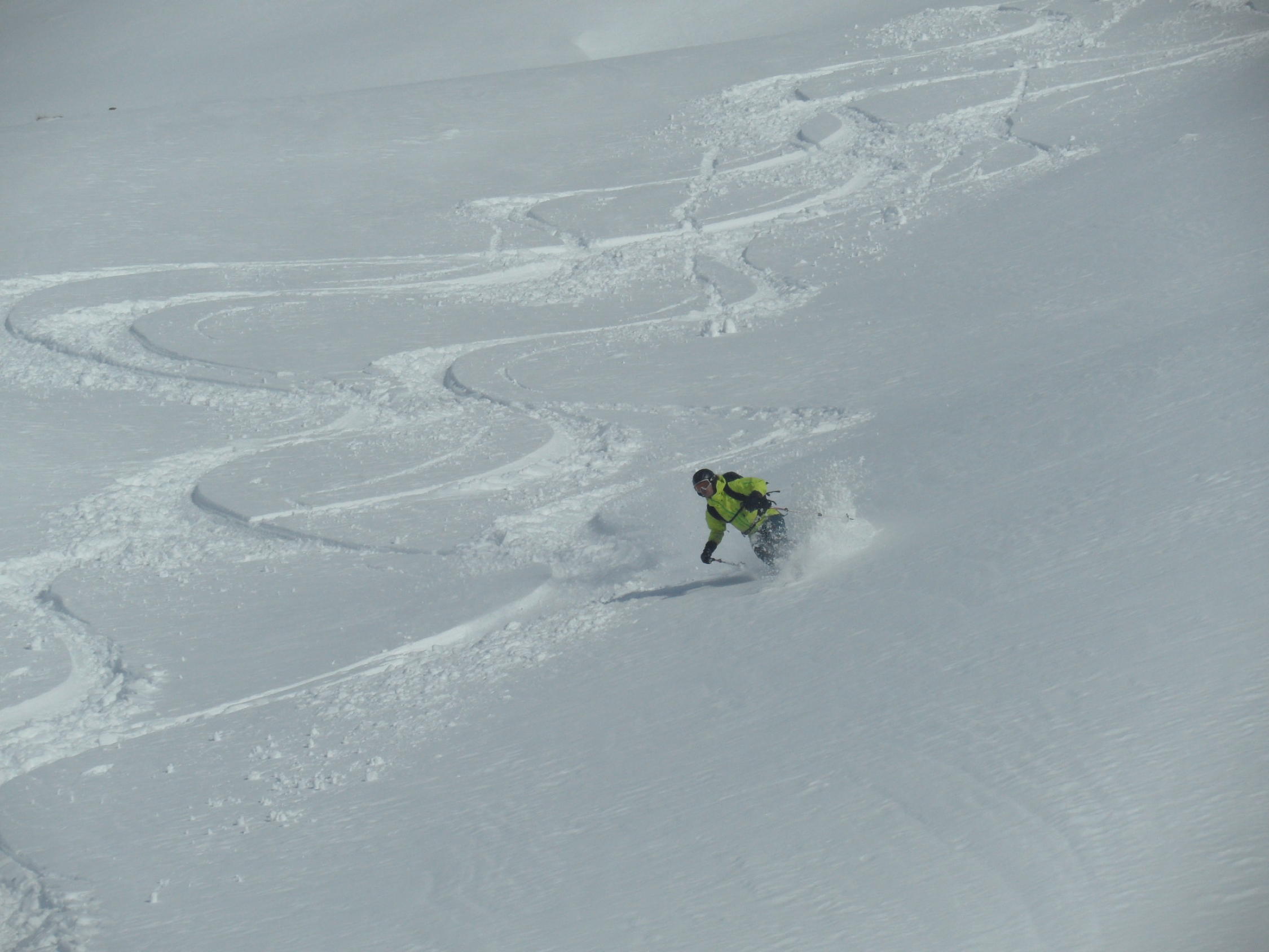 reichlich Schnee,erster hang noch mit Vorsicht zu geniessen,liegt einiges an Schnee in mulden auf nichts.nette stollen an fellen garantiert.sind gipfel ab boden links durch schwaches culi hoch auf grat(-43°),sehr gut .die letzden 50hm sind abgeblasen und nicht fahrbar(haben wir ausgelassen).