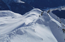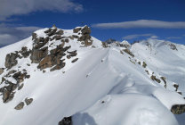 Neuschnee auf dem Grat, aufgrund von Windverwehungen z.T. recht mühsam zum Spuren.