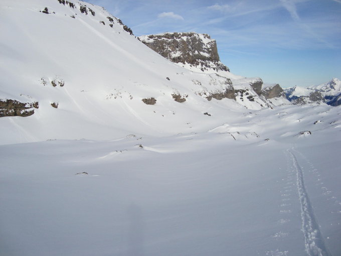 am Mo. 6.1.14 Zustieg von Sunnbüel via Lämmerenplatten zur Gemmi.(Roter Totz wegen Stufe 3 nicht angegangen). Nach den Schneefällen vom 4.+5.1.14 schön verschneite Landschaft. Beim Pkt. 2527 Schneeprofil von 2 Meter Tief gegraben. Kurze, schöne Pulverabfahrt zum Lämmerenboden.