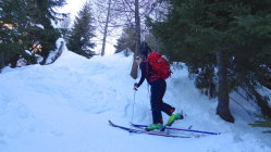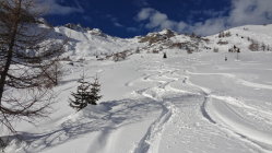 30 cm alter Pulverschnee. Teilweise leicht gedeckelt durch Wind und Sonne. Abfahrt dennoch sehr lohnend. Ein wunderschöner Skiberg. Aufstieg und Abfahrt durch den Wald sind immer ein wenig mühsam. Frühlingshafte T-Shirt Temperaturen.