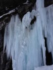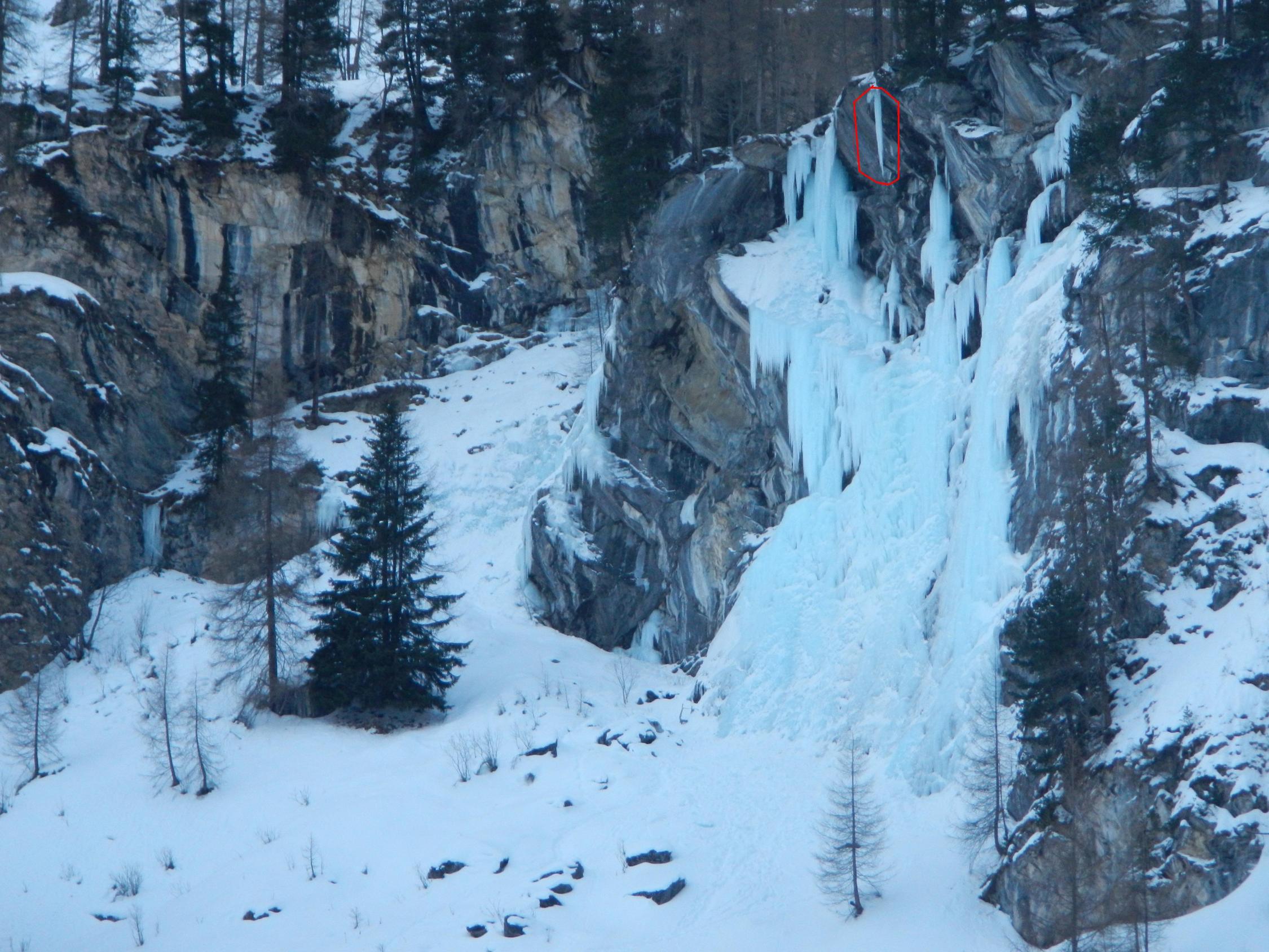 Eindeutig zu warm, Eis löst sich teilweise vom Fels im oberen Sektor, Löcher vom fließendem / tropfenden Wasser bereits vorhanden die sich weiter ins Eis fressen. Wir haben den markierten Zapfen entfernt (war nur ein leichter Fußtritt am Zapfenkopf erforderlich). Ansonsten unter der Woche schön ruhig.
