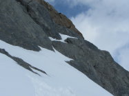 20-60cm Schnee mit 5cm Deckel, darunter komplett unverbunden und grieslig, d.h. man gräbt bis zu den Felsen durch. Aufstiegsvariante links zur Schlinge war bodenloses Gewühle, wo man bis über die Knie einsinkt, Bergschrund dann auch nicht ganz unproblematisch, da der Schnee nicht hält; Variante rechts zu den Metallbügeln bis zur ersten Stange ok, von der ersten zur zweiten Stange dann ebenfalls 20-30cm unverbundener Lockerschhnee auf eher abschüssigen Platten, heikel, da der Pickel nicht gebremst hätte und zwischensichern nicht möglich gewesen ist.