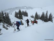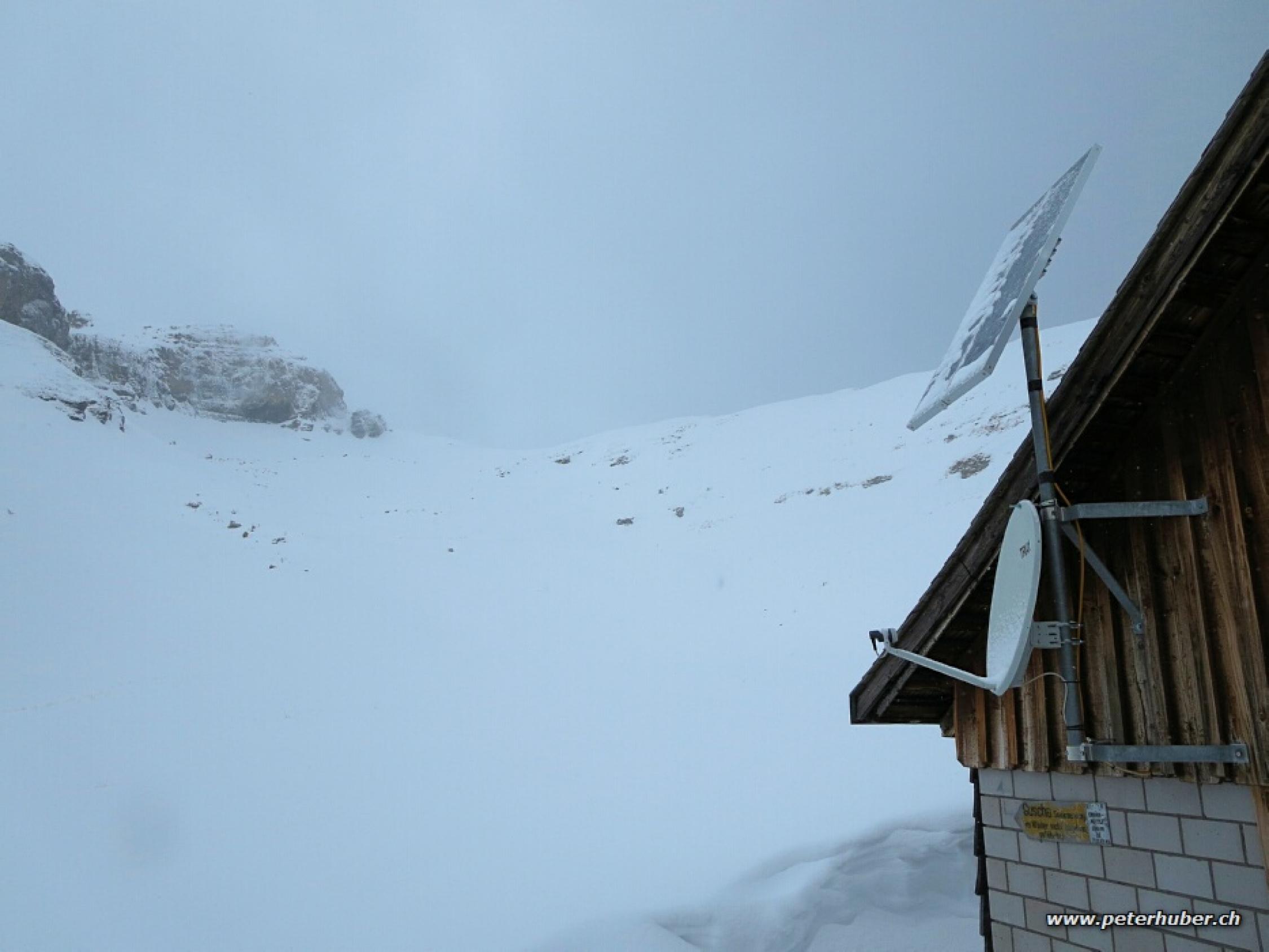 Leichter Schneefall, Sicht unten OK, oben weiss in weiss. Es hat unten ca. 1 cm, oben ca. 5 cm Neuschnee gegeben. Der Neuschnee wurde verweht sodass von den alten Spuren fast nichts mehr zu sehen ist.