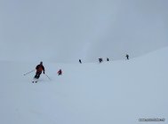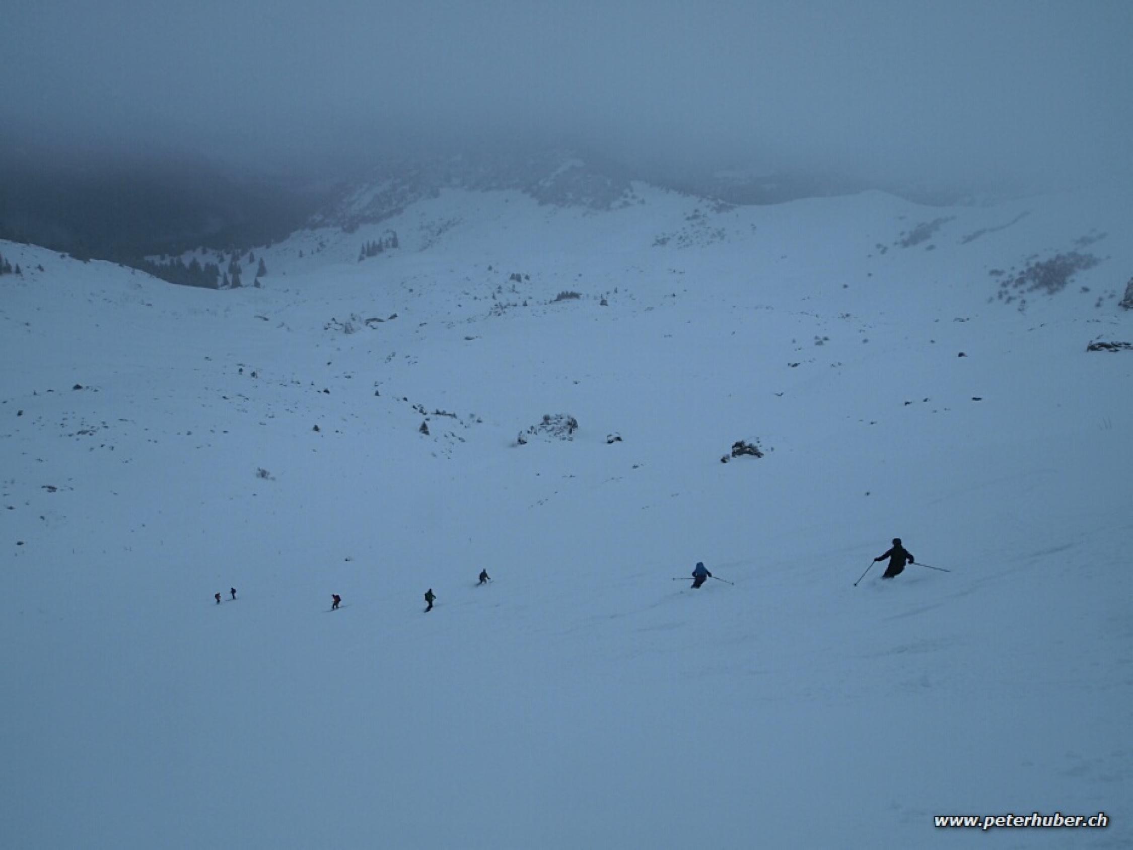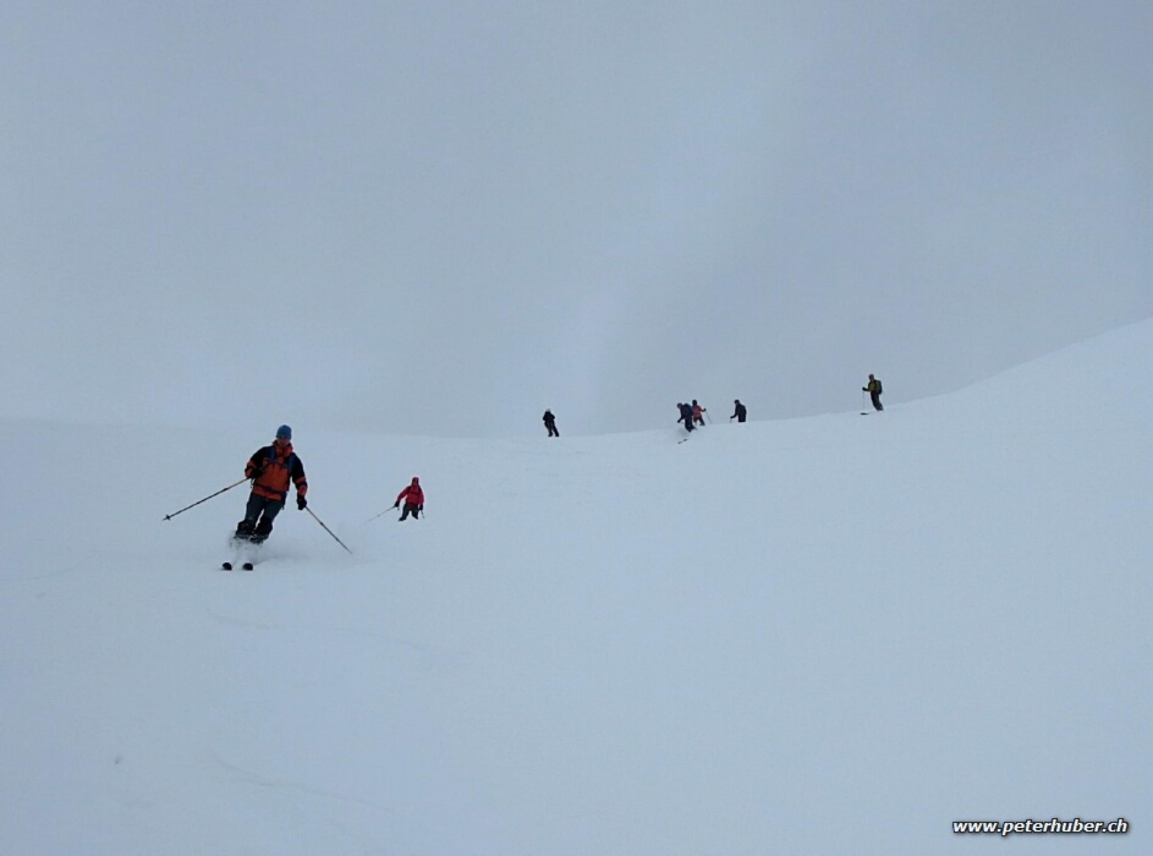 Bei der Abfahrt (leider weiss in weiss) gab es schöne Schwünge im frischen Schnee, die leider gelegentlich von Steinkontakten gestört wurden. Im unteren Drittel war dann die Unterlage nicht mehr gefroren und man sank öfters unerwartet ein.