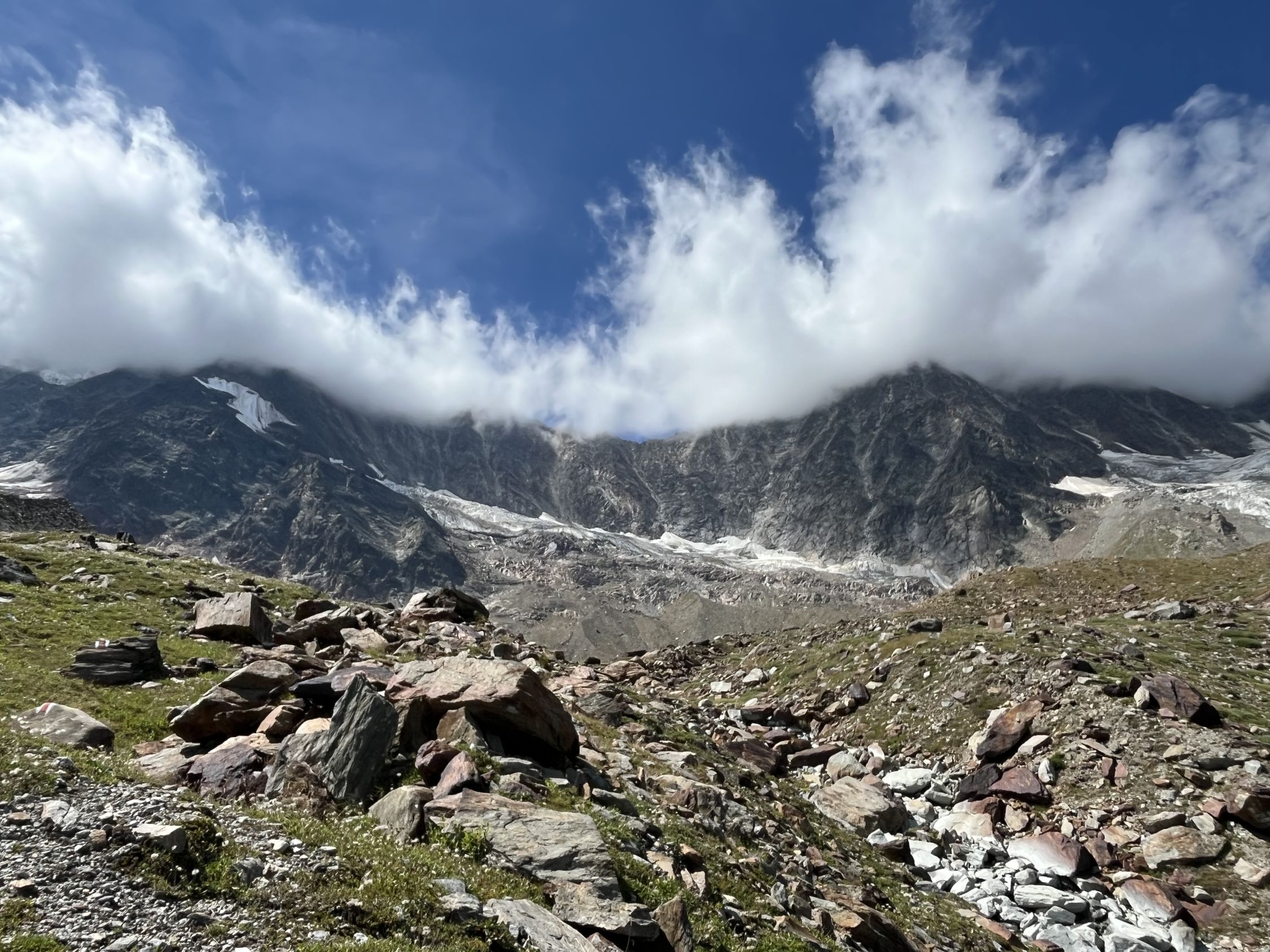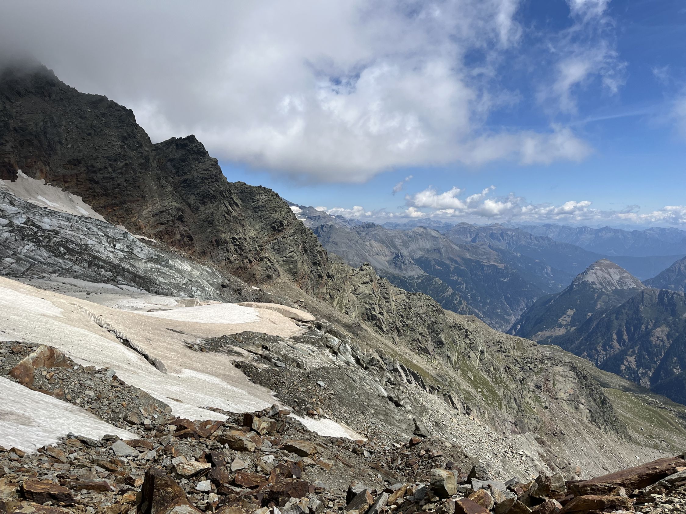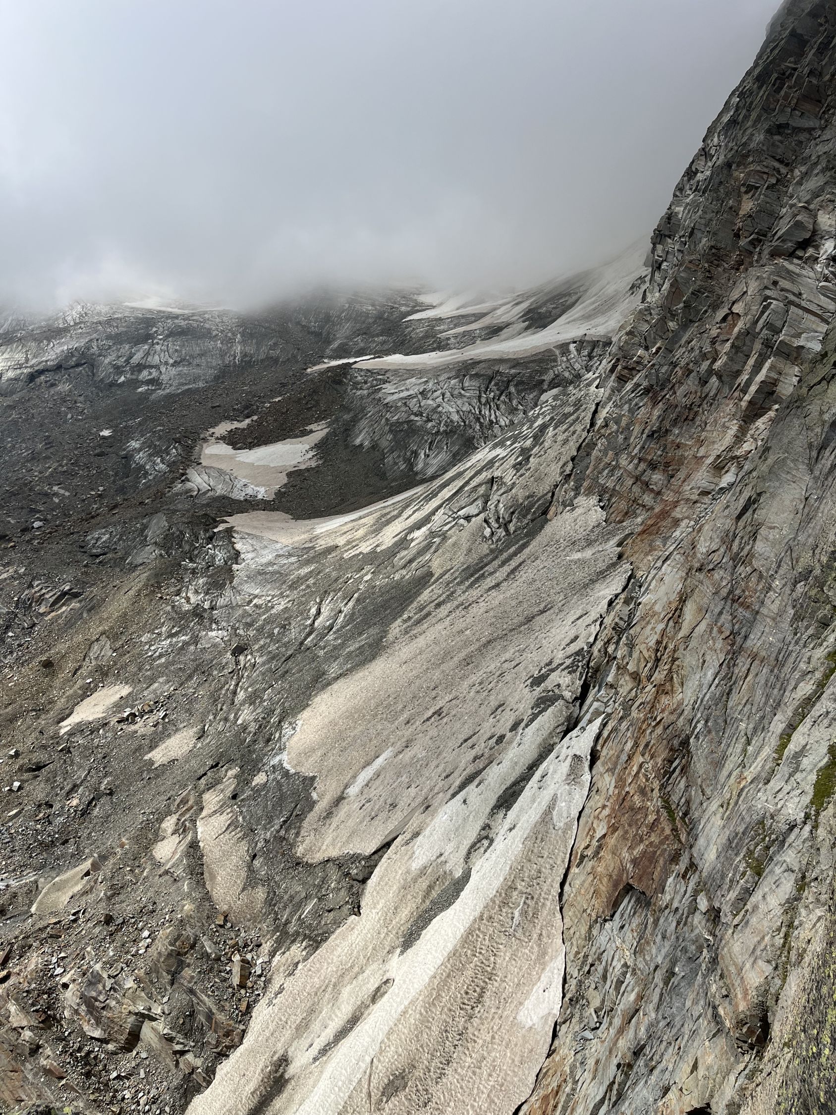 Wetter und Verhältnisse an sich gut. Dummerweise hingen bereits am Morgen Quellwolken am ganzen Hauptgrat, so dass die Sicht schlecht war. Vor allem ist es mit den knappen Angaben des alten SAC-Führers sehr schwierig, den Einstieg in die Wand zu finden. Ich habe bis auf ca 3050 m gesucht und nichts machbares gefunden.