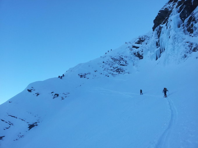 Die Schneelage ab Dalpe ist sehr gut und die ganze Route ist gespurt. Über die Rampe von Mottascia sind wir mit aufgebundenen Ski hochgestiegen. Ab P.1834m feinster Pulver bis auf den Gipfel. 4 Spuren waren vom Samstag vorhanden und heute sind noch ca. 20 dazugekommen.