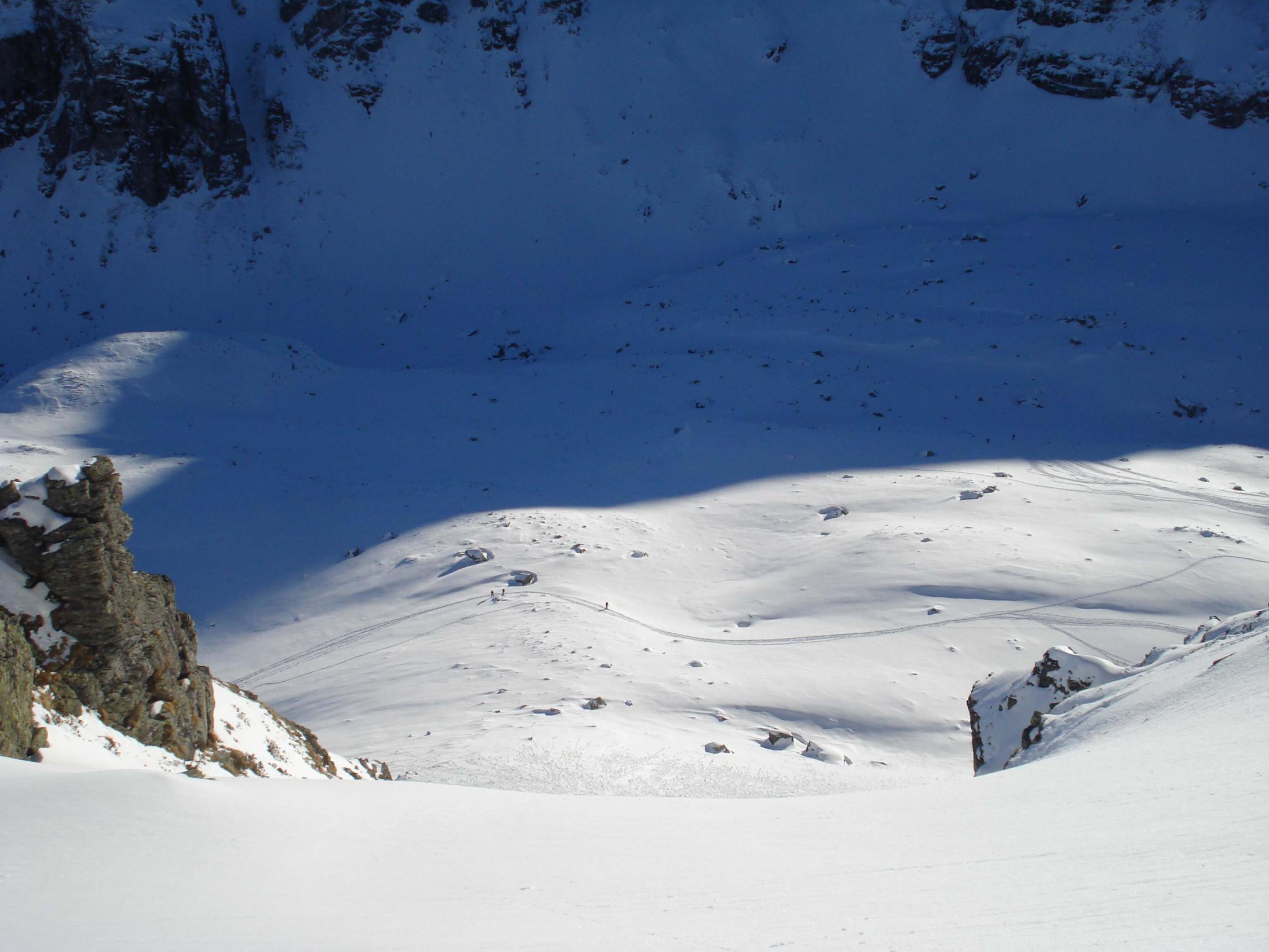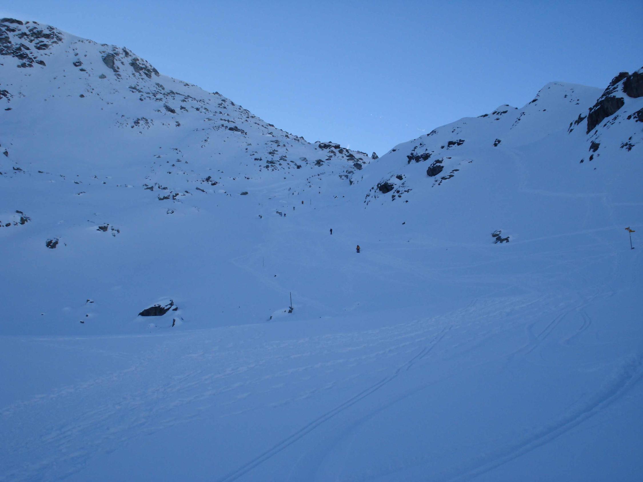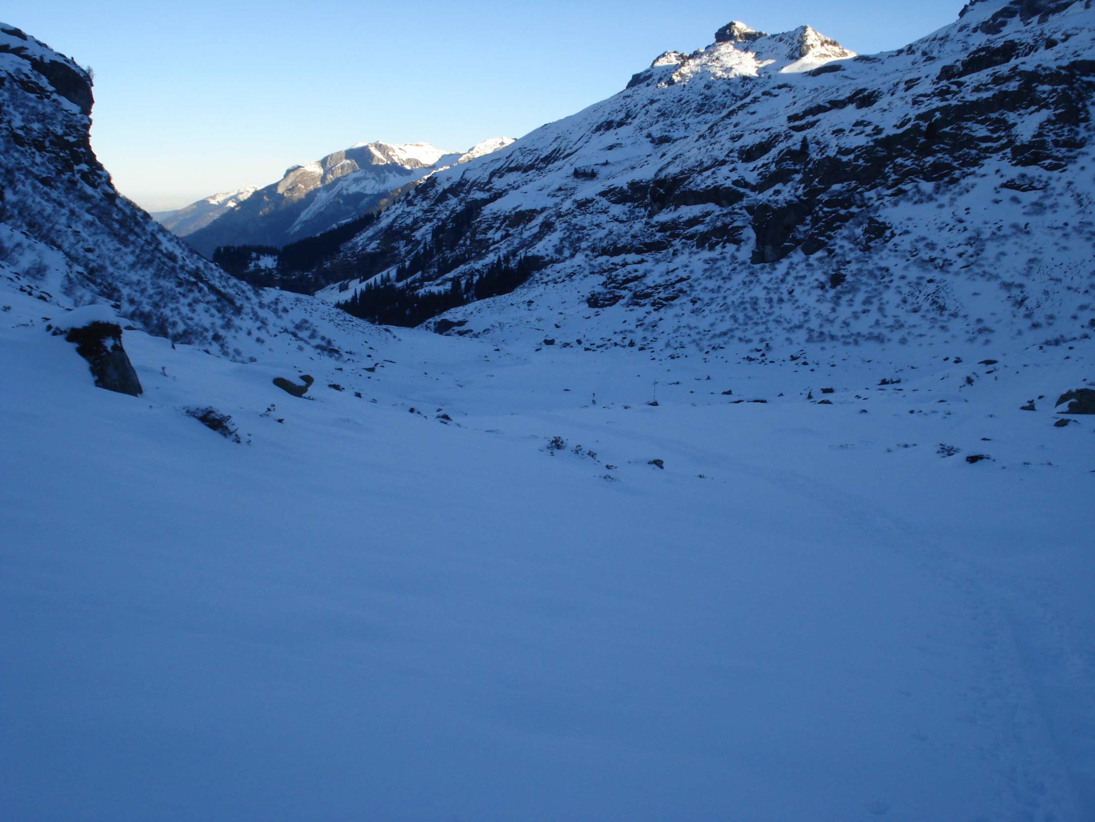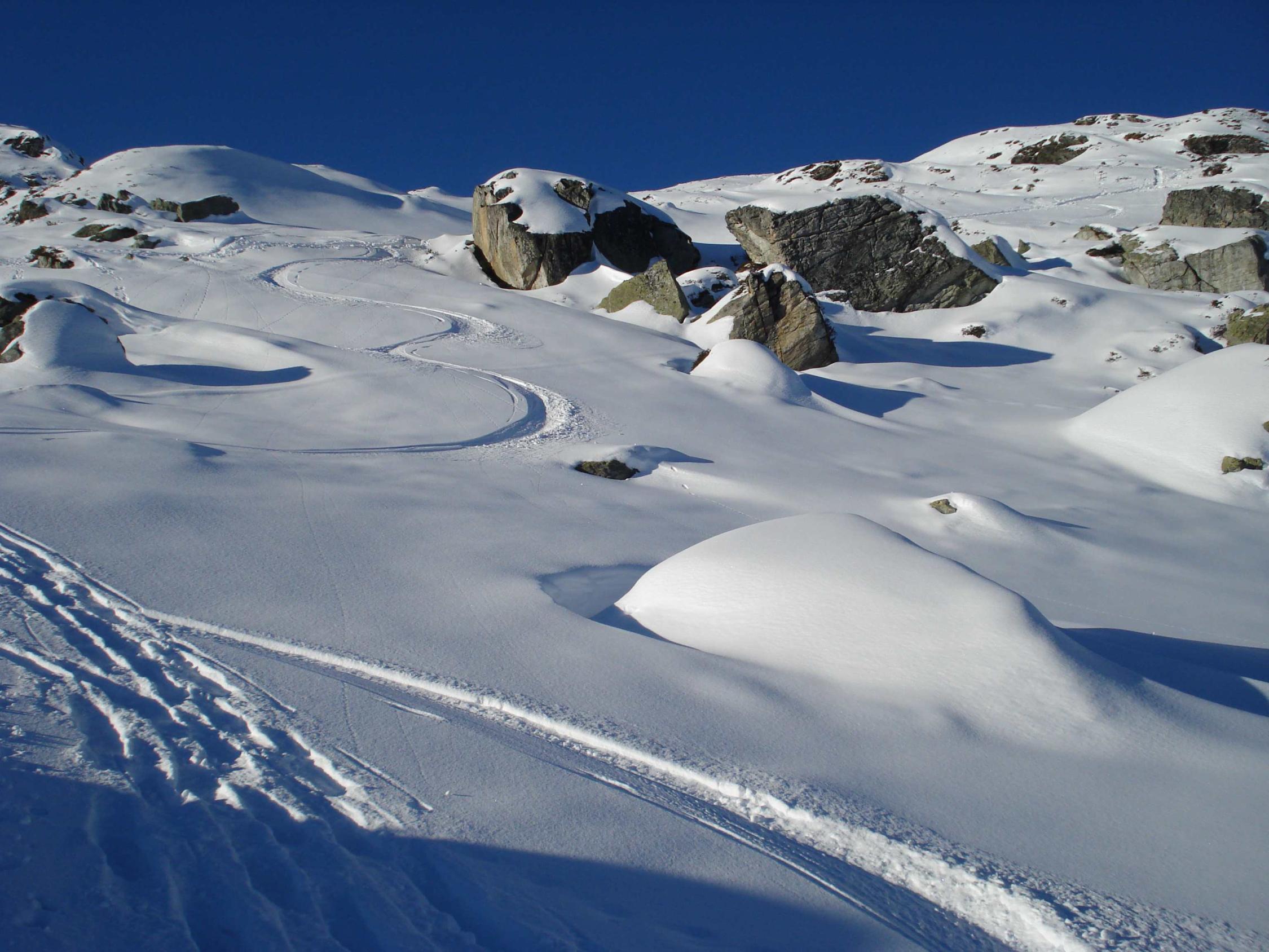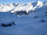 Spur weiter bis zur Leglerhütte gleicht einer Autobahn. Abfahrt in schönstem Pulver. Die Sonne kommt noch nicht bis ins Tal. Steinkontakt kann mit vorausschauender Abfahrt gut vermieden werden.