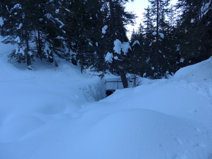 Aufstieg: Durch den Wald teilweise Behinderungen durch quer liegende Bäume; Spur teilweise rutschig . Steilaufschwung in die steinig; Ski abscnallen. Dann super bis oben. Sonner erst ab dem Grat. Abfahrt Traum- Pulver in der Flanke, darunter gedeckelt. Waldbafahrt besser als befürchtet. Im unteren Teil des Tales südseitig über die Schneeschuh- Route abgefahren.