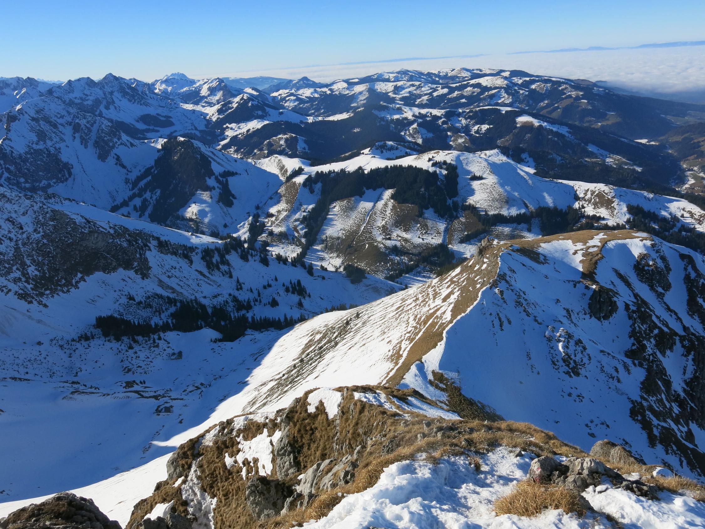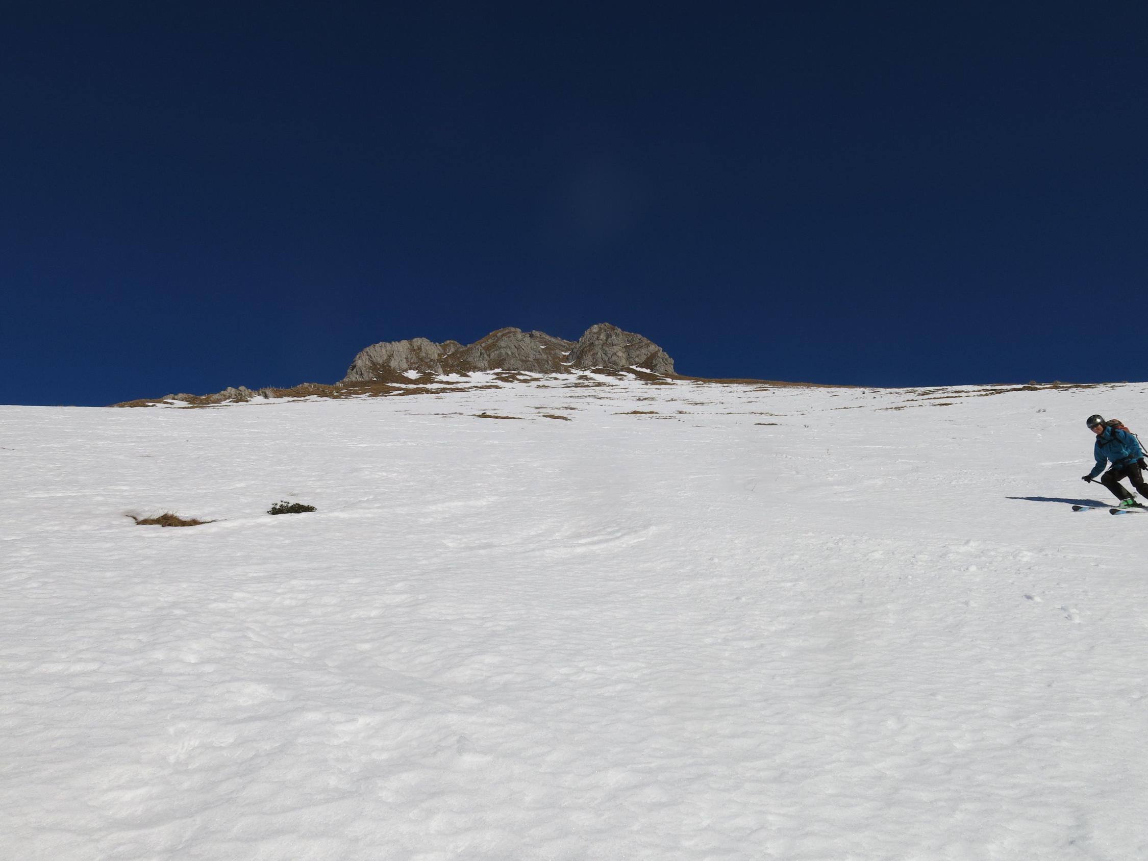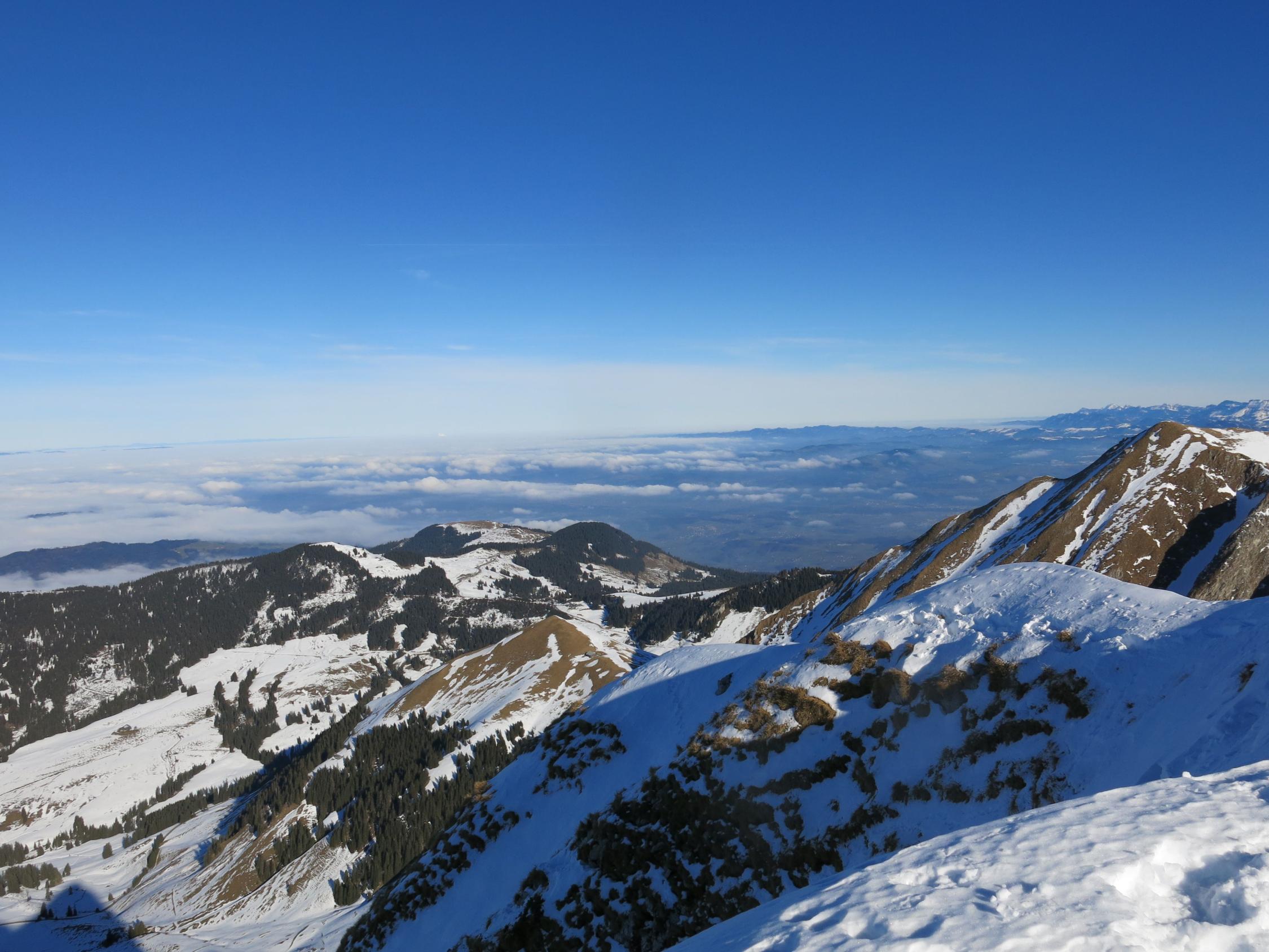 hart, alles gefroren, ab 13 Uhr an der Sonne Frühlingssulz, im unteren Teil vier Mal kurzes Skitragen nötig, schöne Frühlingsbergtour mit Blick auf das Nebelmeer, am Schatten den ganzen Tag ruppige Schneeverhältnisse mit eingefrorenen Spuren.