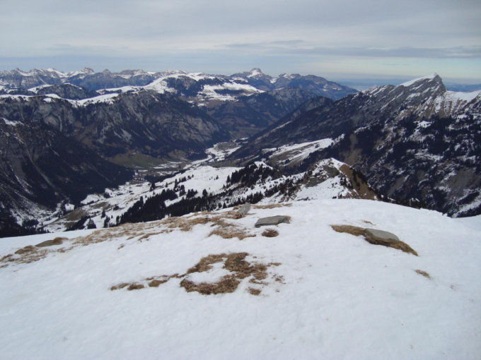 Es geht im Aufstieg gerade noch ohne Skitragen, wenn man zwischendurch auf mal auf eine Grasmutte oder etwas Kies stehen kann. Mehrere apere Stellen unter den grossen Tannen im Waldweg zur Alp Grimmi. Sonst problemlos ohne Harscheisen. Die Abfahrt kann sich in diesem Zustand nicht unter die Top 100 einreihen. Mit ein bisschen Abrutschen und viel Stemmen mussten wir nur 2x zwingend kurz tragen. "Würzistrasse" unten raus ist noch gut.