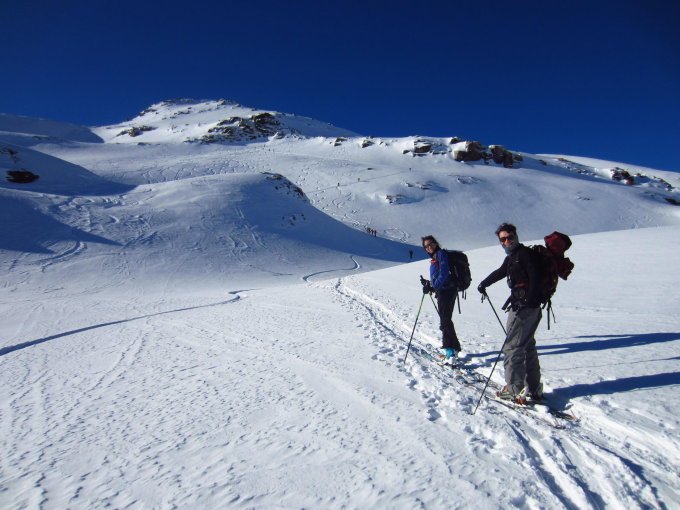 Sehr viele Leute unterwegs, aber kein Wunder bei diesen Top-Verhältnissen. Traumhafte und noch nicht befahrene Abfahrt im besten Pulverschnee abseits der meist gewählten Route.