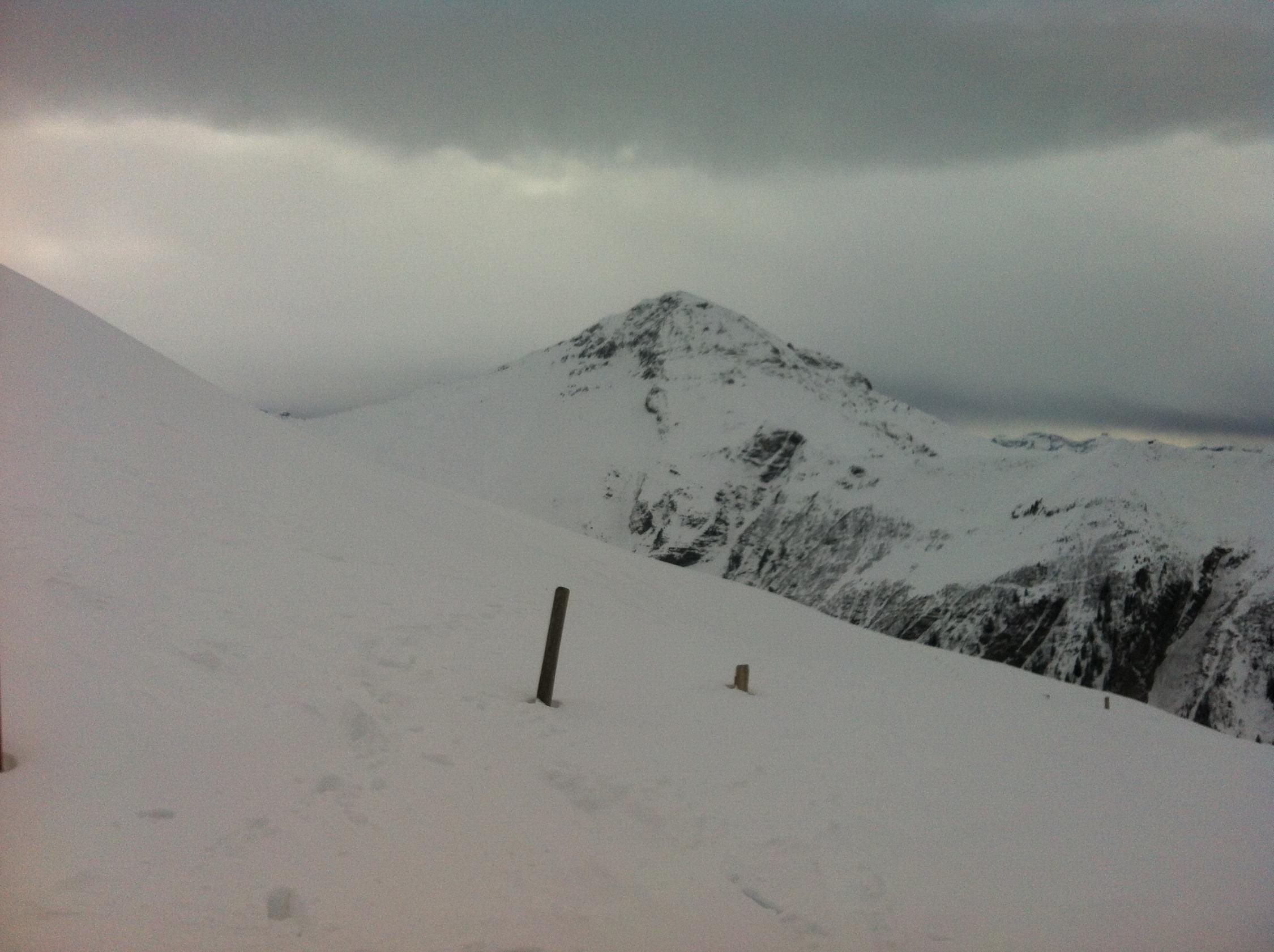 Abfahrt bis Alphütte Furggi und zu Fuss hoch bis Grimmifurggi. Ganze Abfahrt schöner Pulverschnee und bei defensiver Fahrweise kein Steinkontakt. Im steilem Waldstück nur kurz etwas Steine.