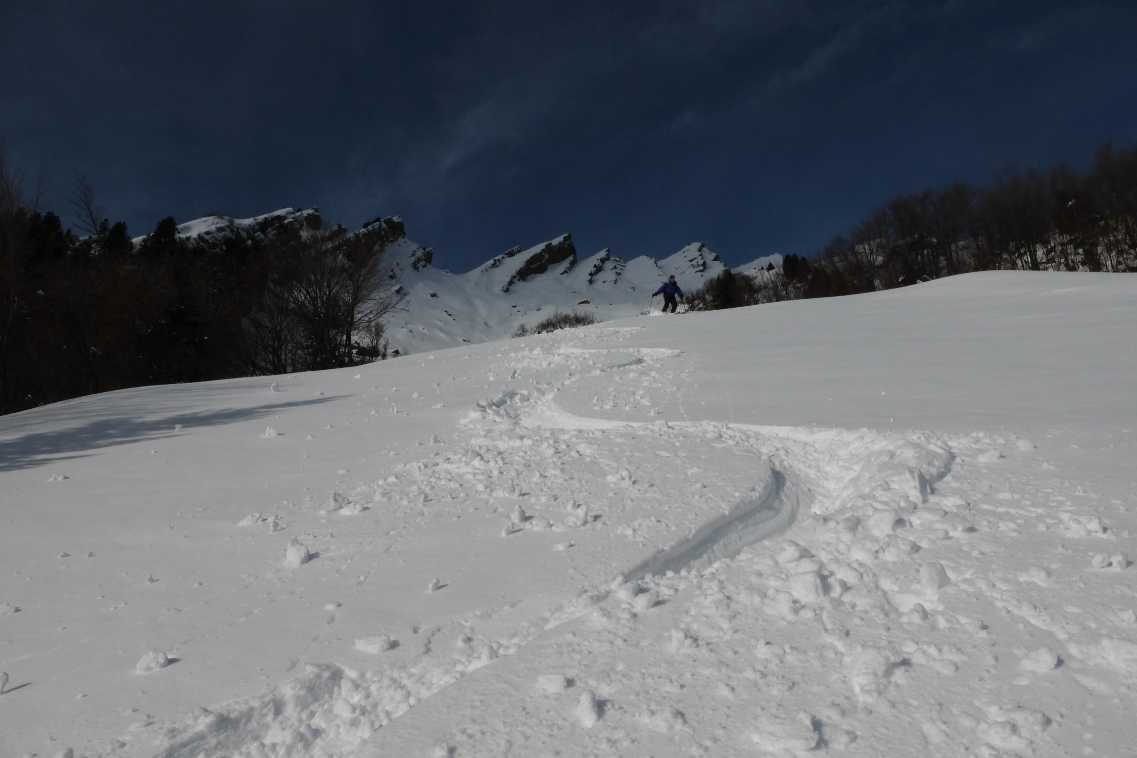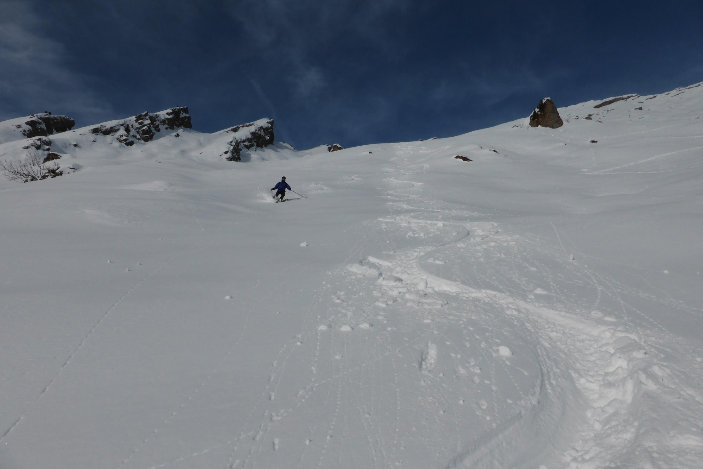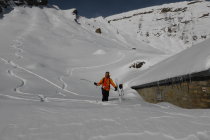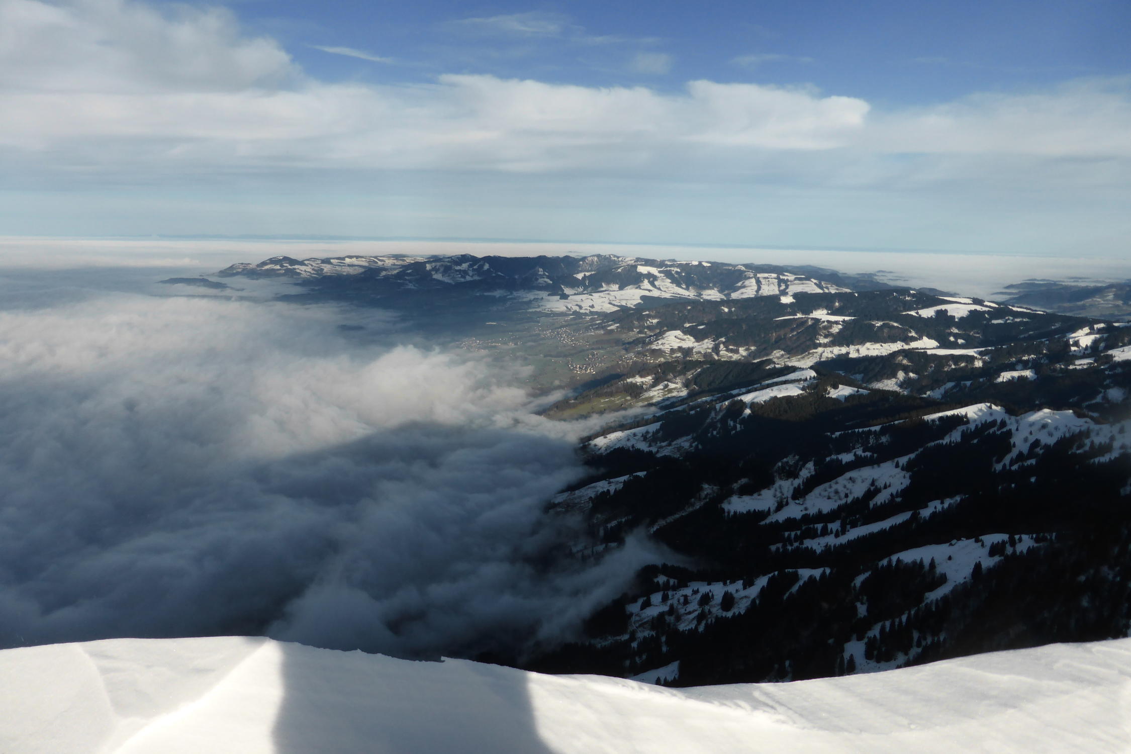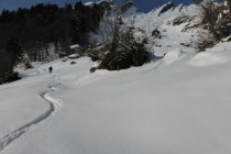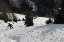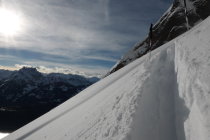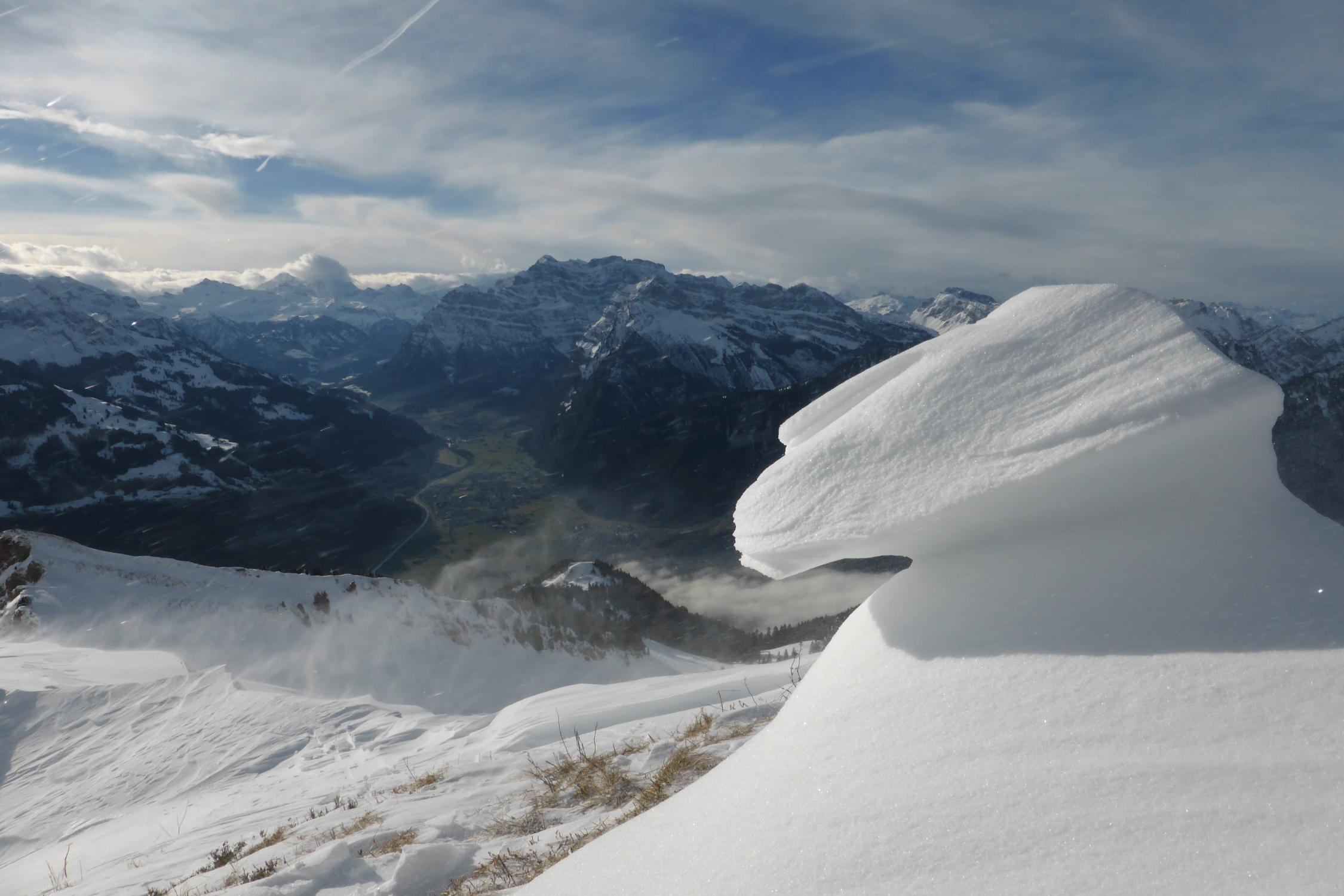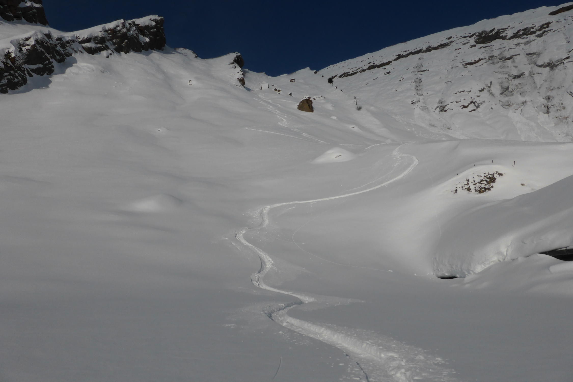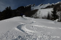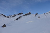 Pulver, in Gipfelnähe abgeblasen gegen 11 Uhr unterhalb 1500 an den Südosthängen schon etwas feuchter Schnee.