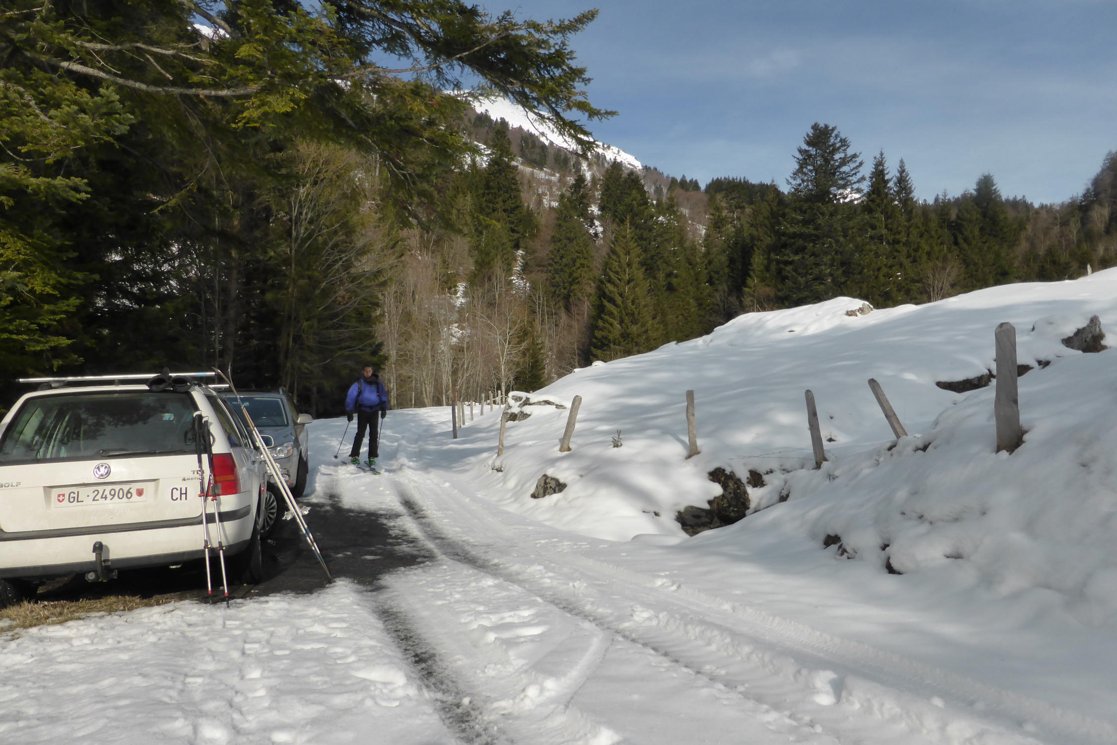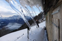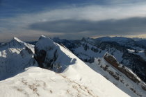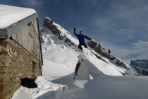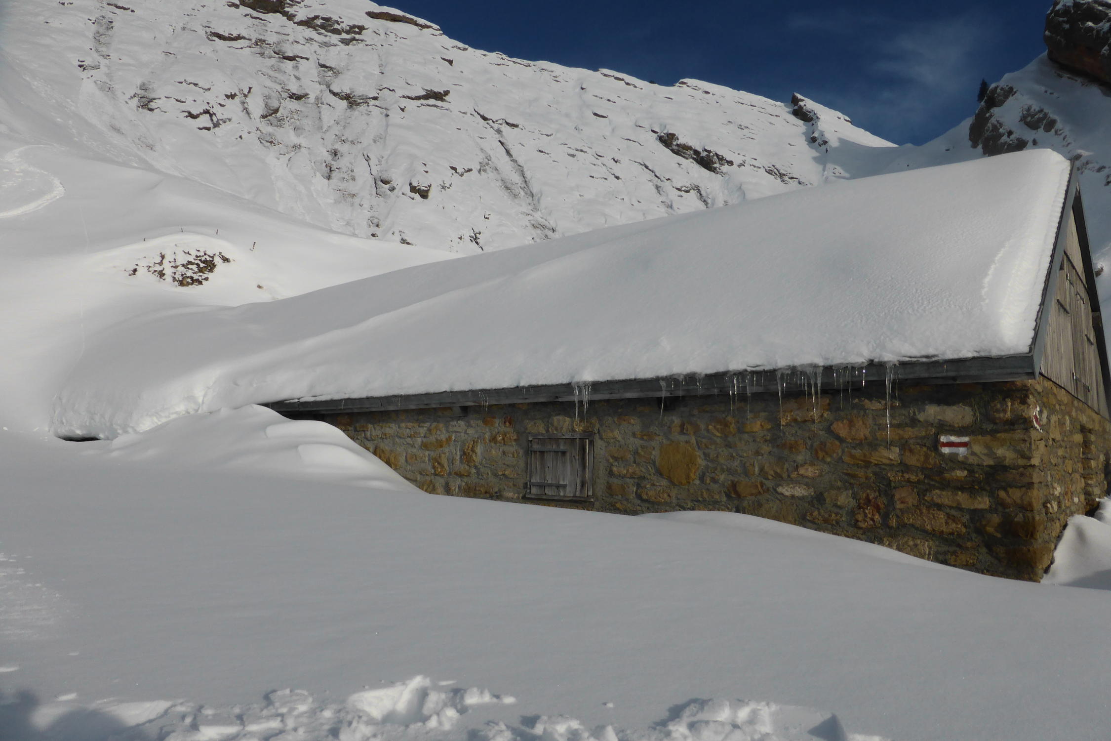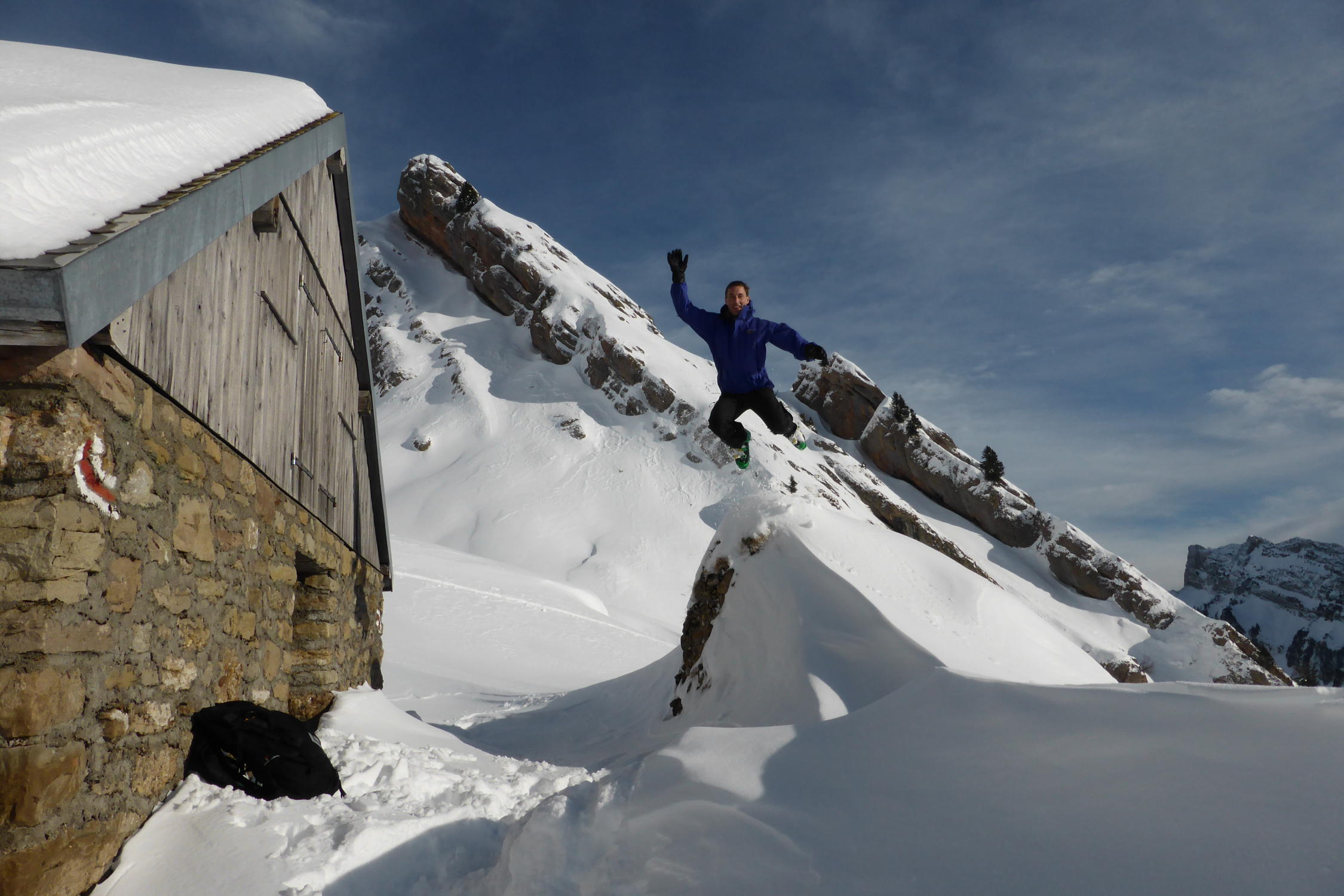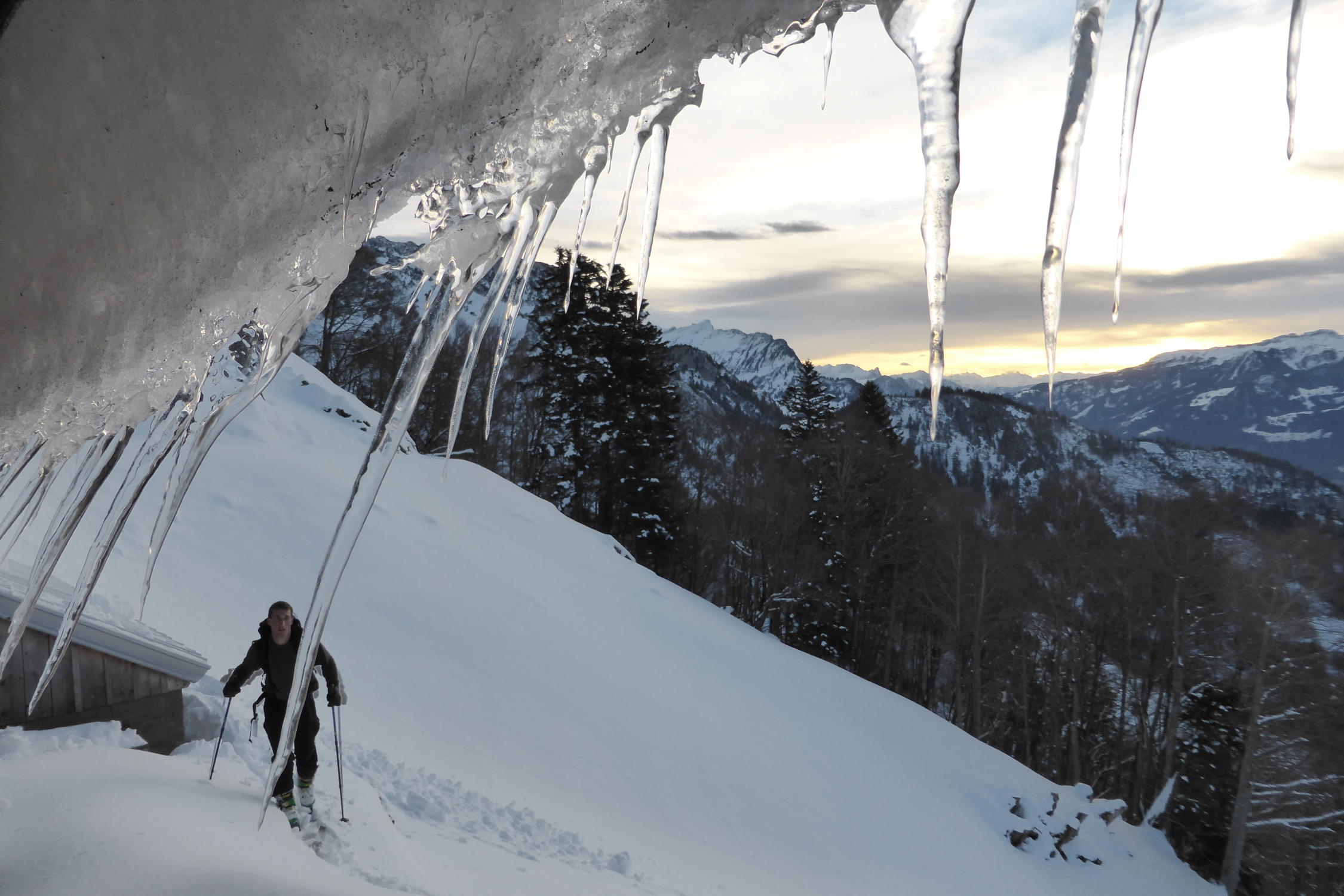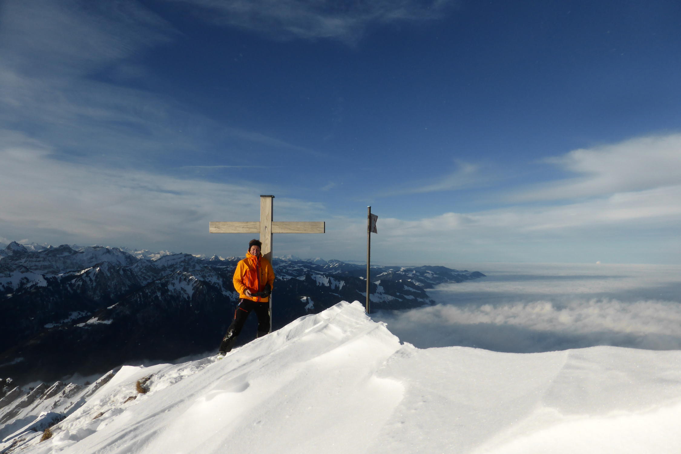 Pulver, in Gipfelnähe abgeblasen gegen 11 Uhr unterhalb 1500 an den Südosthängen schon etwas feuchter Schnee.