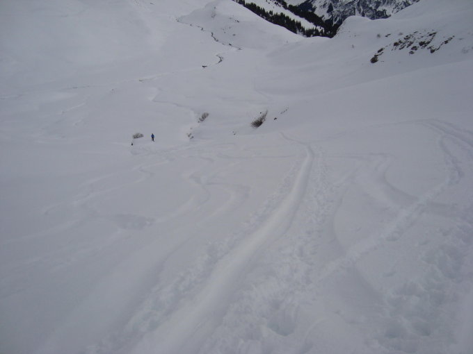 Heute bewölkt,vereinzelt Sonnenschein. Es hat zwischen 10 und 30cm Neuschnee im Gebiet, dieser ist zum Teil nur mässig mit der Altschneedecke verbunden. Am Gipfelhang und im Wischbäächtal sind Steinkontakte leider noch an der Tagesordnung. Im Hang unterhalb Wart schöner Traumpulver. Im Wald (Abfahrtssinn) oberhalb der Schwarzwaldalp ist es sehr zerfahren. Sehr starker Föhnsturm auf dem Gipfel.