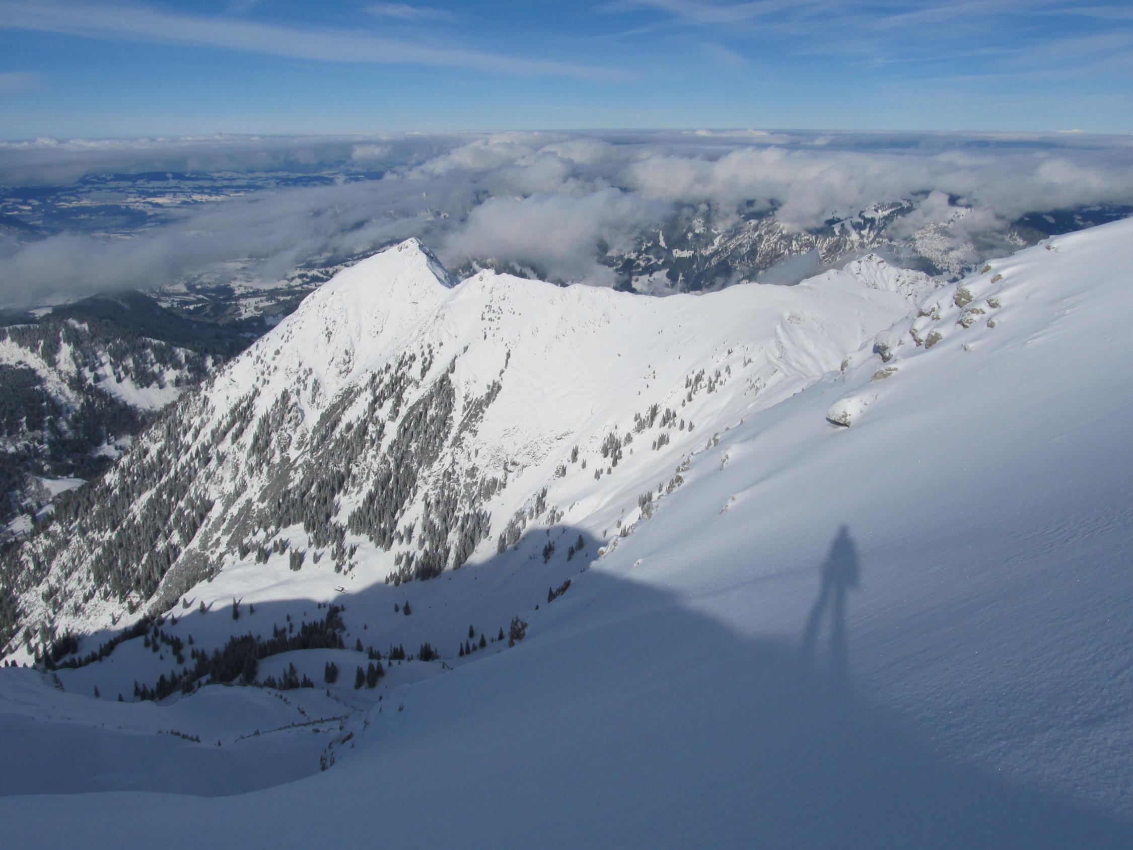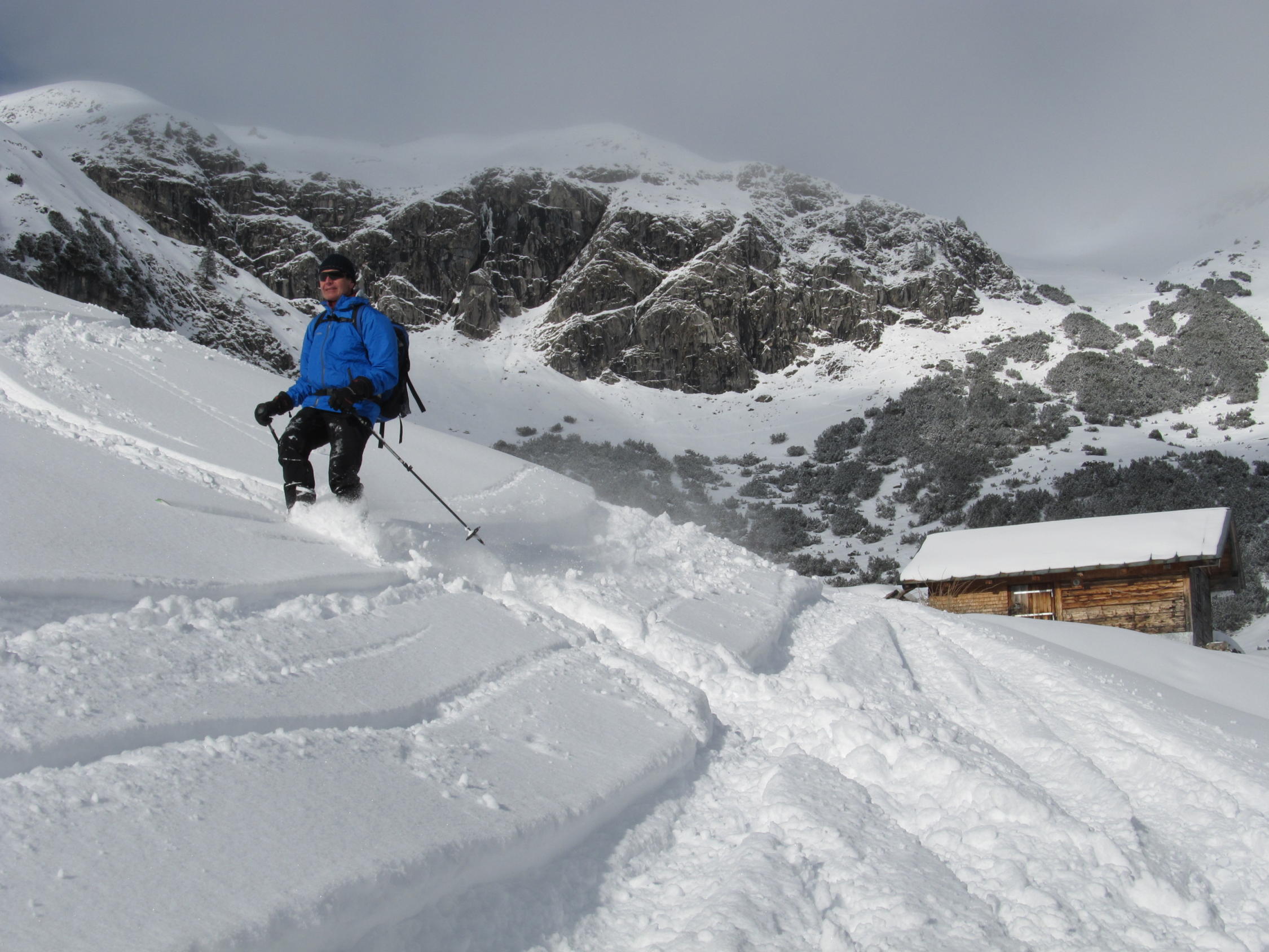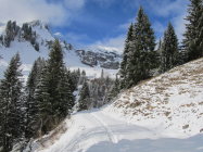 Bis zur Käseralpe 1.400m Neuschnee vom Freitag auf Gras ohne Unterlage, da Südhang.