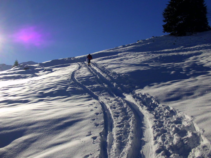 Unten ca 15cm ab Schlund bis 40cm Neuschnee, oberhalb der Waldgrenze z.t verblasen...daher muss nach wie vor auf verdeckte Steine geachtet werden. Ist jedoch bei guter und vorausschauender Routenwahl problemlos machbar.