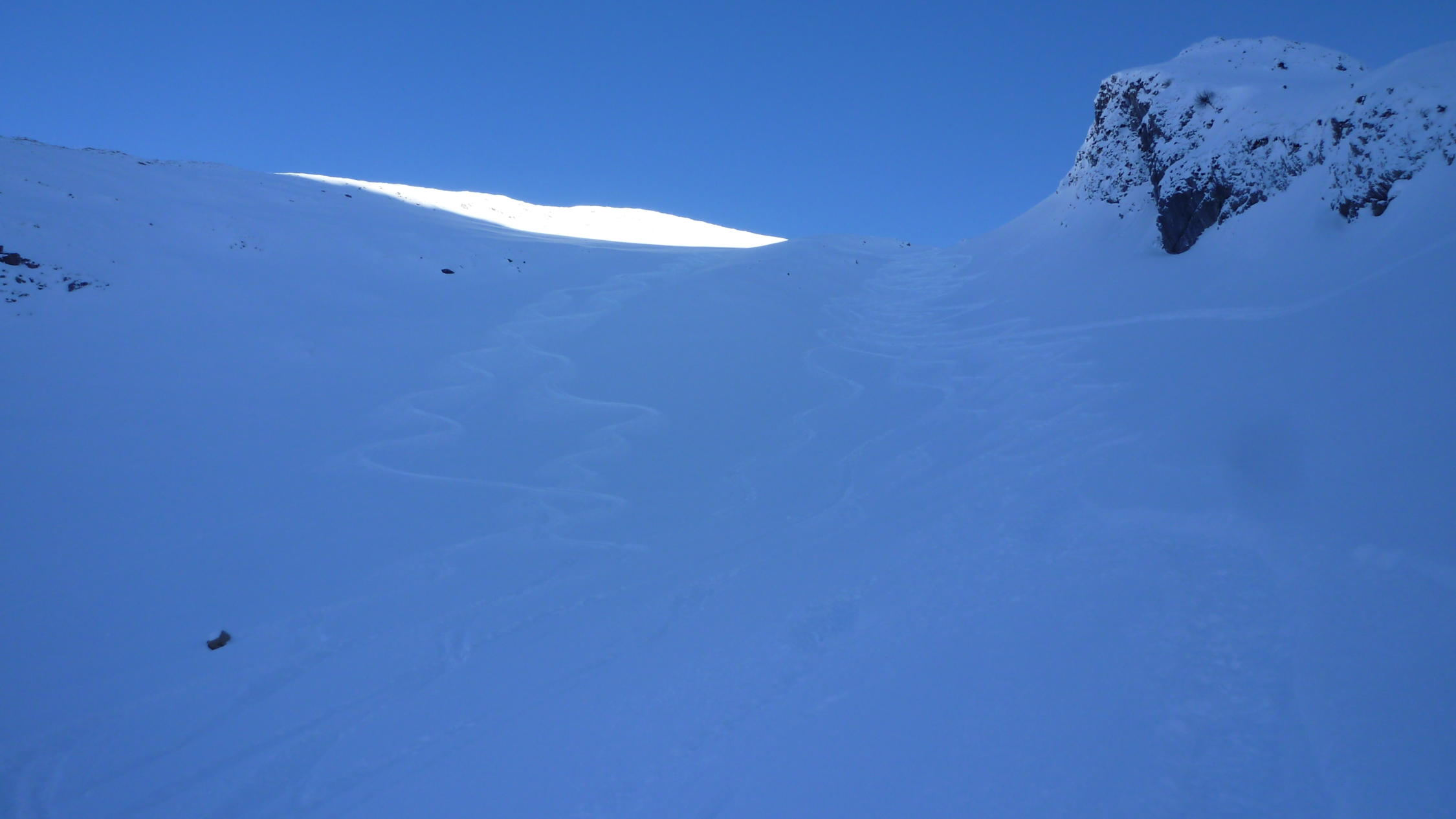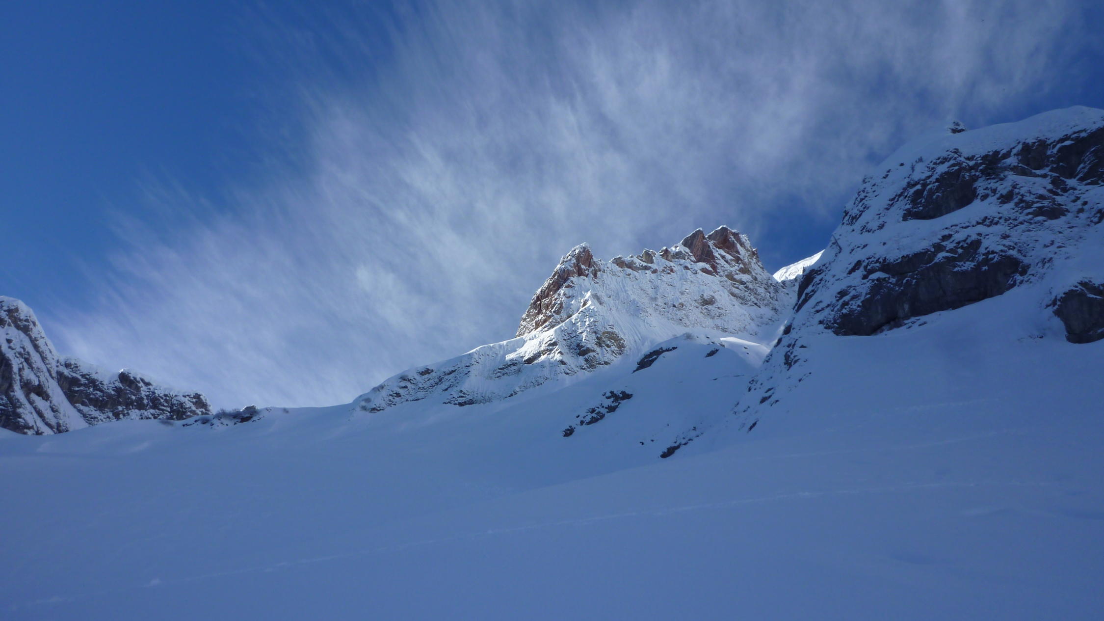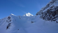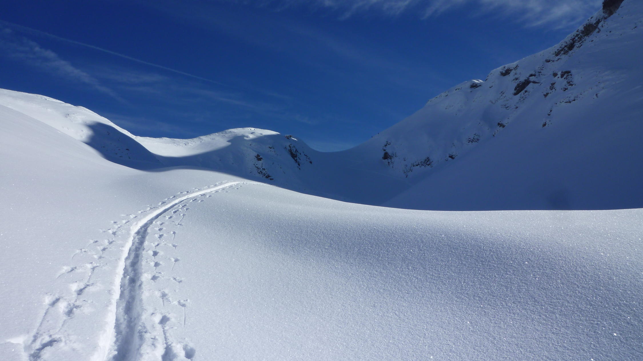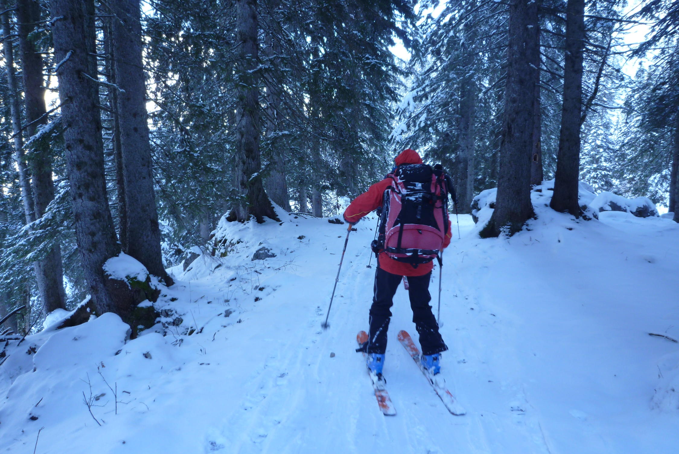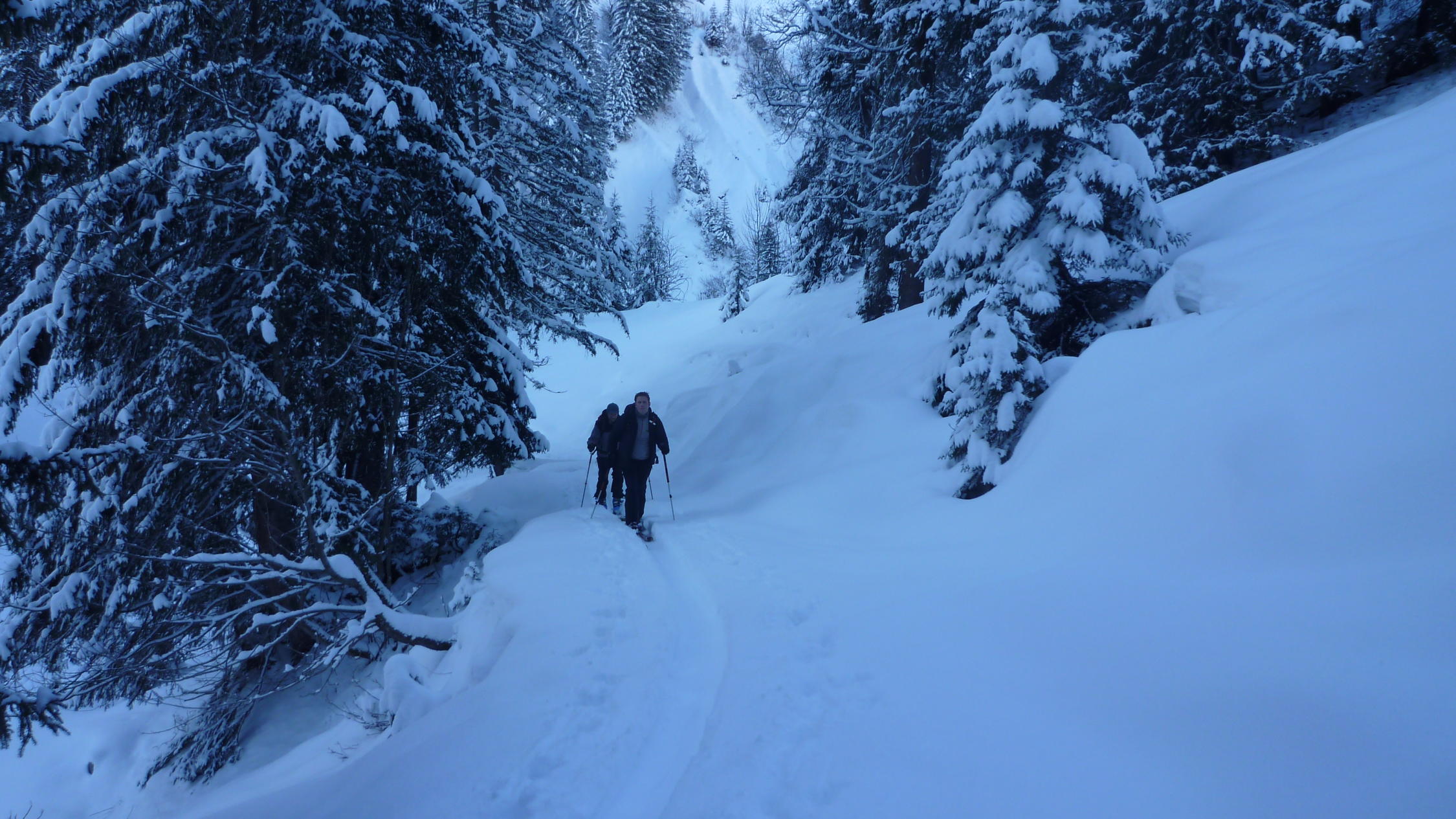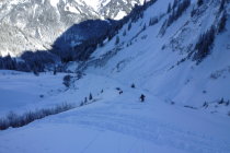Auf dem Forstweg im Wald für den Aufstieg genug, für die Abfahrt im unteren Bereich zu wenig Schnee.Ab der Baumgrenze 20-30 cm bester Pulverschnee.