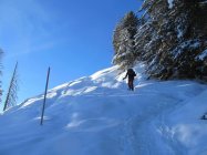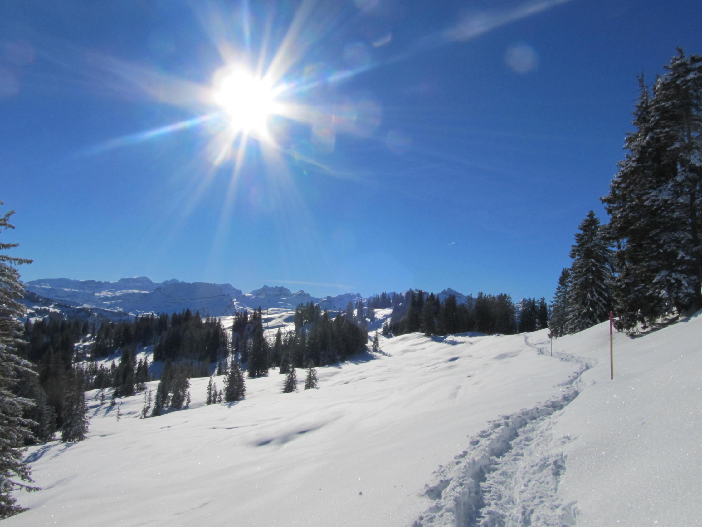Ein prächtiger Wintertag. Ca. 35 cm feinster Pulverschnee. Wolkenloser Himmel. Bei 12 Grad minus in Brunni gestartet. Die Schneeschuhspur von der Furggelen zum Furggelenstock folgte dem Bergwanderweg. Lediglich unter dichten Waldpassagen noch wenig Schnee vorhanden, ansonsten war die Landschaft satt eingeschneit. Im Bereich Zwäcken kreuzt man das Skigelände. Herrliches 360°-Panorama