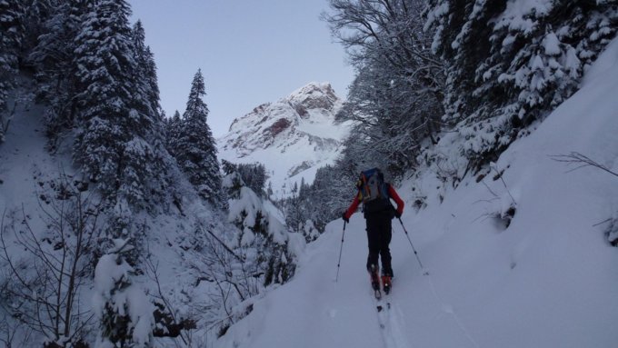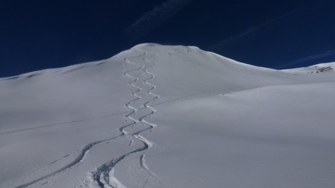 Es hatte ungefähr 20cm - manchmal auch mehr - neuen Pulverschnee und ein strahlend schöner Tag erwartete uns. Bis unter den Giglturm spurten wir vom Landsteg hinauf. Die zwei Tourengeher, die uns einholten, erledigten den Rest bis zum Gipfel - danke Euch! Wir konnten ohne Steigeisen und Bickel auf den Gipfel; aufpassen muss man auf dem exponierten Aufstieg jedoch immer. Auf dem Gipfel bot sich uns eine eindrückliche Rundsicht und es hatte kaum Wind.