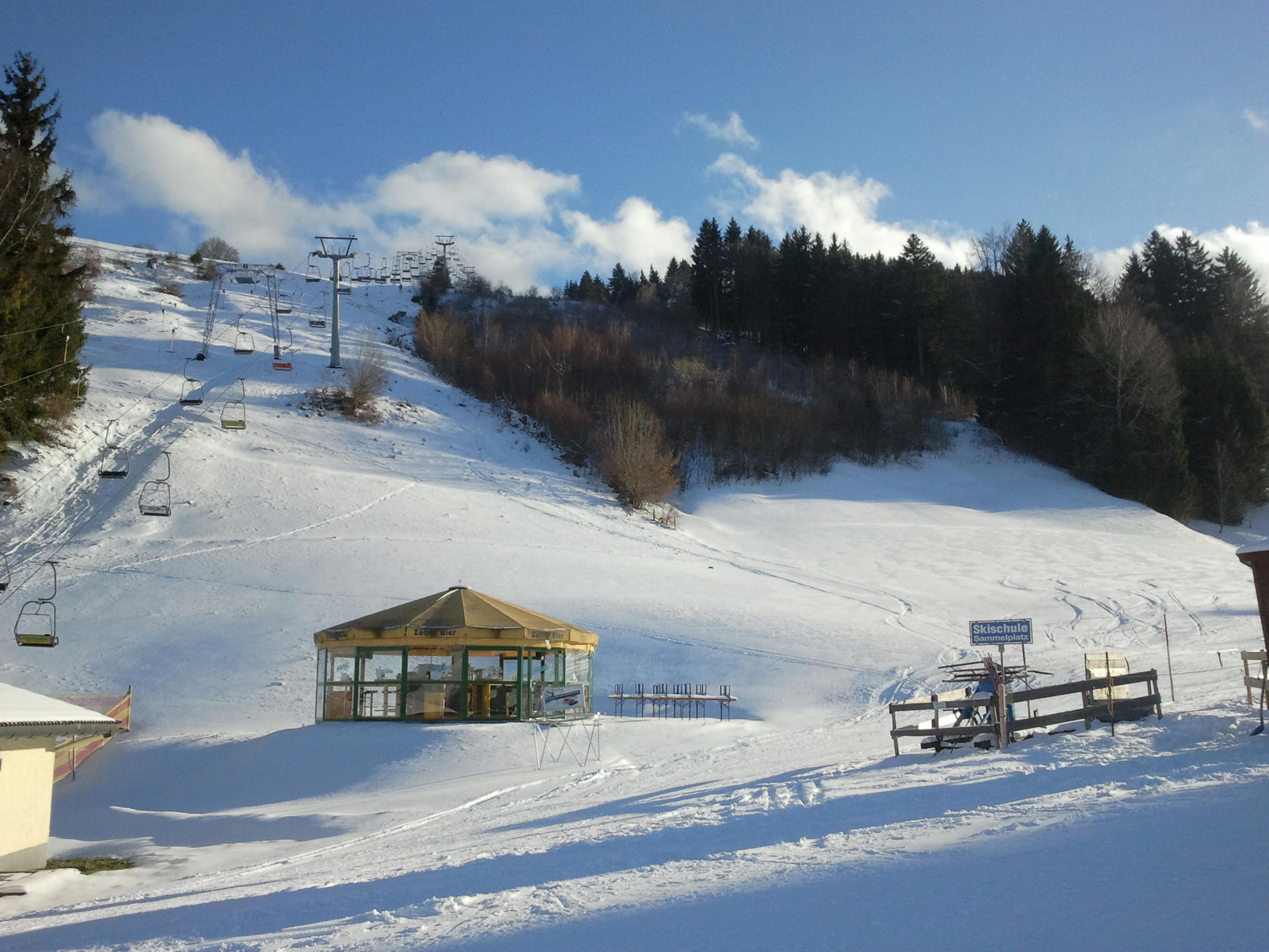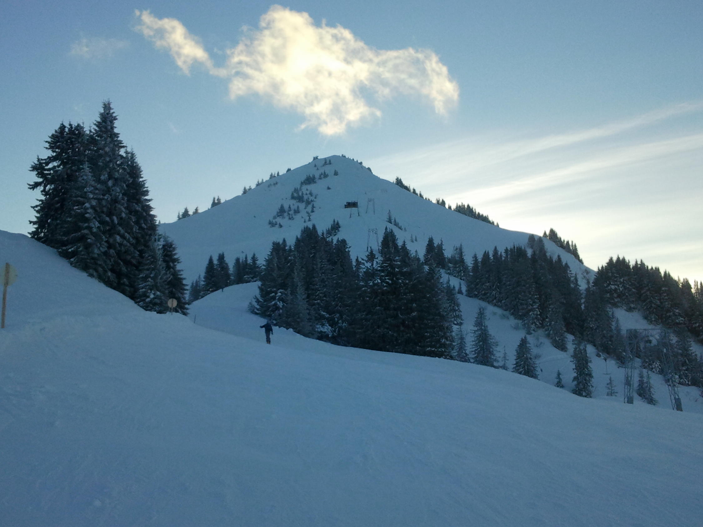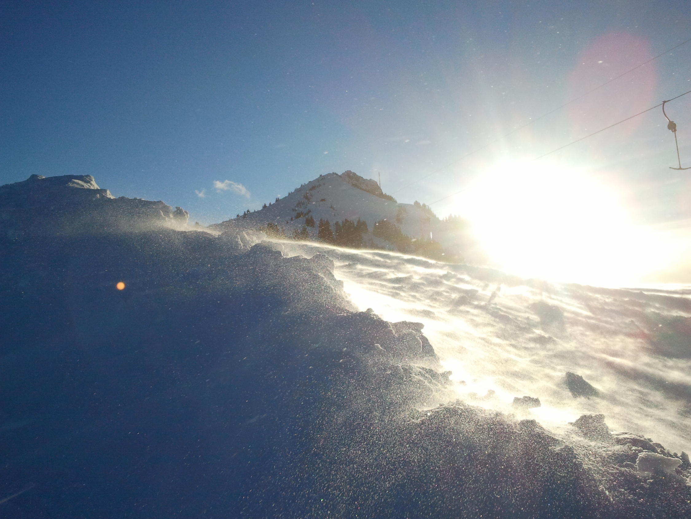 Der wenige Schnee, der seit gestern bis heute Mittag gefallen ist, wurde durch starken Wind bzw. Sturmböhen aus westlichen Richtungen beinahe vollständig verweht. Die Skipiste macht bis auf die untersten 150Hm (keine Altschnee-Unterlage) einen recht guten Eindruck. Ab Höhe Talstation Gipfellift war's sehr windig und zapfig kalt. Im ostseitigen Gipfelhang bis zu 30cm eingewehter, bereits zerfahrener Schnee, der uns daher keine Sorgen machte.