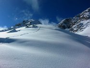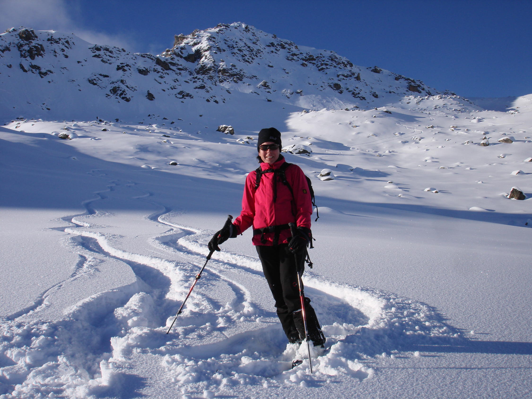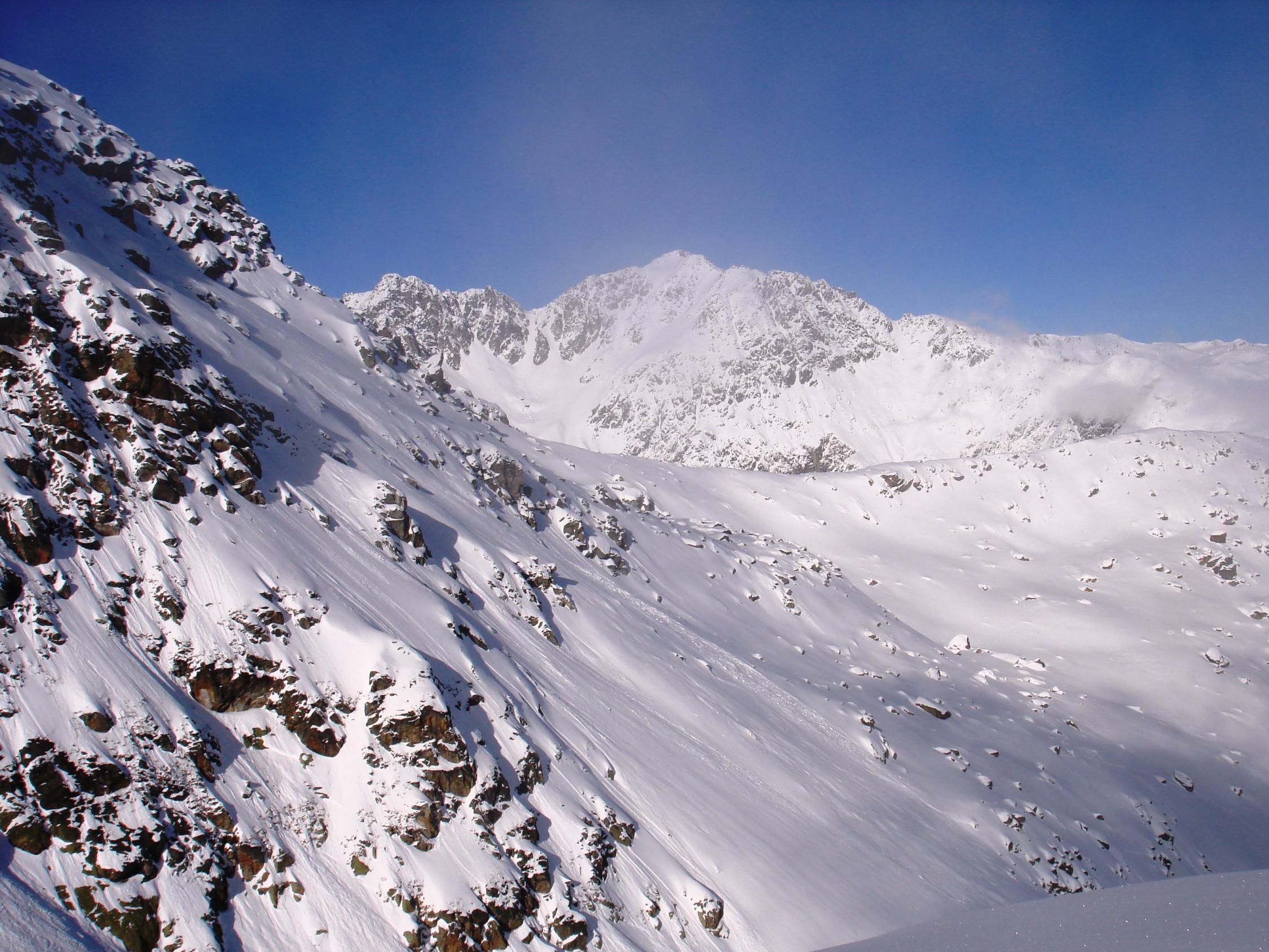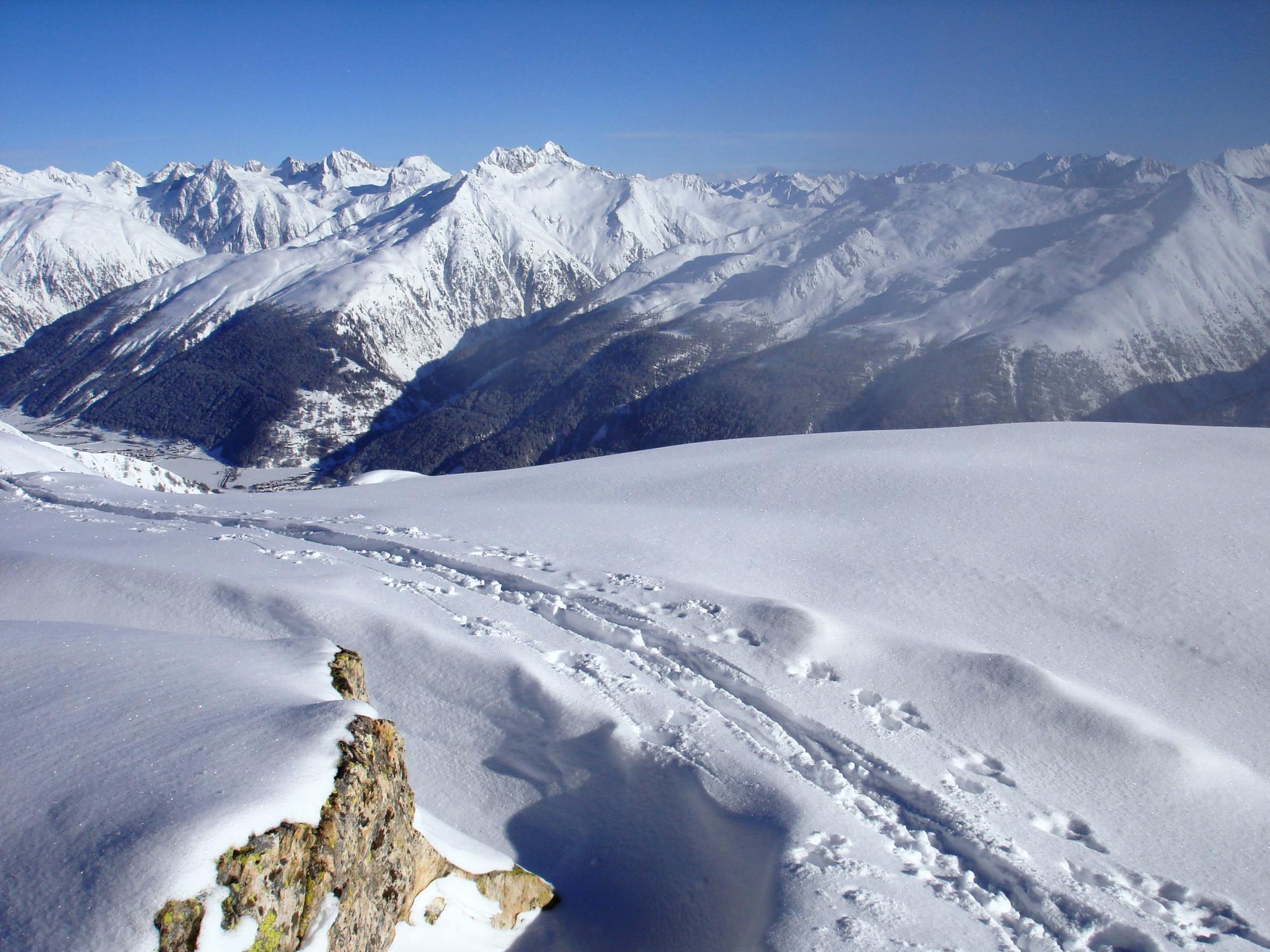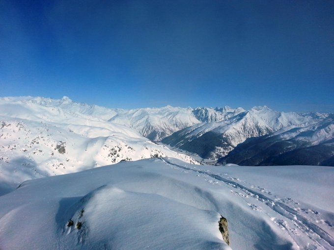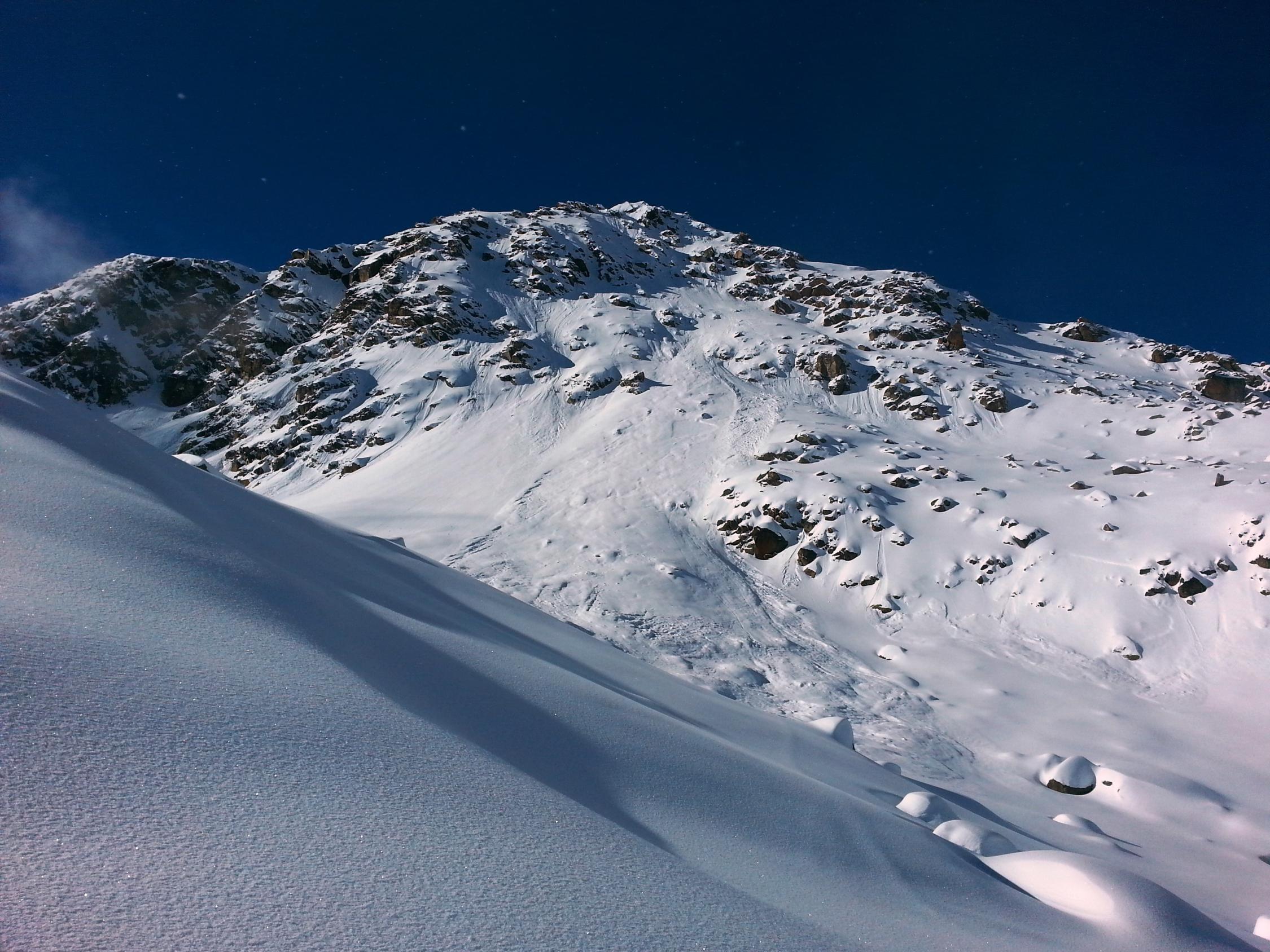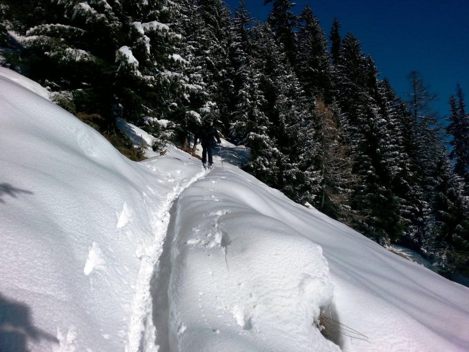 Allerbester Pulverschnee vom Talgrund bis zum Gipfel. Keine Verwehungen, kein Windharst, absolut perfekt. Überall genügend Schnee, auch in den unteren Waldpartien. Gute Unterlage vorhanden, nirgends Steinkontakt gehabt.