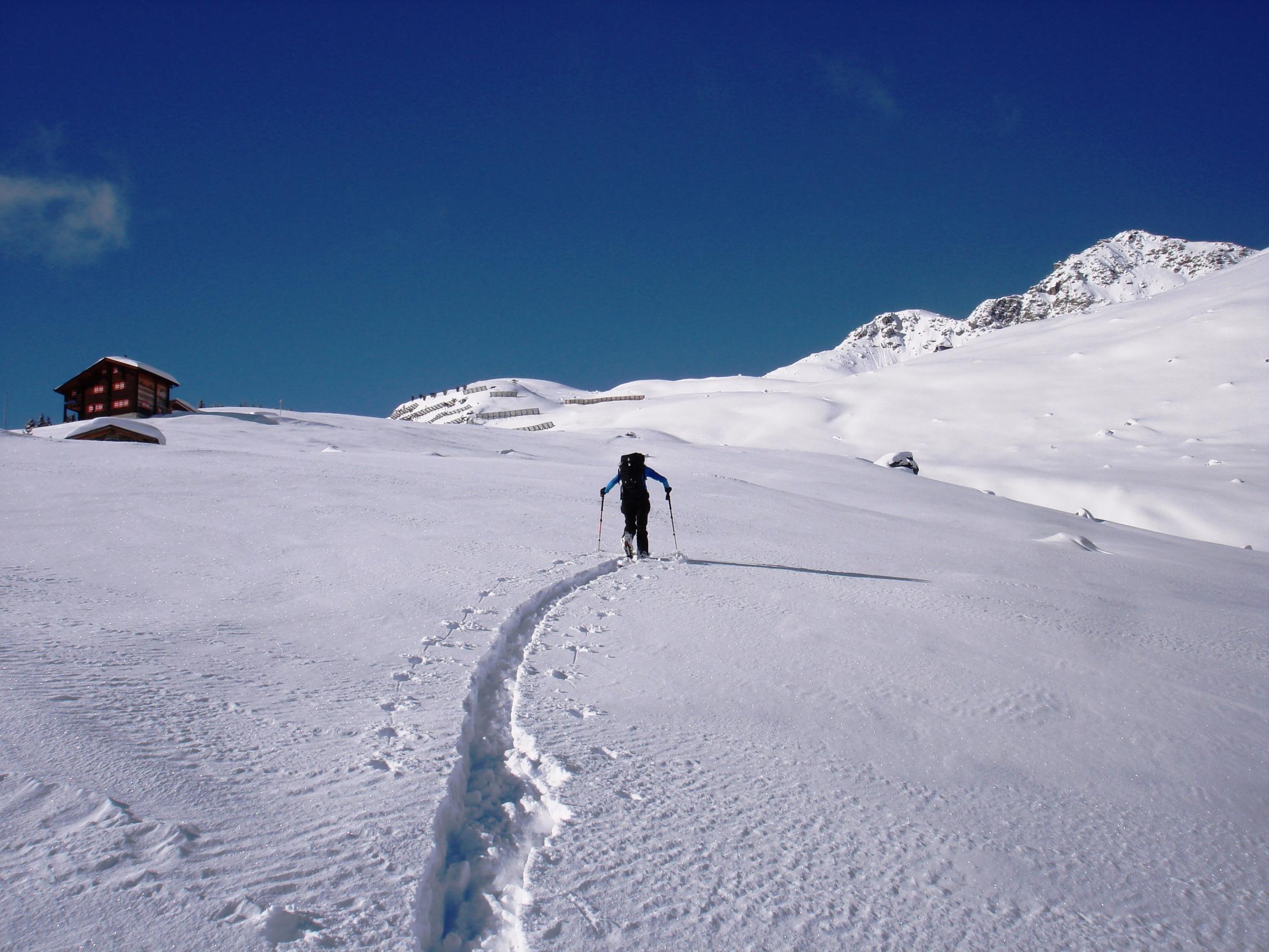 Keine Personen unterwegs, Spurarbeit geleistet von A bis Z. Dafür waren wir die ersten, die Abfahrtsspuren in die unverspurten Hänge legen konnten, es war der Hammer. Die Galmihornhütte bekam am Nachmittag Besuch von Schneeschuhläufern.