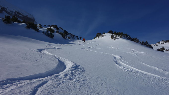 Stürmischer, kalter Föhn. Es liegt weiterhin wenig Schnee in der Gegend. Der ca. 20 cm frische Pulverschnee der letzten Tage wurde in Rinnen und Mulden verfrachtet, dadurch sind die Felsen und Steine im oberen Teil gut sichtbar. Dort wo zwischen den Felsen Schnee lag, kam man ohne Steinkontakt bei herrlich lockerem Pulverschnee durch. Im windgeschützten unteren Teil im Wald dann traumhafter unberührter Pulverschnee.