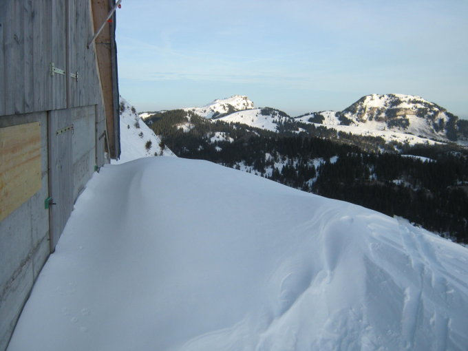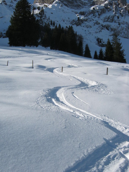 Generell liegt im Wägital nicht sehr viel Schnee. Etwas entgegen kommt der Diethelm-Tour die Exposition Nord-Ost. Wir hätten erwartet, dass der Schnee mehr vom Wind bearbeitet wurde. Doch allgemein herrschen mehr als passable Verhältnisse: Pulver von 10 bis rund 30 Zentimeter auf der ganzen Tour. Durch die Sonneneinstrahlung kanns gegen Mittag schwerer zu drehen sein, früh starten war heute einmal mehr ein Vorteil (Abfahrt etwas nach 10 Uhr). Auf "Höhe 1400" (Schlänggen) habe wir die Spur horizontal angelegt, man kann auch früher rechts hoch steigen. Der Gipfelaufstieg vom Skidepot über die Aluleiter und den Ketten entlang ist ohne Probleme zu bewältigen.
