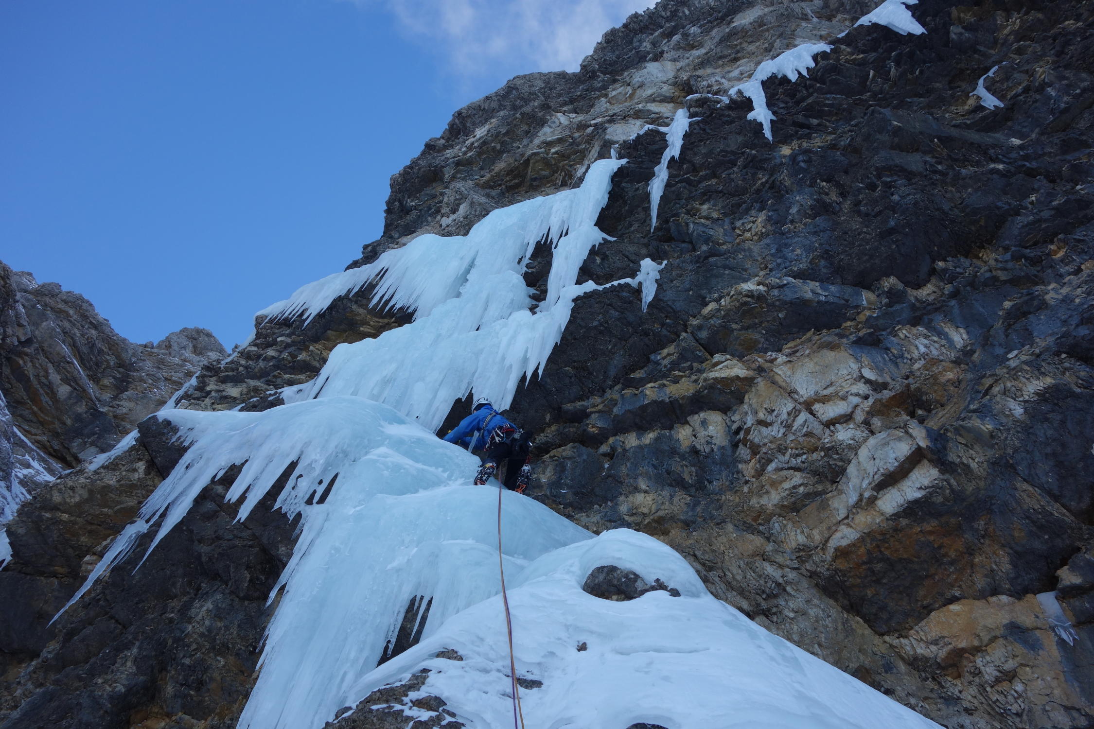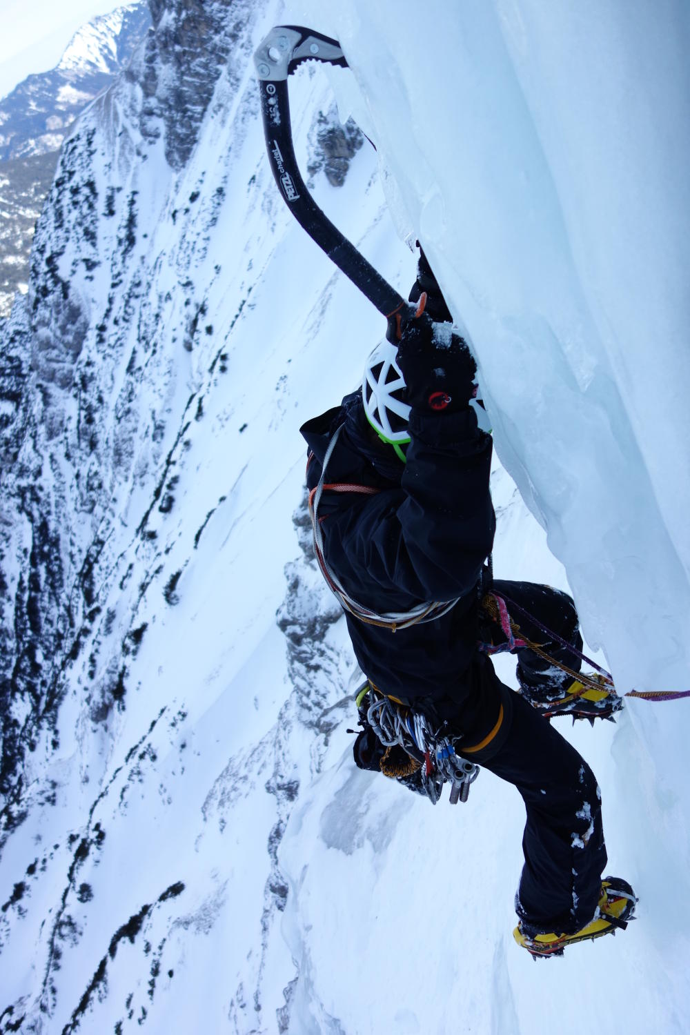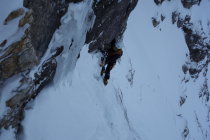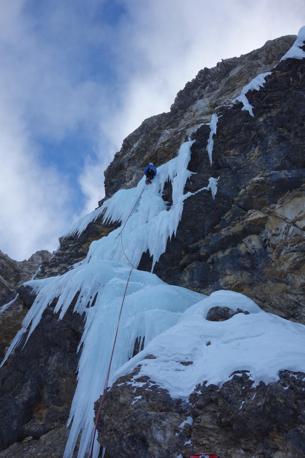 Verhältnisse: Auf lawinensichere Verhältnisse sollte unbedingt geachtet werden. Gute Eislage macht die Route einfacher und sicherer; vermutlich degeneriert die plattige erste Mixed-Passage bei starker Eislage zur reinen WI 4.