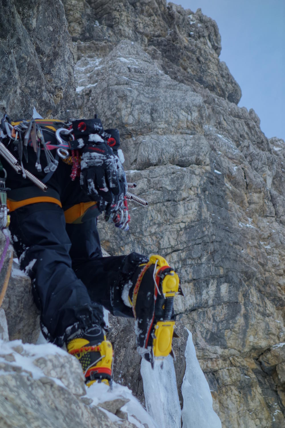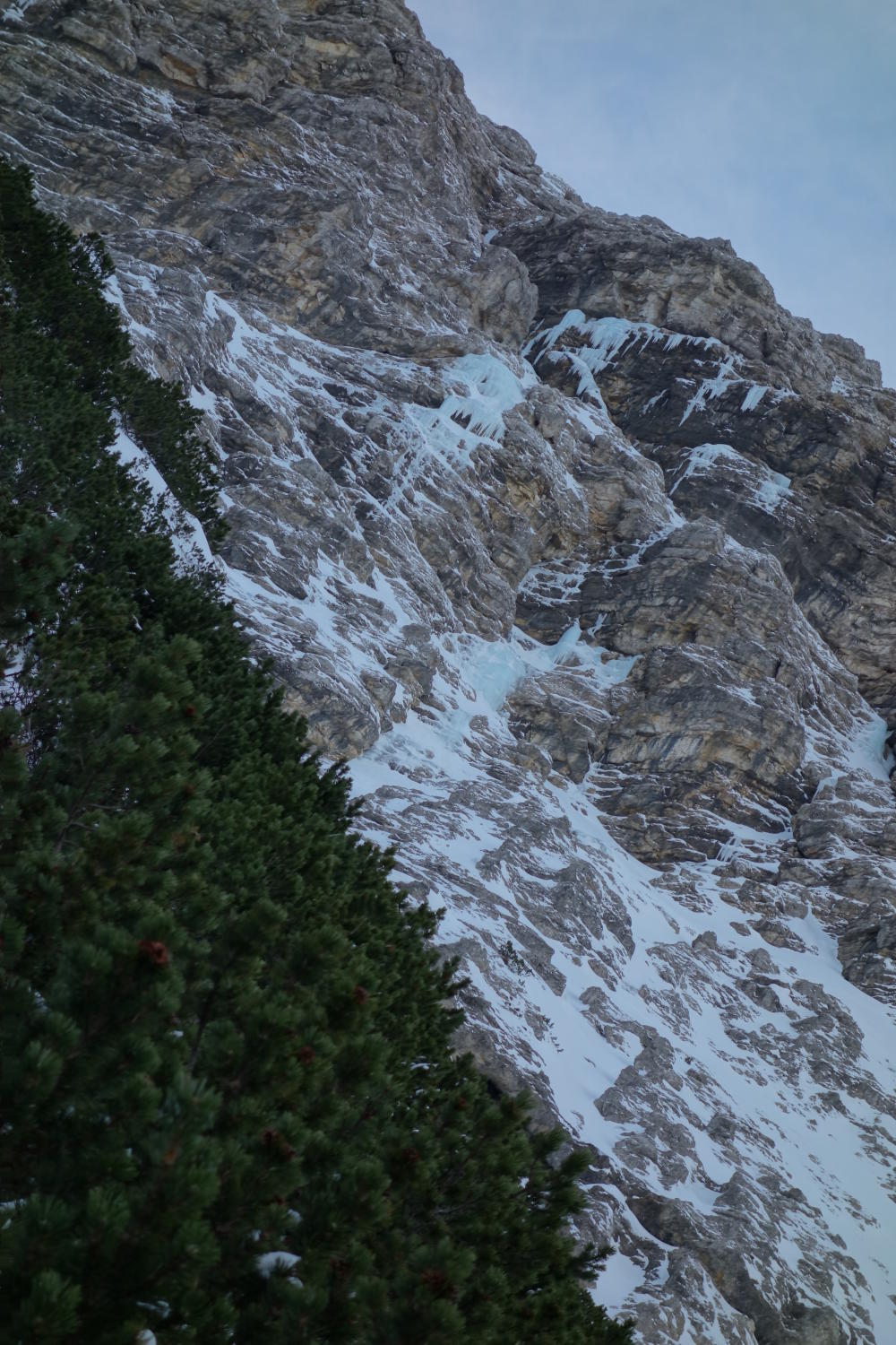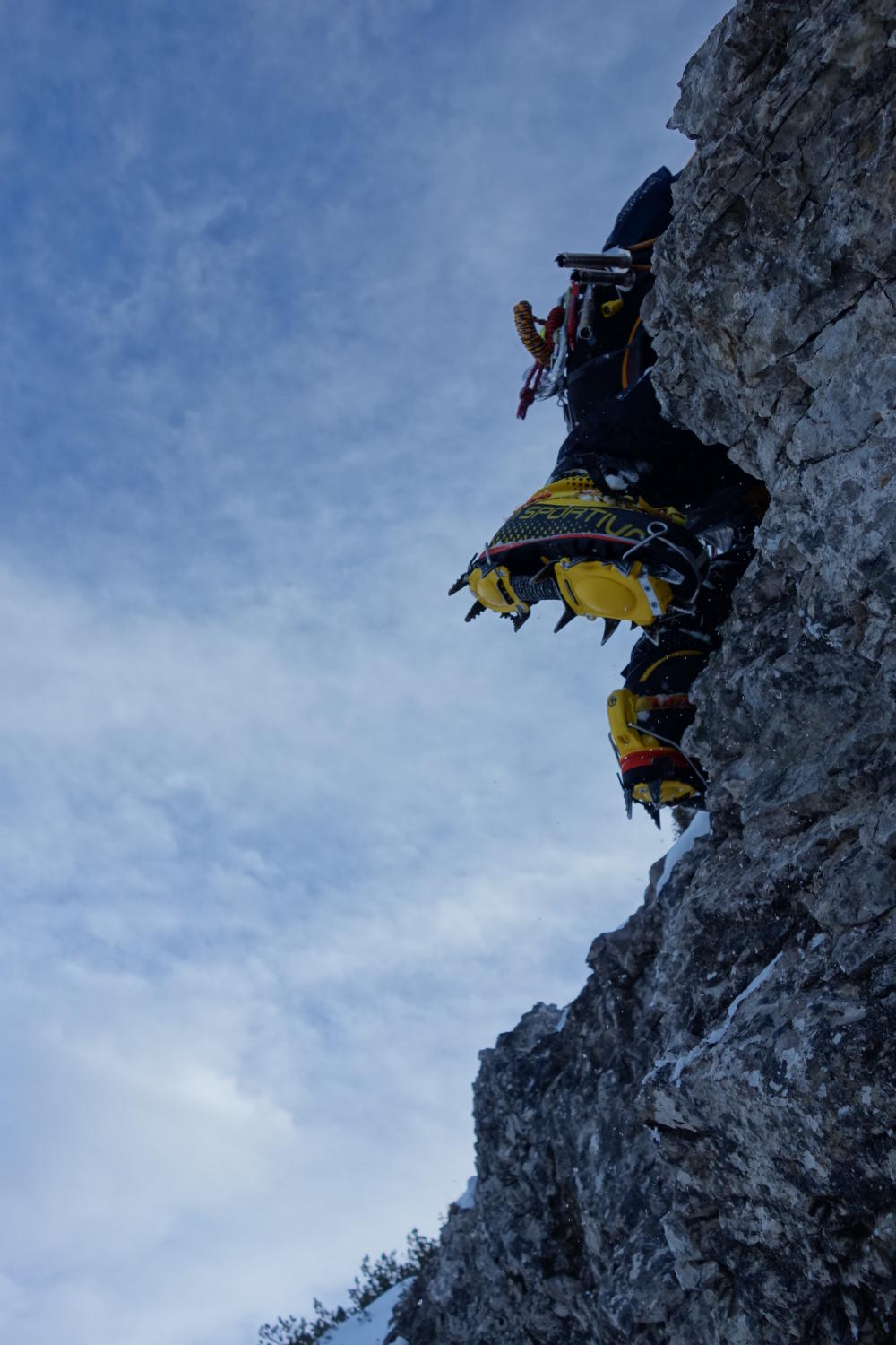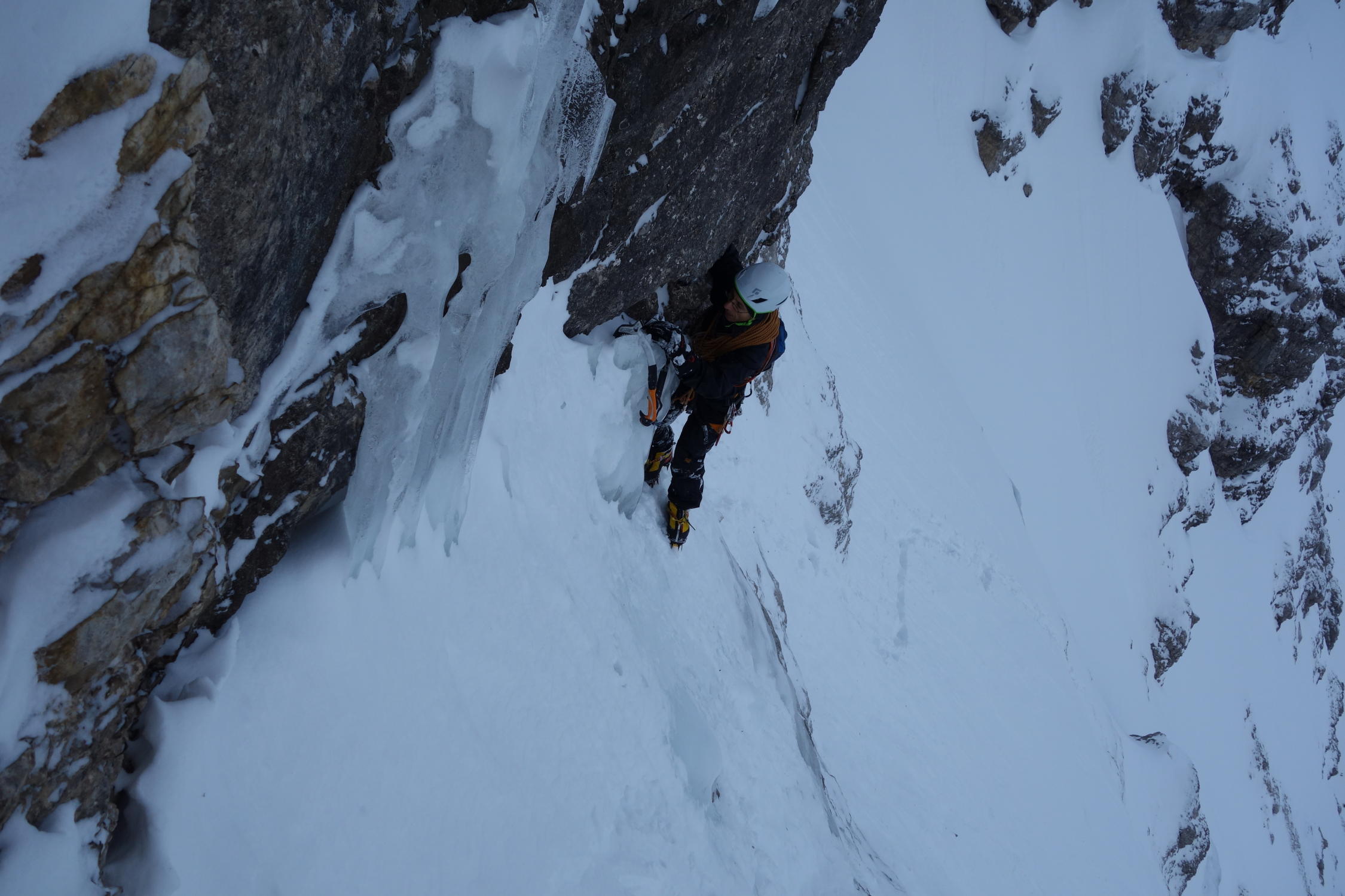 Verhältnisse: Auf lawinensichere Verhältnisse sollte unbedingt geachtet werden. Gute Eislage macht die Route einfacher und sicherer; vermutlich degeneriert die plattige erste Mixed-Passage bei starker Eislage zur reinen WI 4.