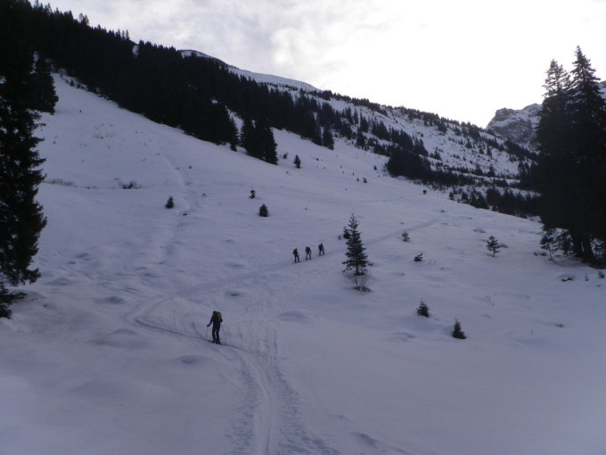 Auch in diesem Gebiet relativ wenig Schne, die Route ist jedoch ab Sagi mit Skis durchgehend begehbar. Im Aufstieg (speziell im Bereich ab Alp Hohniesen) recht windgepresster Schnee mit teilweise (wenigen) abgeblasenen Stellen.