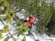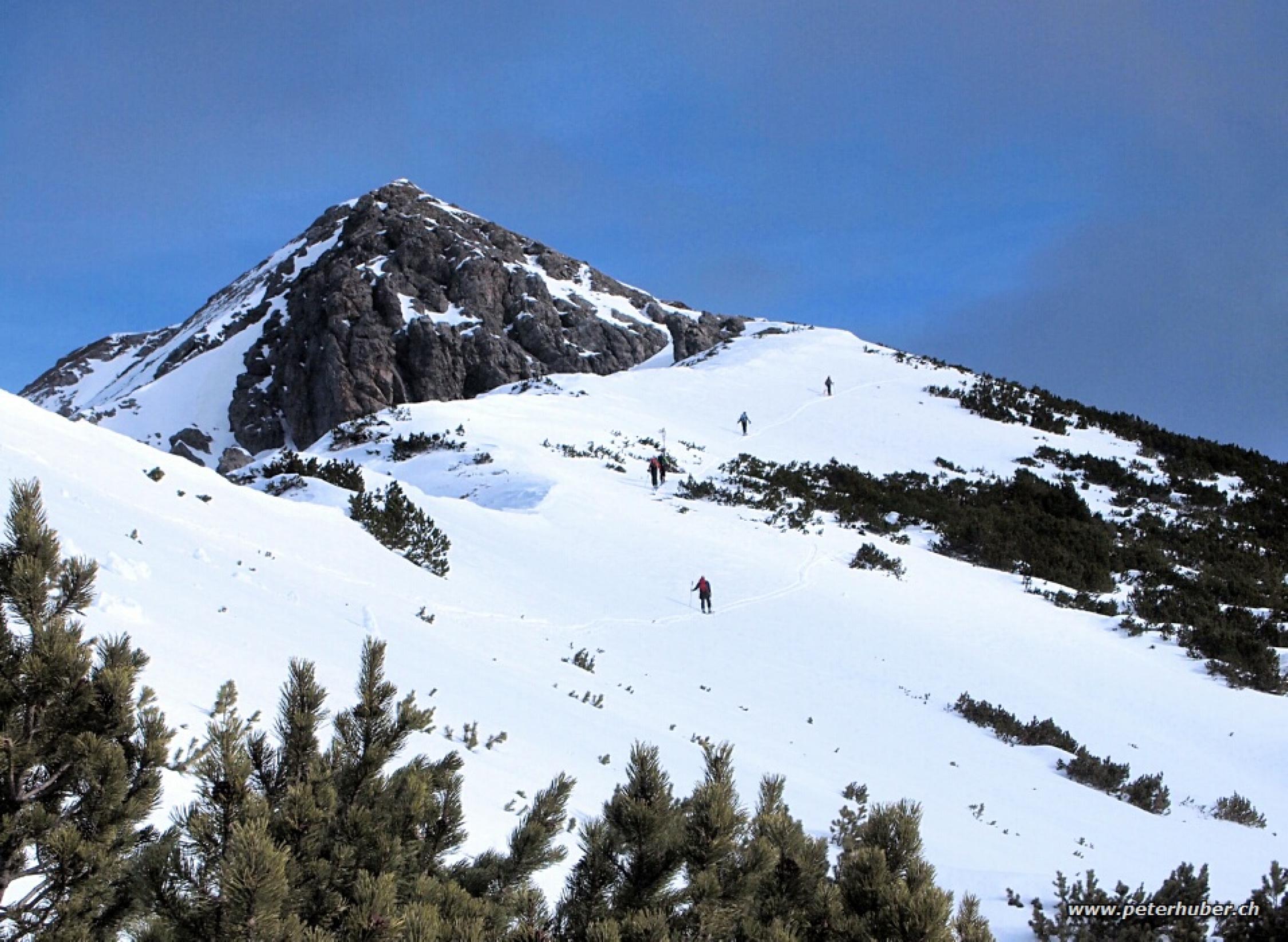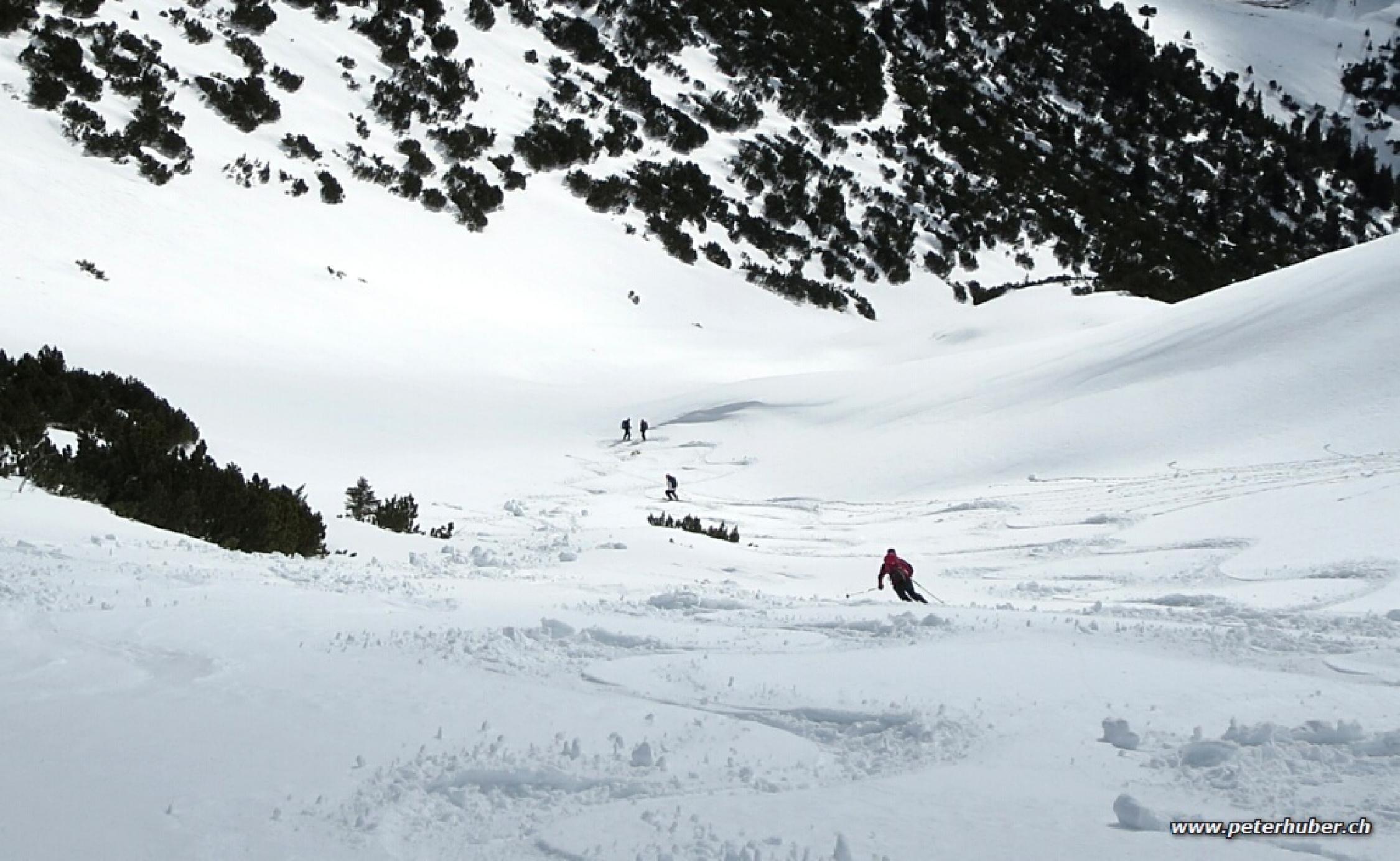 Sowohl der Aufstieg via P1868 und P2028 als auch die direkte Südabfahrt vom Gipfel führen durch dichte Legföhrenabschnitte. Da wächst bald die Skitourenschneise zu.