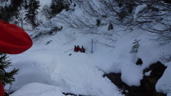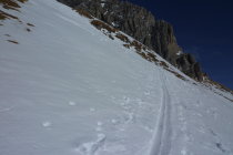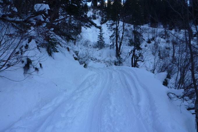 Ausreichend Schnee auf dem Forstweg im Aufstieg und auch für die Abfahrt. Feuchter Frühjahrsschnee