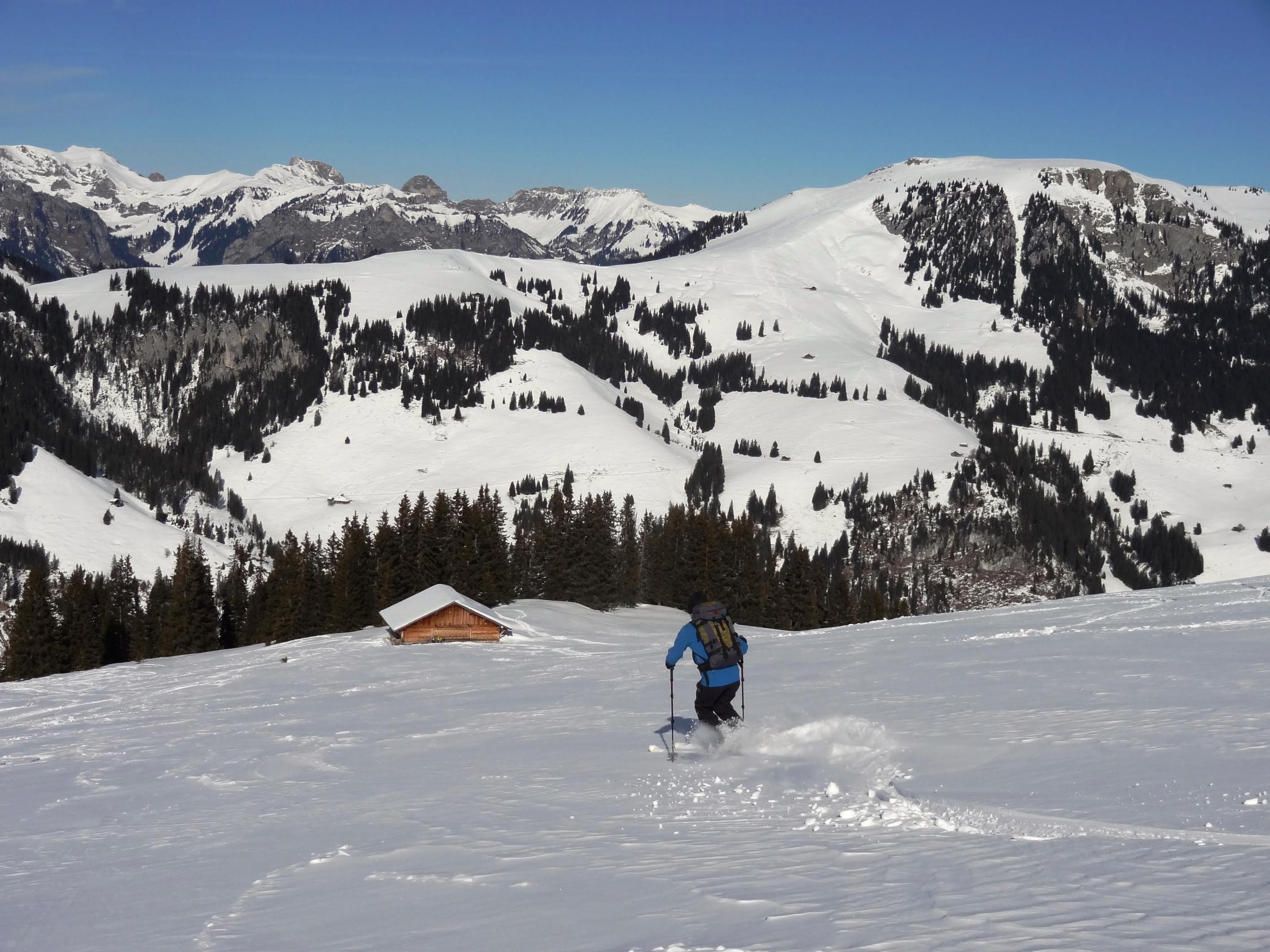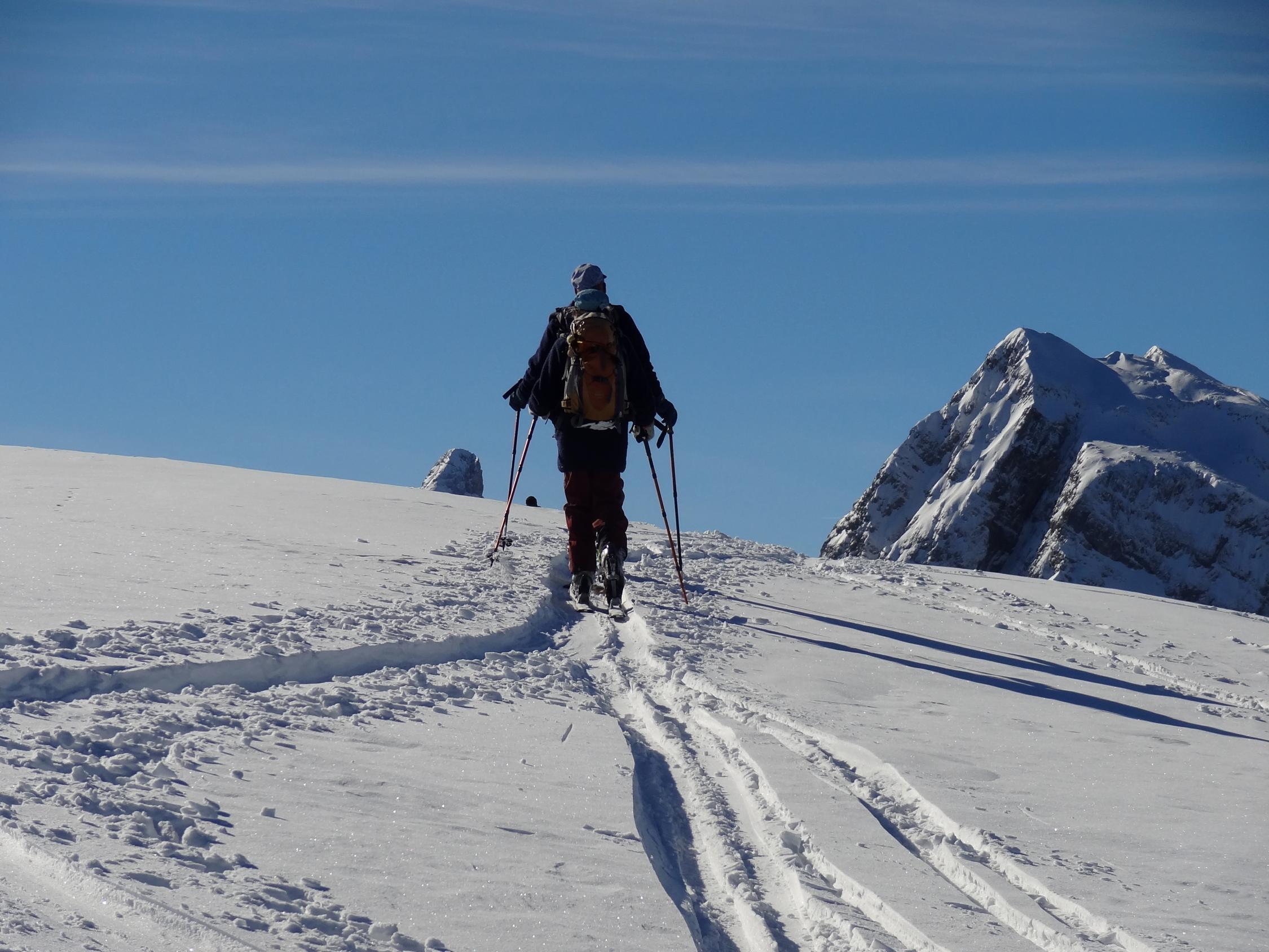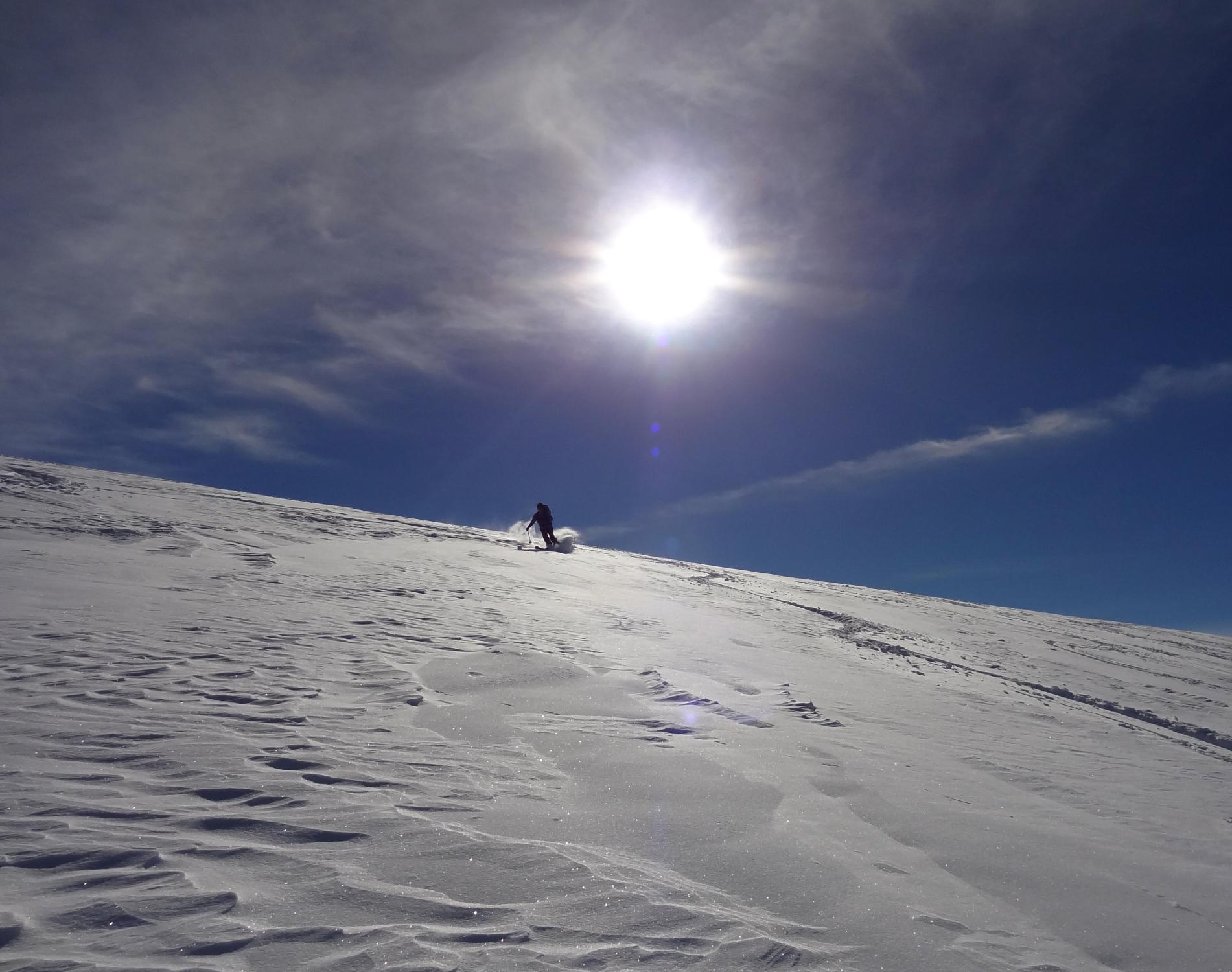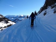 Meniggrat. Klein aber fein. Absolut keine Lawinengefahr, genügend, gut fahrbaren Schnee und ausreichende Steilheit. Die alten, verdeckten Spuren haben, bei zügiger Fahrweise, praktisch nicht gestört. Wir haben noch genügend Freiraum für eigene, freie Schwünge entdeckt. Wie sich der starke Föhn auswirken wird, weiss noch Niemand. Die ideale Tour für Anfänger. Auch als Halbtagestour sehr beliebt. Die Aussicht auf dem Gipfel kann auch sehr Verwöhnte begeistern.