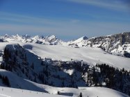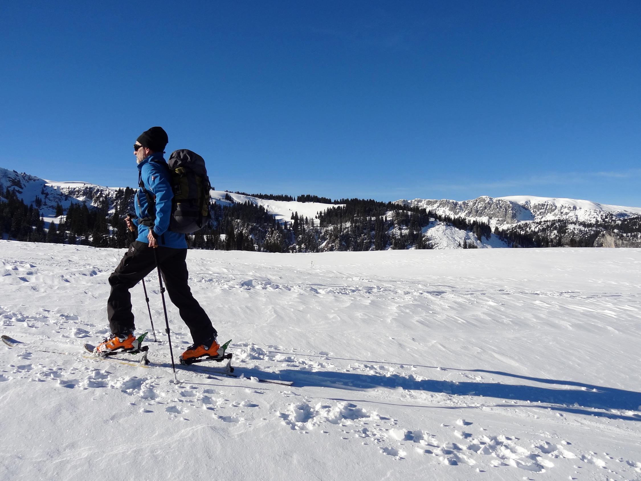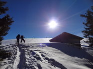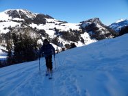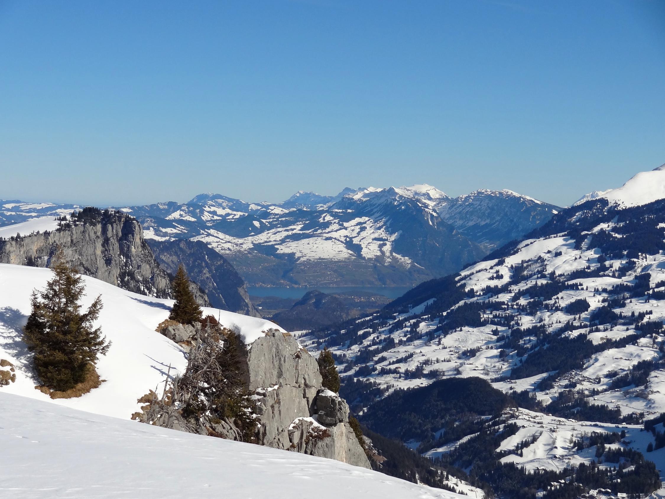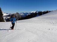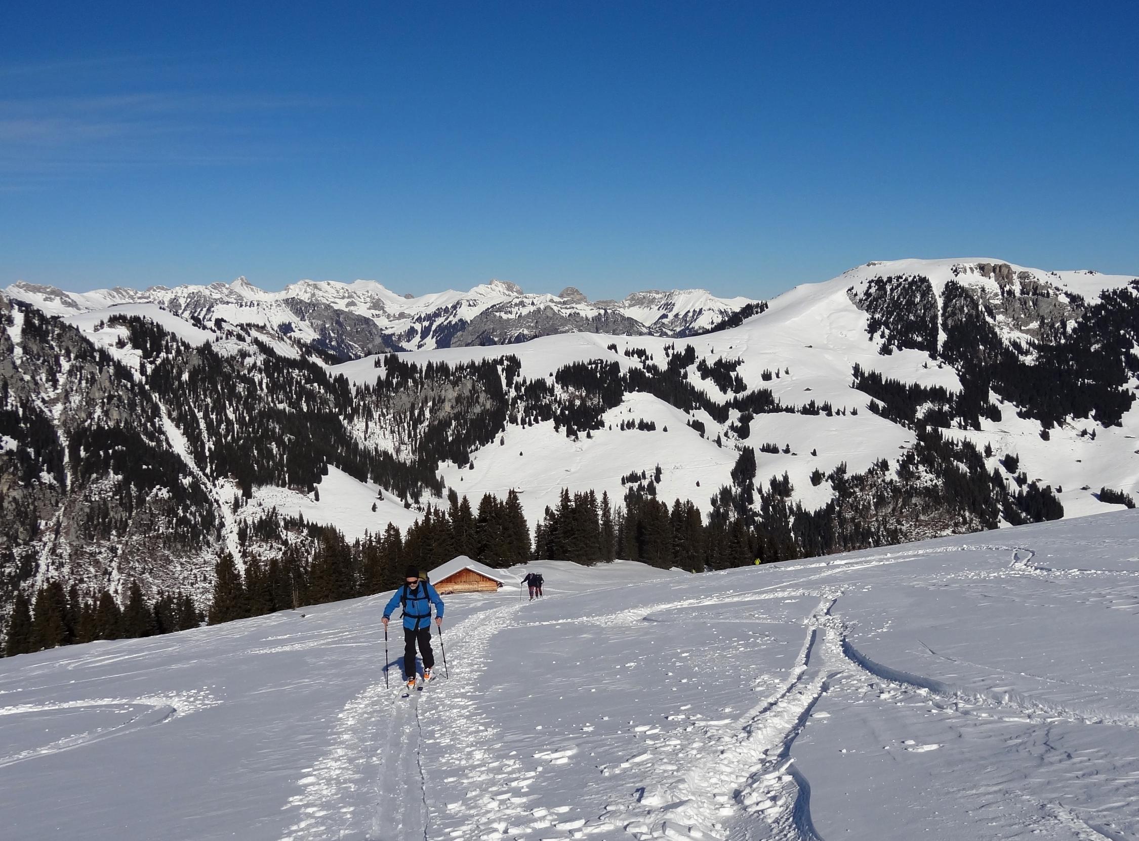 Meniggrat. Klein aber fein. Absolut keine Lawinengefahr, genügend, gut fahrbaren Schnee und ausreichende Steilheit. Die alten, verdeckten Spuren haben, bei zügiger Fahrweise, praktisch nicht gestört. Wir haben noch genügend Freiraum für eigene, freie Schwünge entdeckt. Wie sich der starke Föhn auswirken wird, weiss noch Niemand. Die ideale Tour für Anfänger. Auch als Halbtagestour sehr beliebt. Die Aussicht auf dem Gipfel kann auch sehr Verwöhnte begeistern.