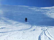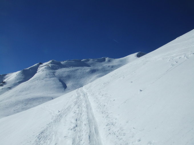 Gipfelhang gesetzter Pulver, allerdings schon ziemlich verfahren und die alten Spuren z.T hart.