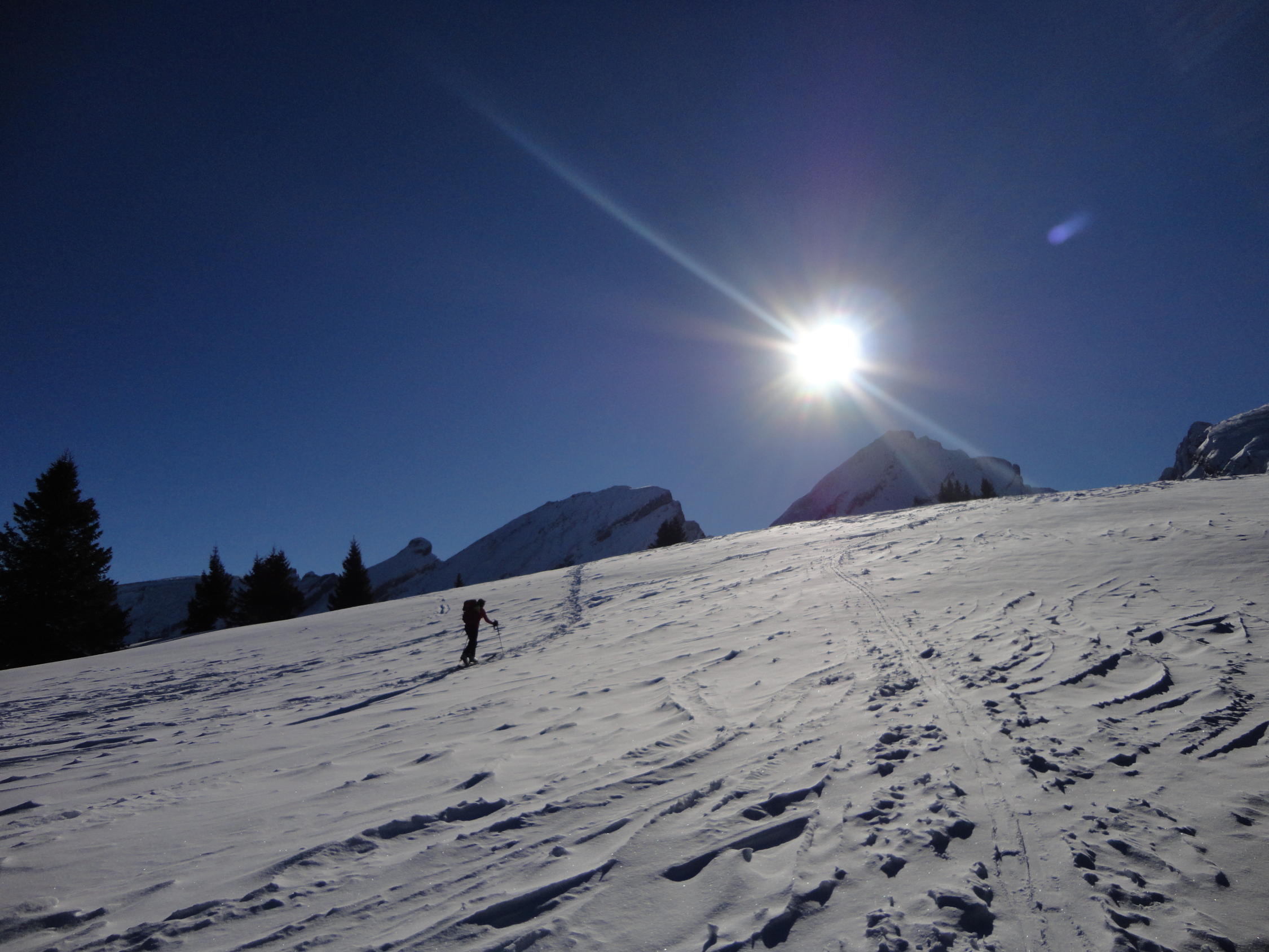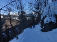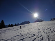 Gipfelhang ziemlich abgeblasen; Abfahrt in teils gedeckeltem, teils windgepresstem Schnee und öfter Graskontakt. Am Waldweg gute Pflugtechnik hilfreich (;-). Dafür Traumwetter, recht mild und trotz Föhnlage am Gipfel wenig Wind.