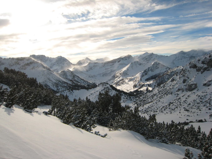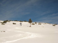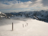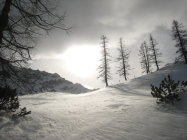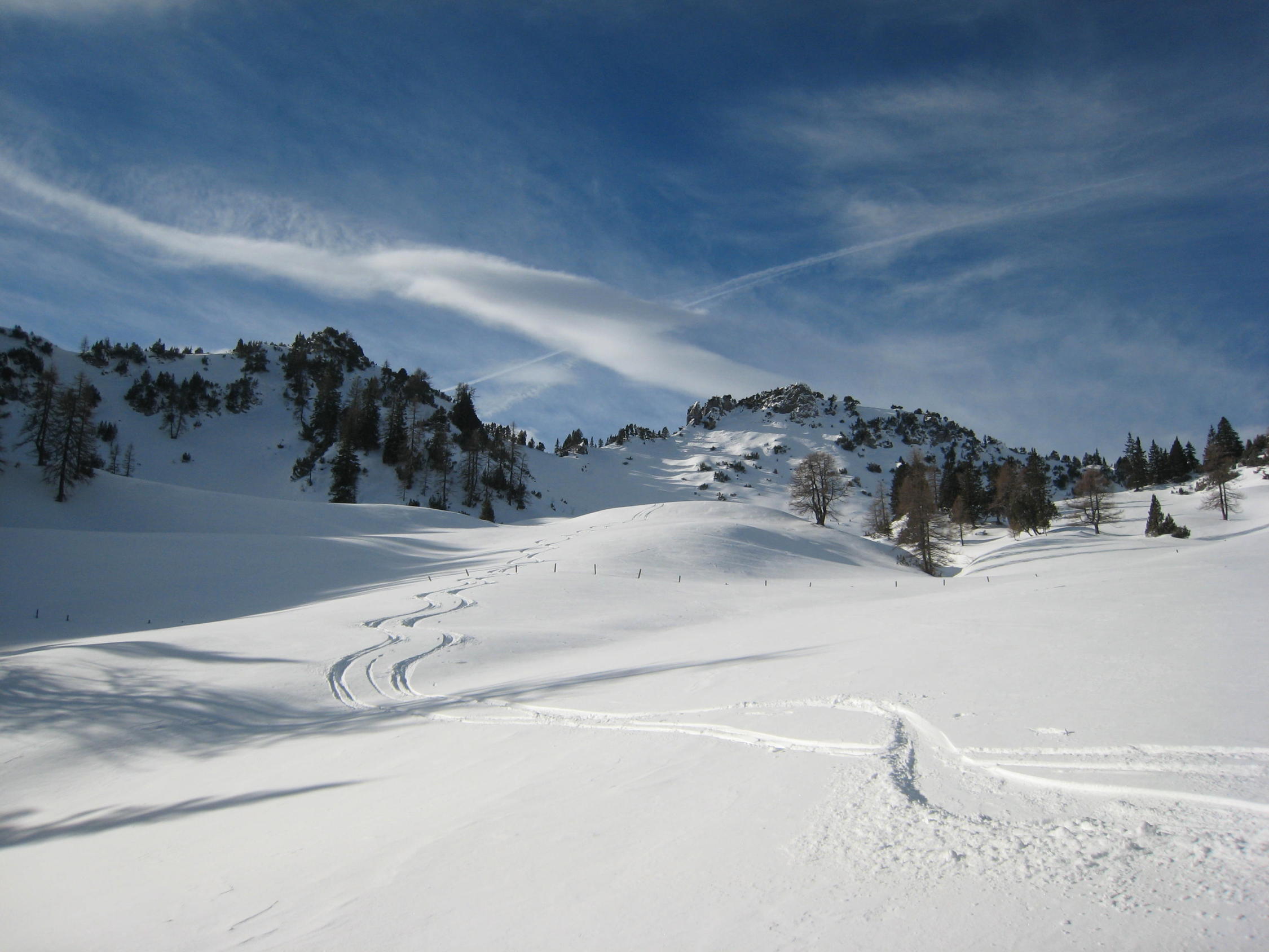 Es hatte ausreichend Schnee. Ziemlich harte Unterlage, darauf ein wenig Pulverschnee. Der Gipfelhang war etwas verblasen, dafür lohnte es sich, so weit es geht Richtung Guschg / Sautobel abzufahren, da wir dort noch schönen Pulverschnee fanden.