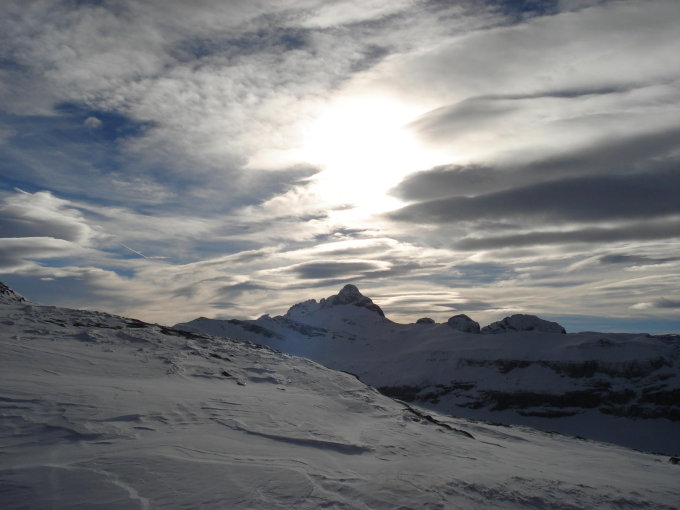 Nach Bäerensol sehr viel Pulverschnee da vom Föhn geschützt,ab Stöllen dann zunehmend auf dem Geländerücken Richtung Pfannenstock vom Föhn verblasen,bei Windgeschützten Stellen war der Pulverschnee vom letzten Schneefall noch vorhanden. Bei der Abfahrt viele versteckte Karrensteine Steinkontakt unumgenglich.Skidebot etwa auf 2450m.Dann noch kurzer Fussaufstieg leicht ausgesetzt den wir heute nicht machten.
