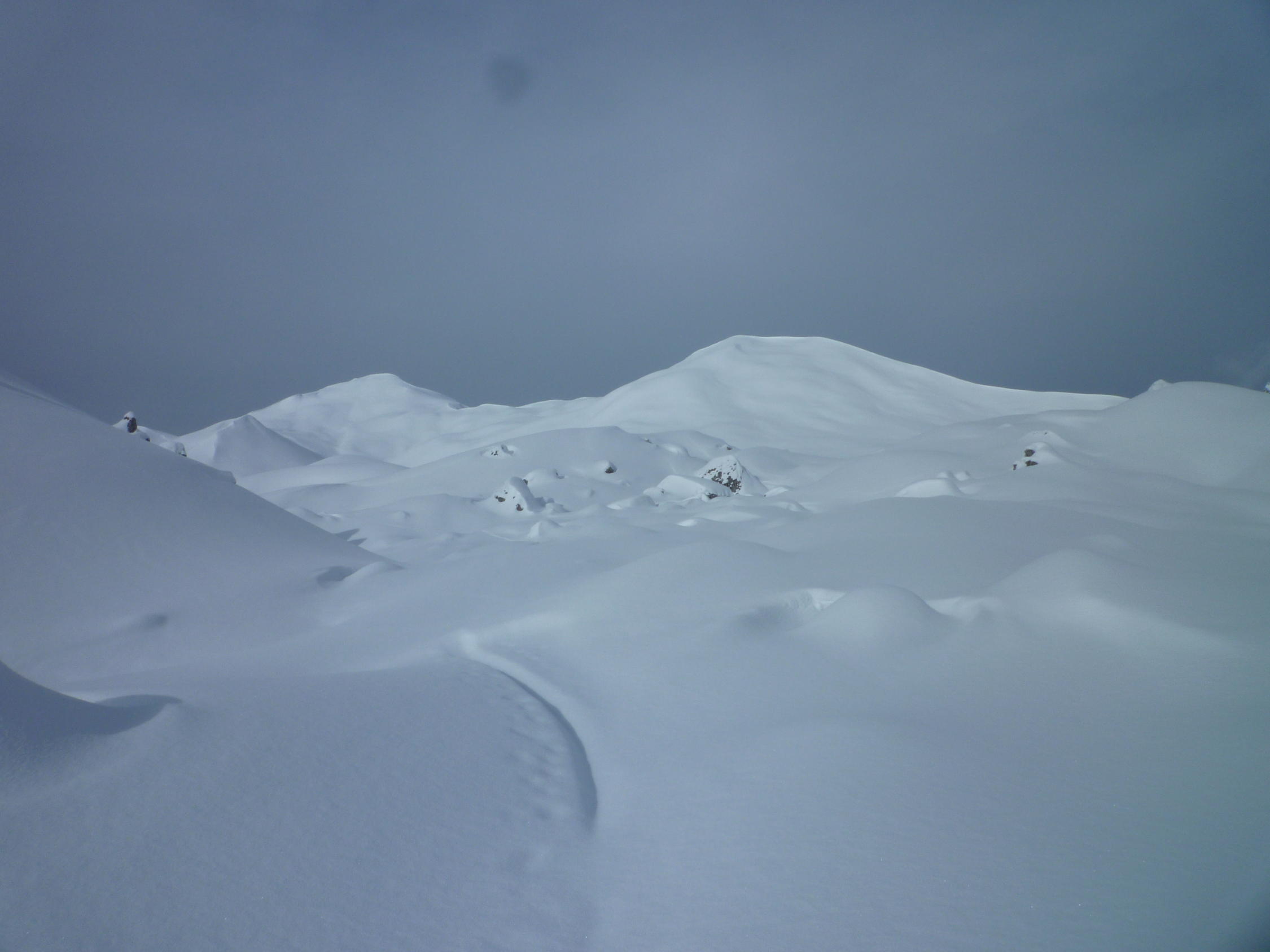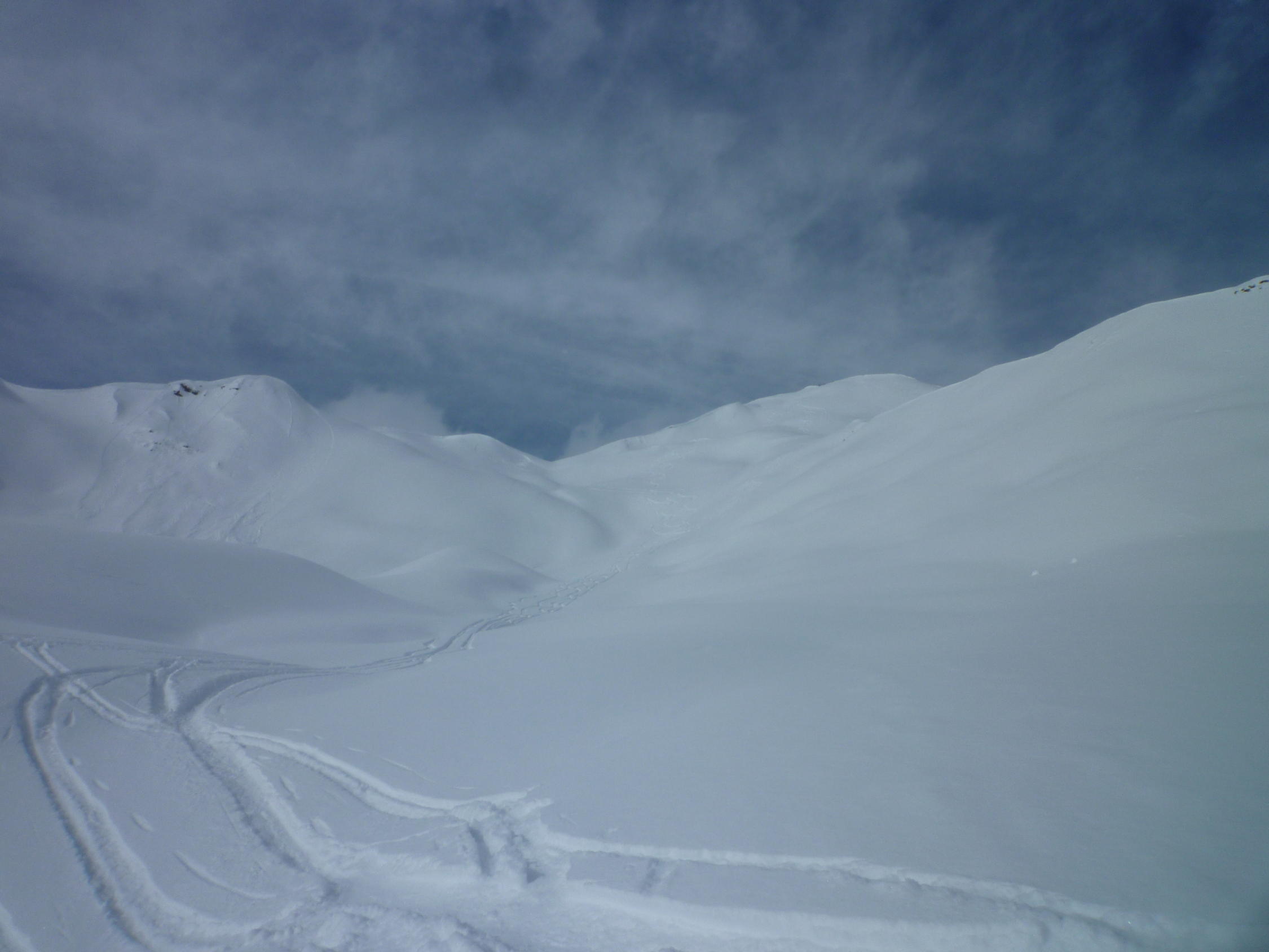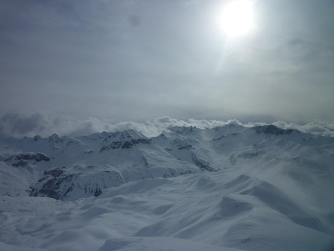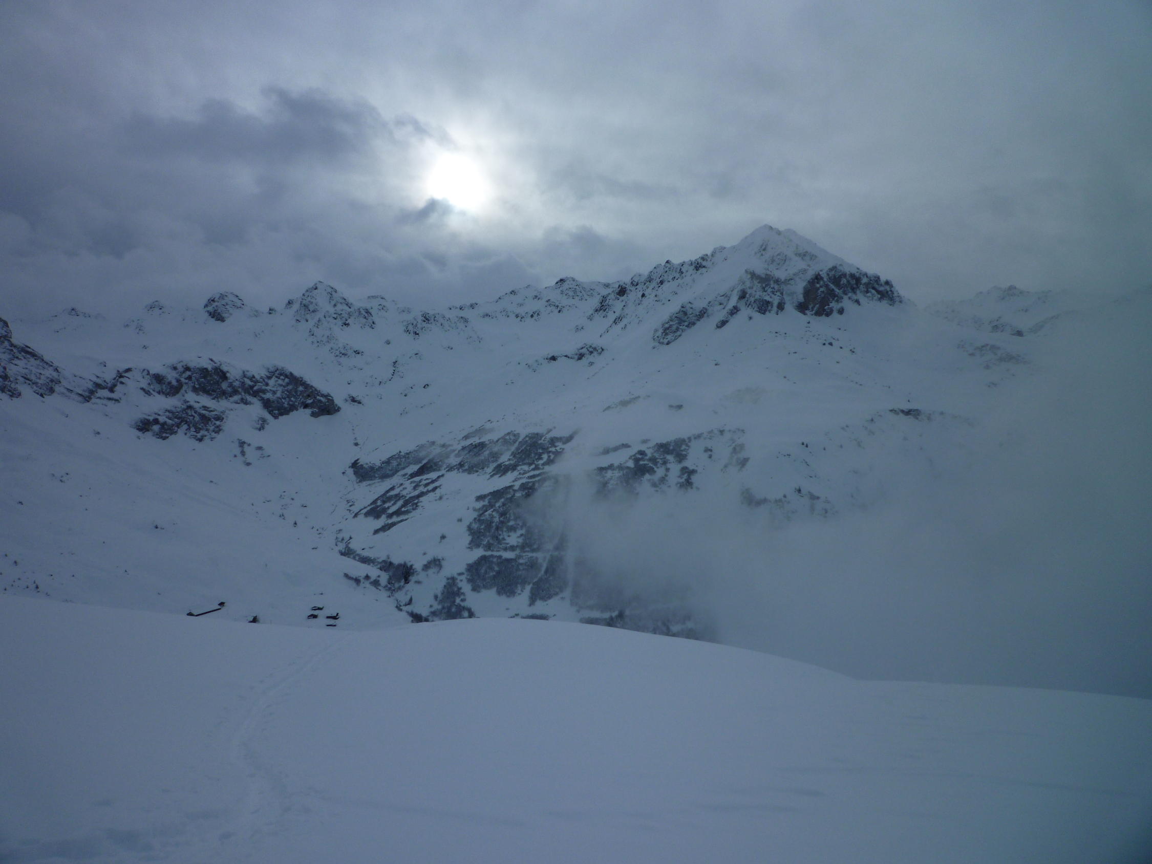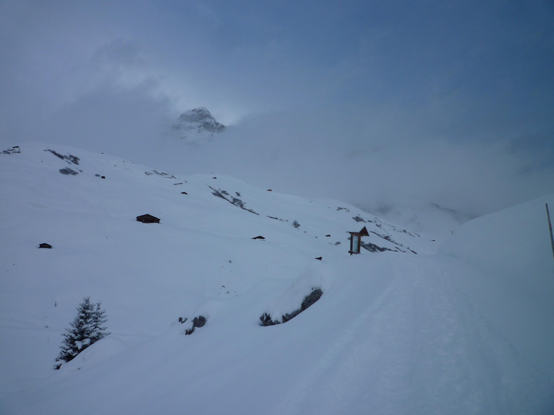 Ein leichter Wind am Gipfel, und ansonsten Pulver, gedämpfte Sonne durch den sehr leichten Hochnebel und eine perfkte Abfahrt ins Tal nach St. Antönien.